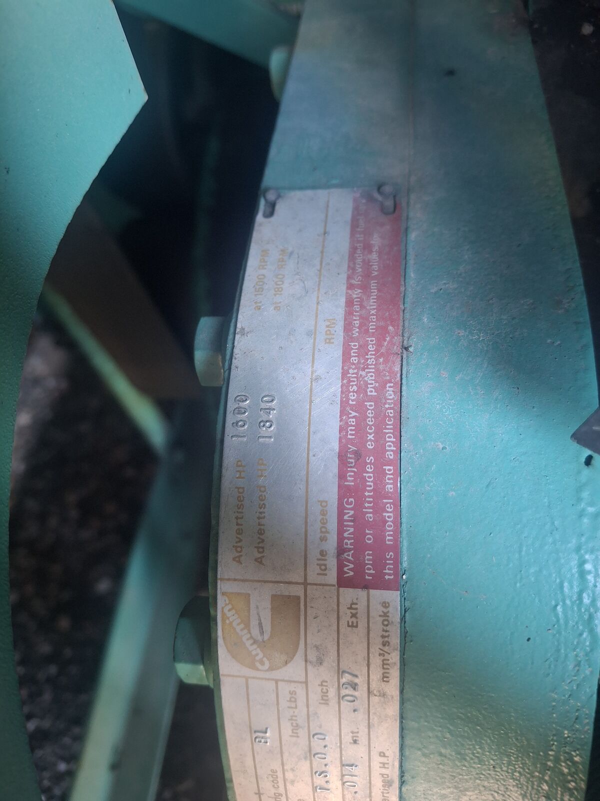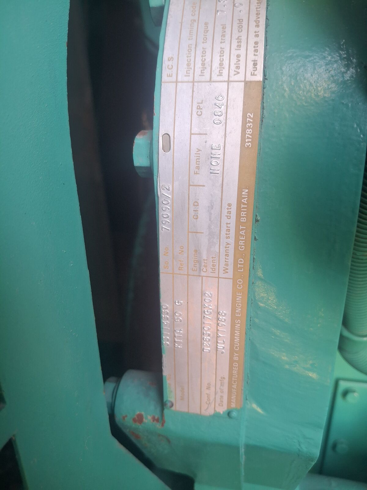 KTTA 50 g twin turbo 1840Hp 1250KW, 1562.5 KVA,continuous, 4160 volt, 60Hz, 1800rpm, 3 phase, 24 volt start, only 666.4 hours on machine, full enclosure and automatic fuel tank with float, block heater, 4 D batteries with heating pads this unit was recently load tested and is fully operational serviced and ready to go please call or text with any questions I have taken lots of videos of this unit running and can send them to you upon request this unit was owned by the temple and has been maticoulessly maintained and was only replaced because a bigger generator 2250kw was needed just a few weeks ago.