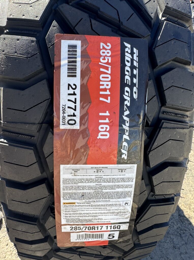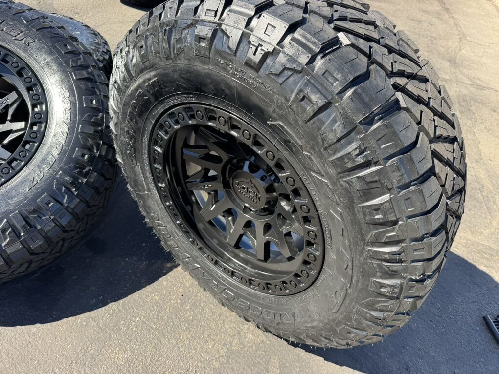 ApplePayBrand new package! On special! 17x9 -12et offset Lock Lunatic wheels Black finish mounted and balanced on 285/70r17 Nitto Ridge Grapplers. 6x5.5 bolt pattern (6x139.7). These fit Chevrolet Silverado 1500 GMC Sierra yukon tahoe Nissan Titan and Toyota Tacoma. HUGE Savings!