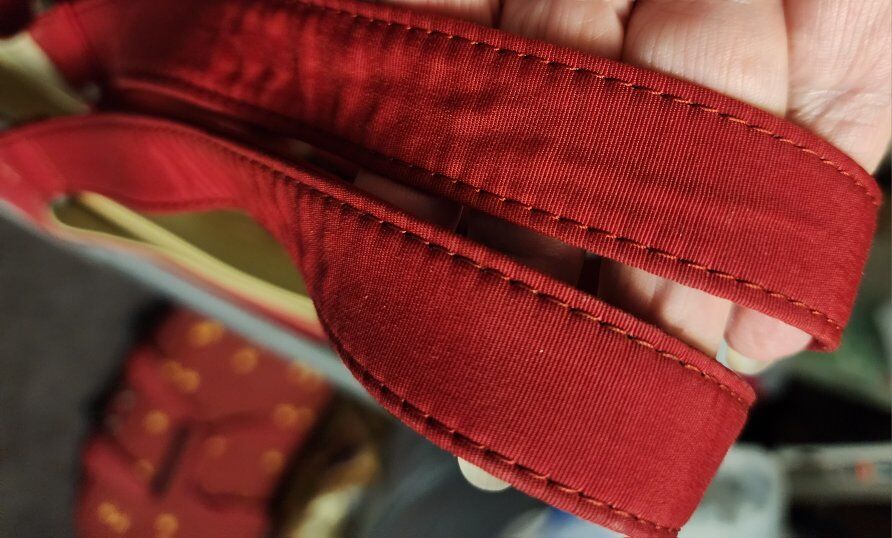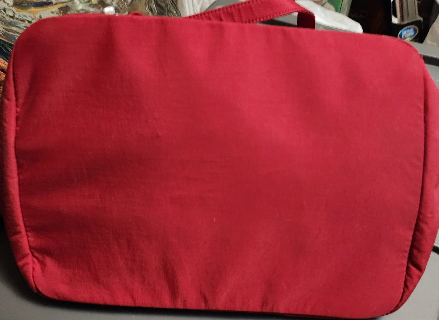 Strong durable canvas, for travel or everyday use. Multiple pockets and additional shoulder strap. Has zippered openings on back to accommodate carry-on suitcase handle. Appx 14" wide 6" across bottom. Unused