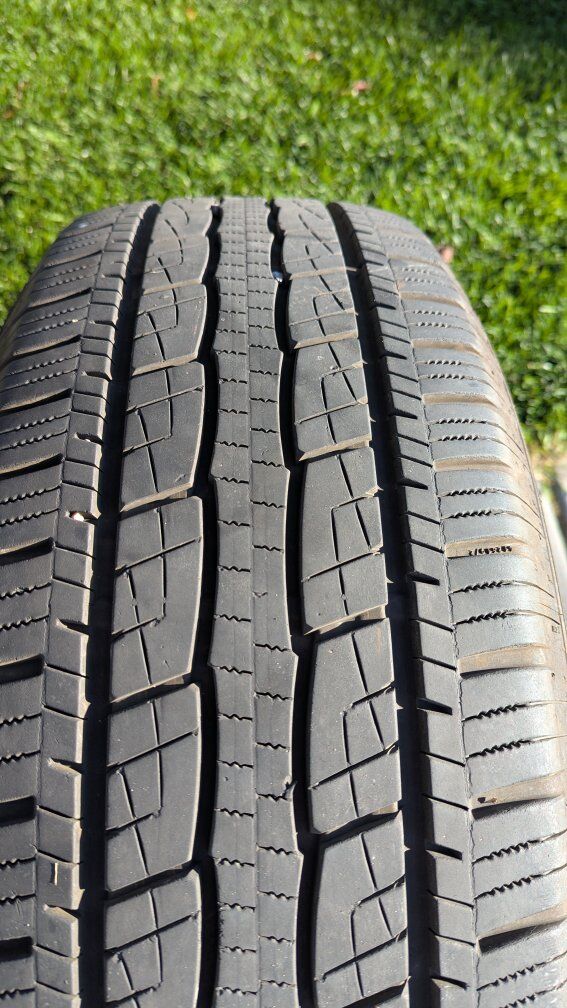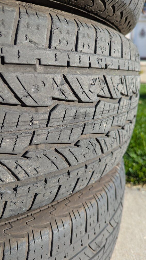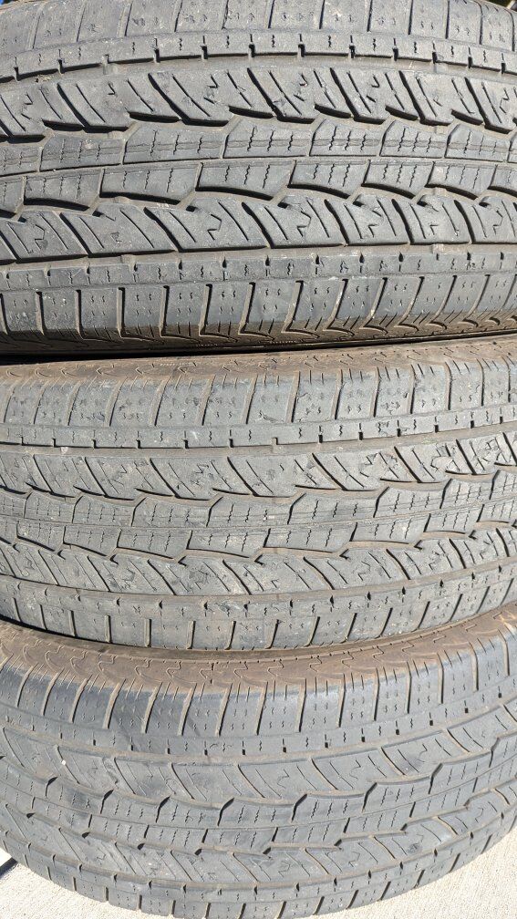 VenmoSet of four tires. One tire almost brand new, the other three mostly worn but still have some life left. Standard load rating. Each tire rated at 2,756 lb at Max pressure 44 PSI. Still good tires if you need something to just get by for a short time.