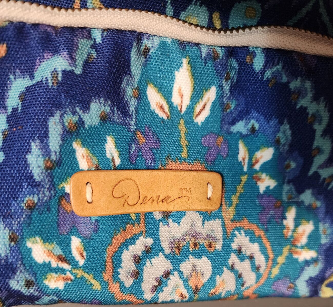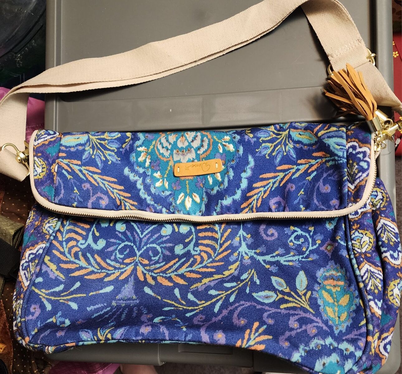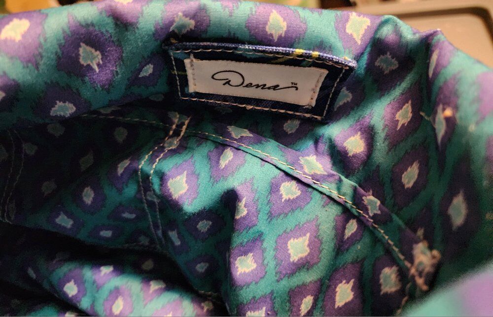 Zipper top opening and 2 outer zipper pockets. Leather tassels and accents. 15.5" x 10.5" x 5" folded Adjustable strap. Unused