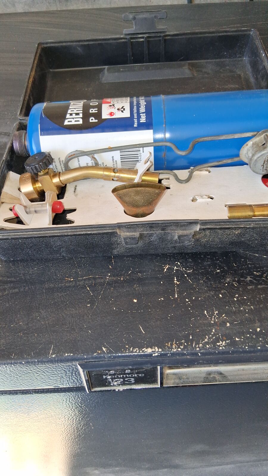 ZelleBERNEZ-O-MATIC, PROPANE FULL TANK WITH ATTACHMENTS AND CARRYING CASE.