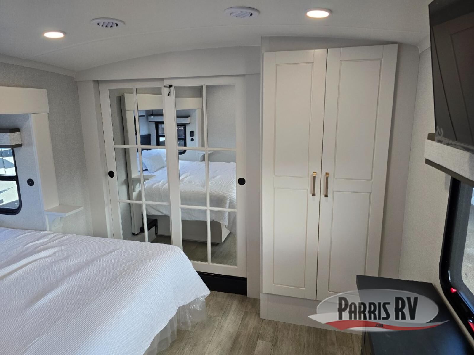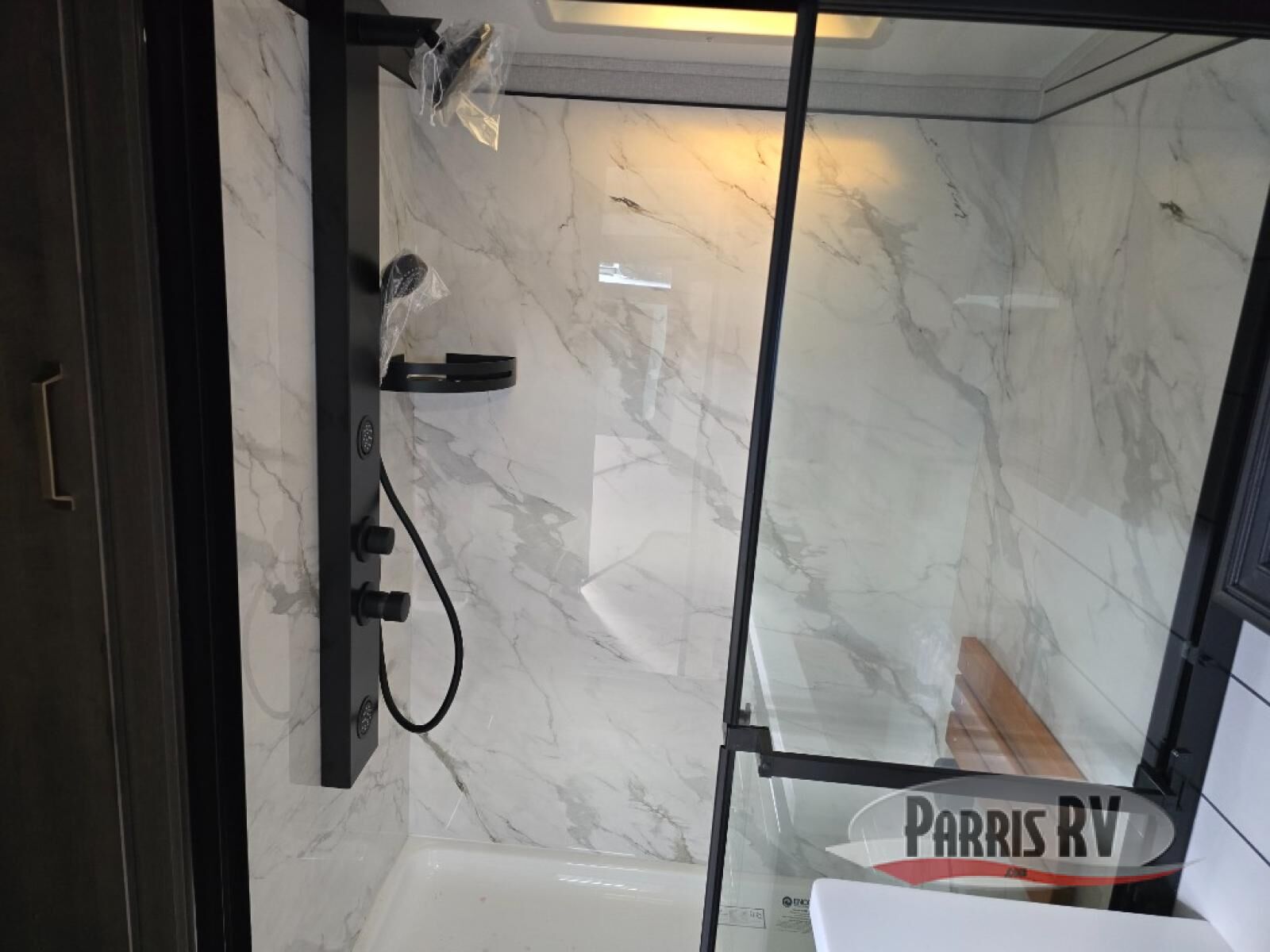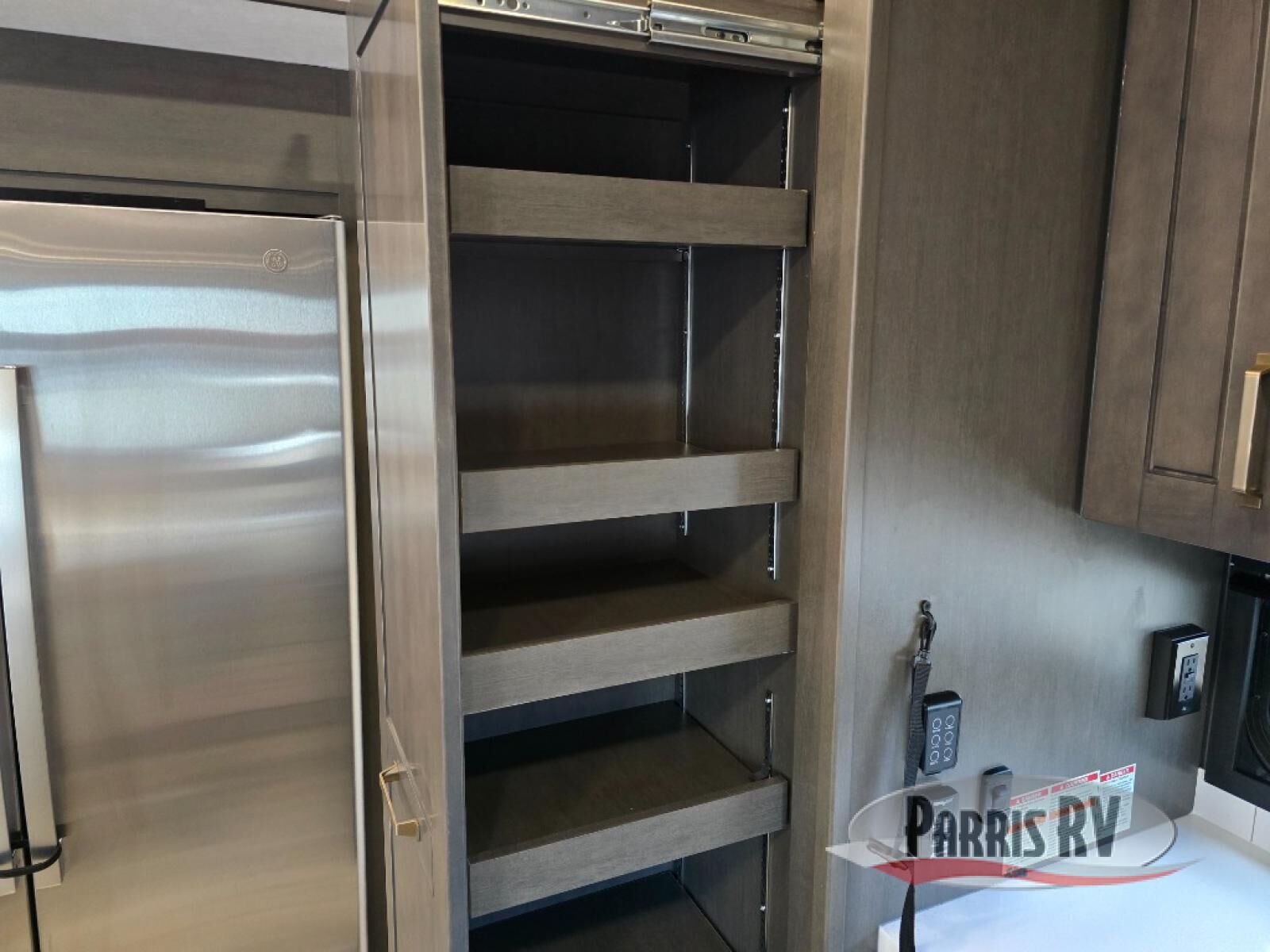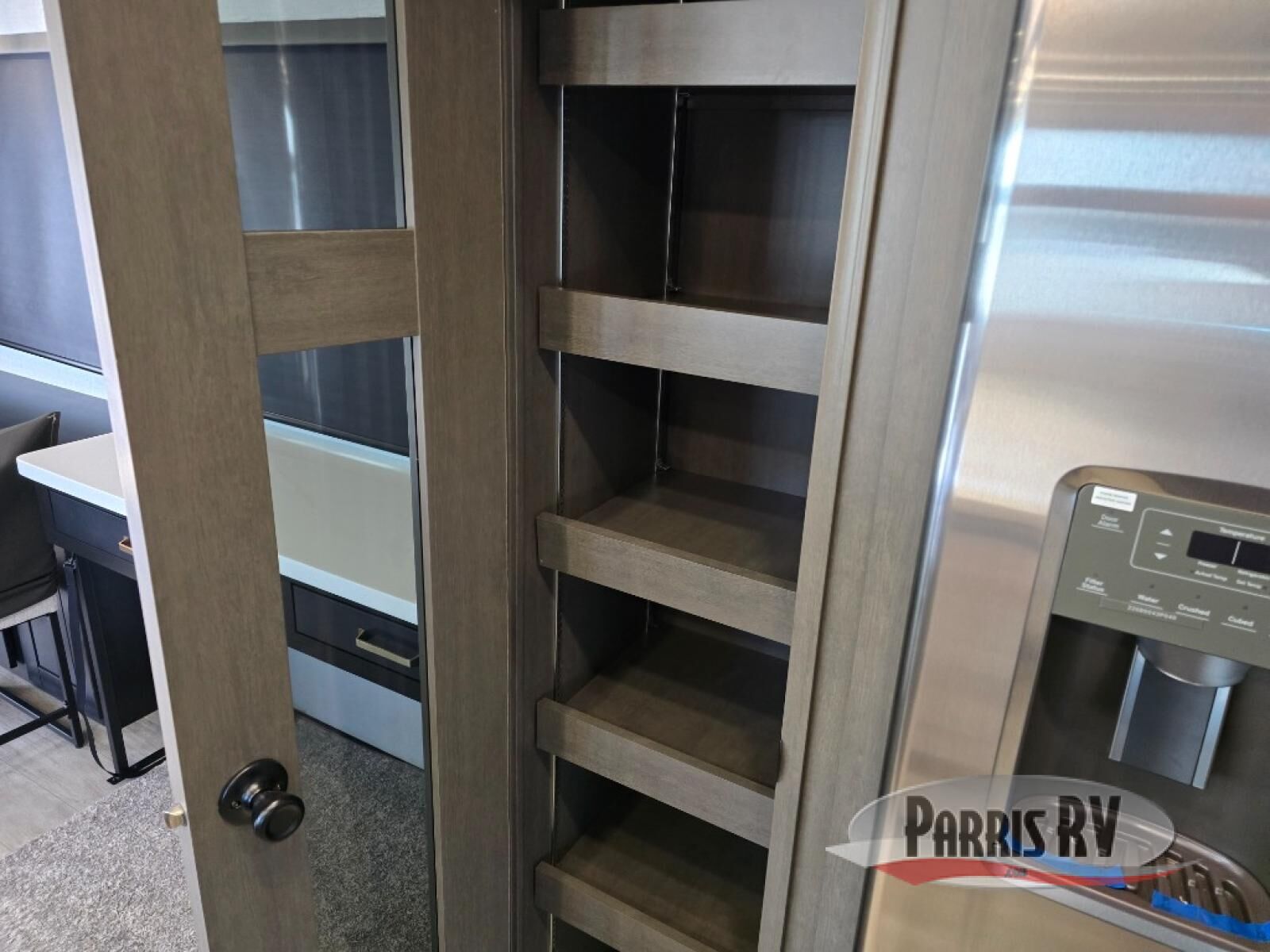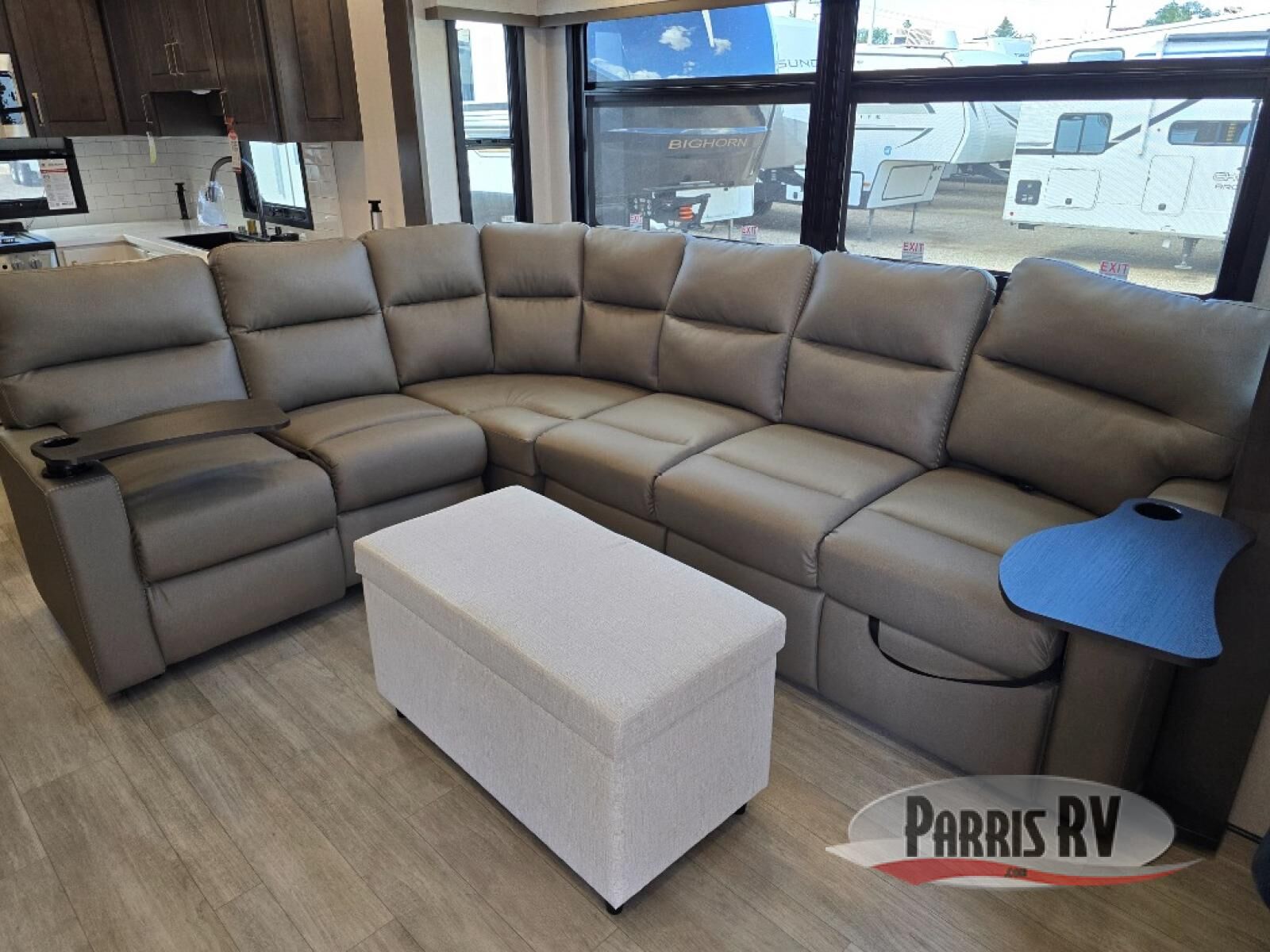 At the front of the 36RK model we have the spacious bedroom featuring a luxurious 72" x 80" king bed, providing ample room to relax and unwind after a long day. A wardrobe and dresser, complete with a TV mounted above, offer generous storage for clothing and personal essentials. Moving down the hall, the full bathroom includes a large 36" x 48" shower with a built-in seat for added comfort, as well as a linen closet for convenient storage. Toward the center and rear of the unit, the open living area expands with dual opposing slides, creating an inviting and comfortable space. One slide houses a 100" L-shaped sofa and theater seating across from the entertainment center with a cozy fireplace, perfect for relaxing evenings. The opposite slide features a pull-out table ideal for dining or game nights, alongside a versatile desk and coffee bar. This same slide also includes a 21-cu. ft. residential refrigerator and a shelved pantry for effortless organization. At the very rear, the U-shaped kitchen is designed for function and style, boasting solid-surface countertops, abundant overhead cabinets, a pull-out pantry, and a pull-out cutting board making meal prep, cooking, and snacking both easy and enjoyable.