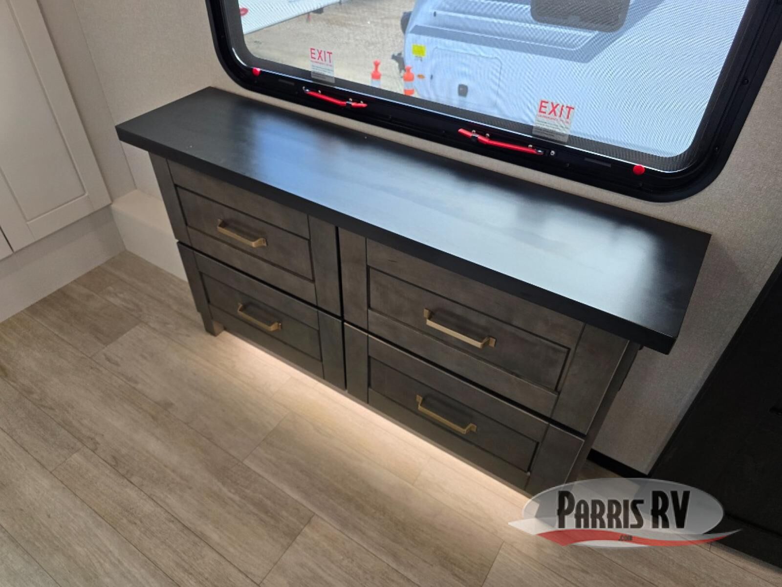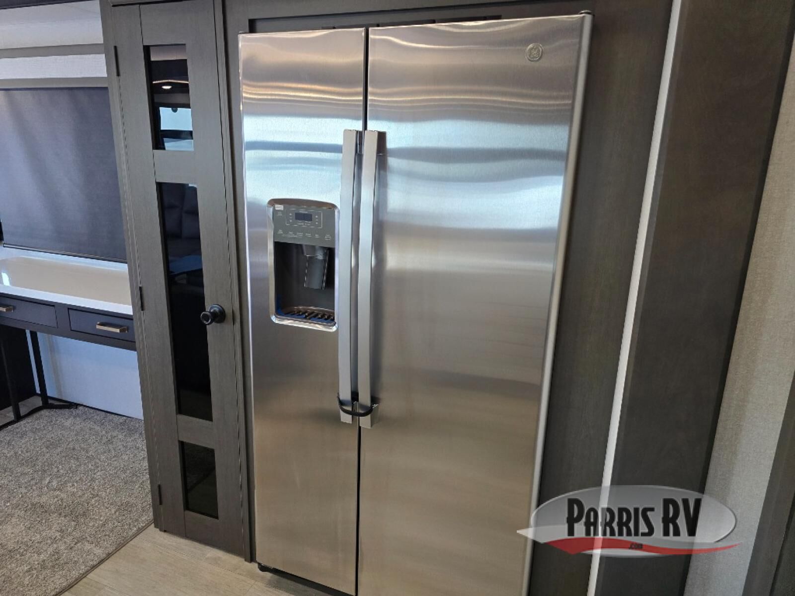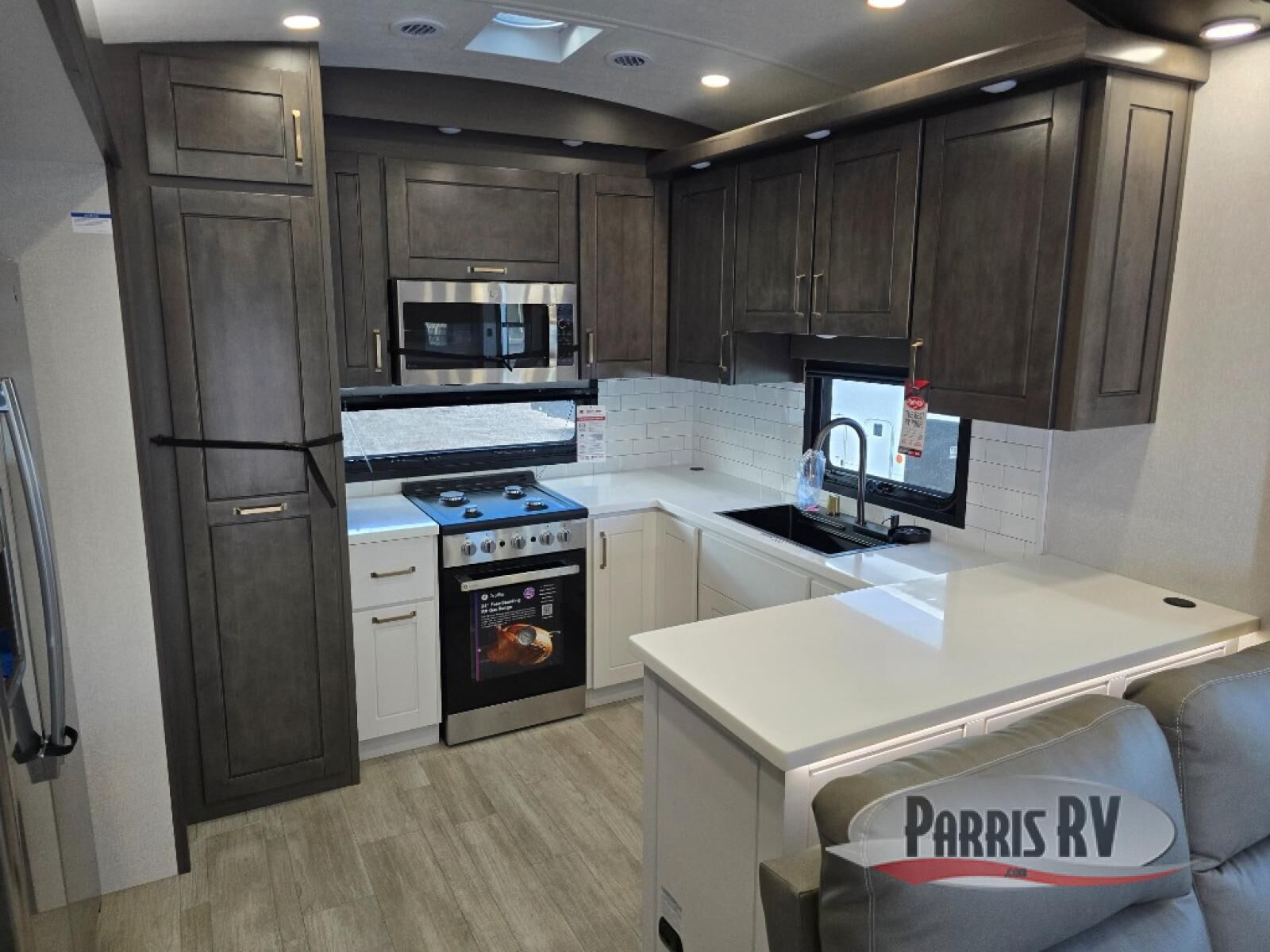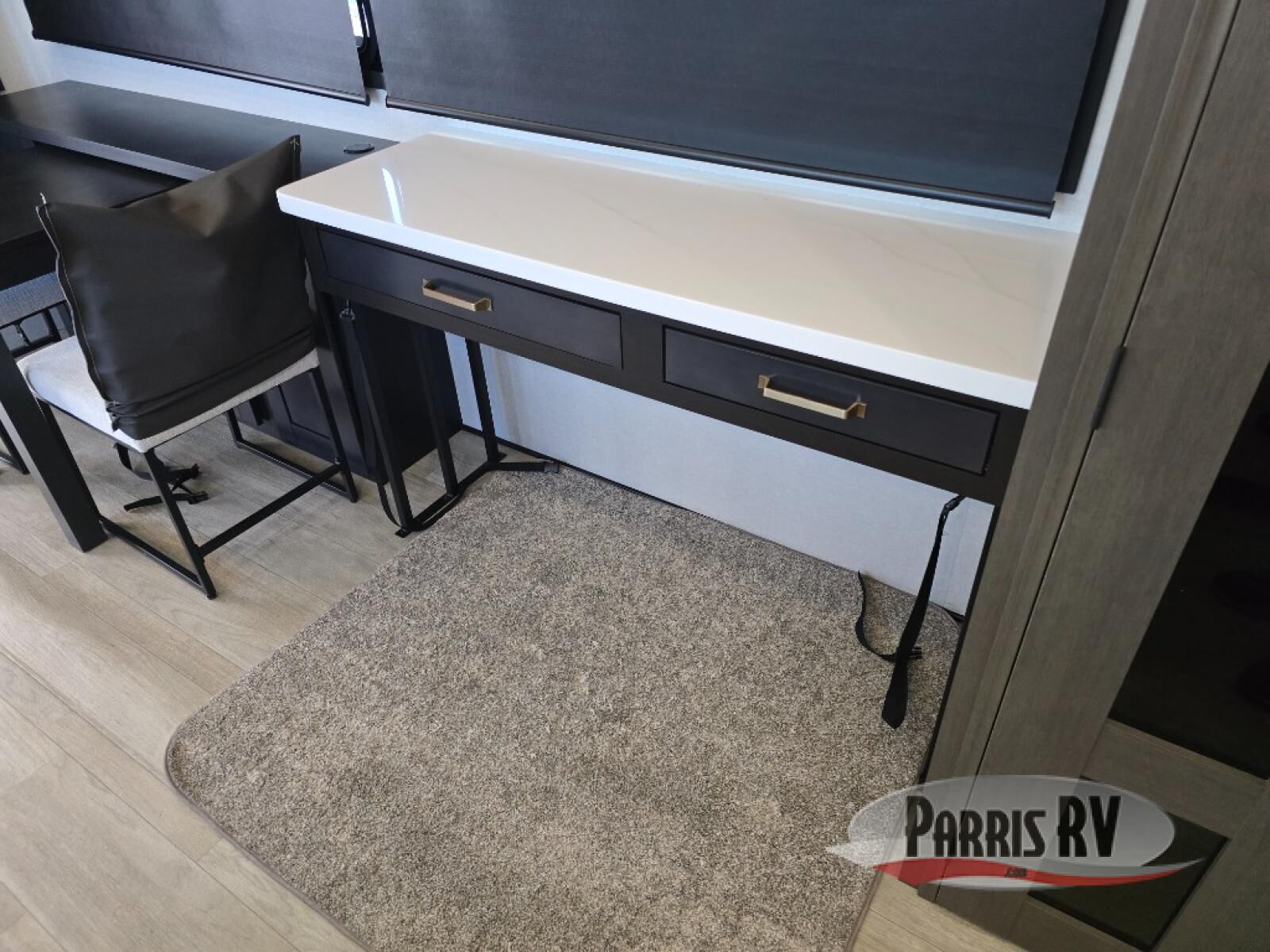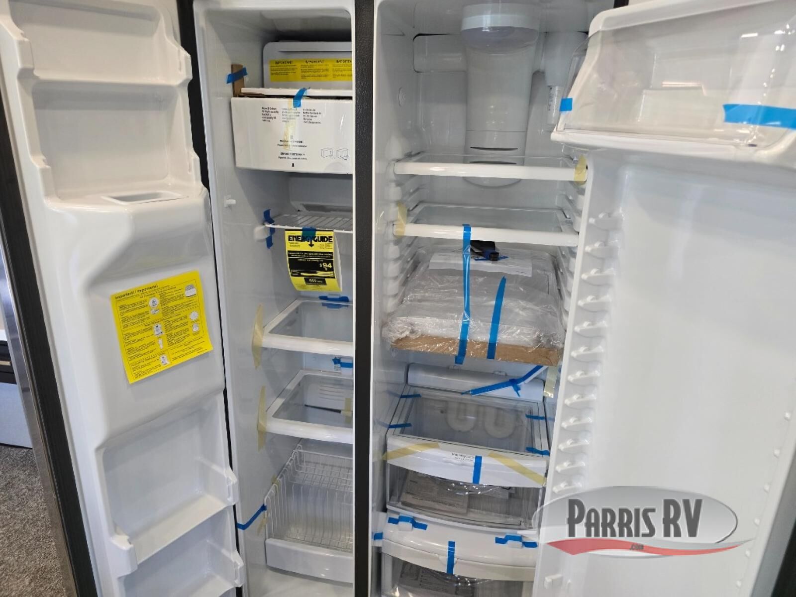 At the front of the 36RK model we have the spacious bedroom featuring a luxurious 72" x 80" king bed, providing ample room to relax and unwind after a long day. A wardrobe and dresser, complete with a TV mounted above, offer generous storage for clothing and personal essentials. Moving down the hall, the full bathroom includes a large 36" x 48" shower with a built-in seat for added comfort, as well as a linen closet for convenient storage. Toward the center and rear of the unit, the open living area expands with dual opposing slides, creating an inviting and comfortable space. One slide houses a 100" L-shaped sofa and theater seating across from the entertainment center with a cozy fireplace, perfect for relaxing evenings. The opposite slide features a pull-out table ideal for dining or game nights, alongside a versatile desk and coffee bar. This same slide also includes a 21-cu. ft. residential refrigerator and a shelved pantry for effortless organization. At the very rear, the U-shaped kitchen is designed for function and style, boasting solid-surface countertops, abundant overhead cabinets, a pull-out pantry, and a pull-out cutting board making meal prep, cooking, and snacking both easy and enjoyable.