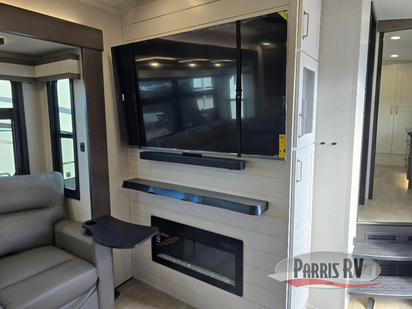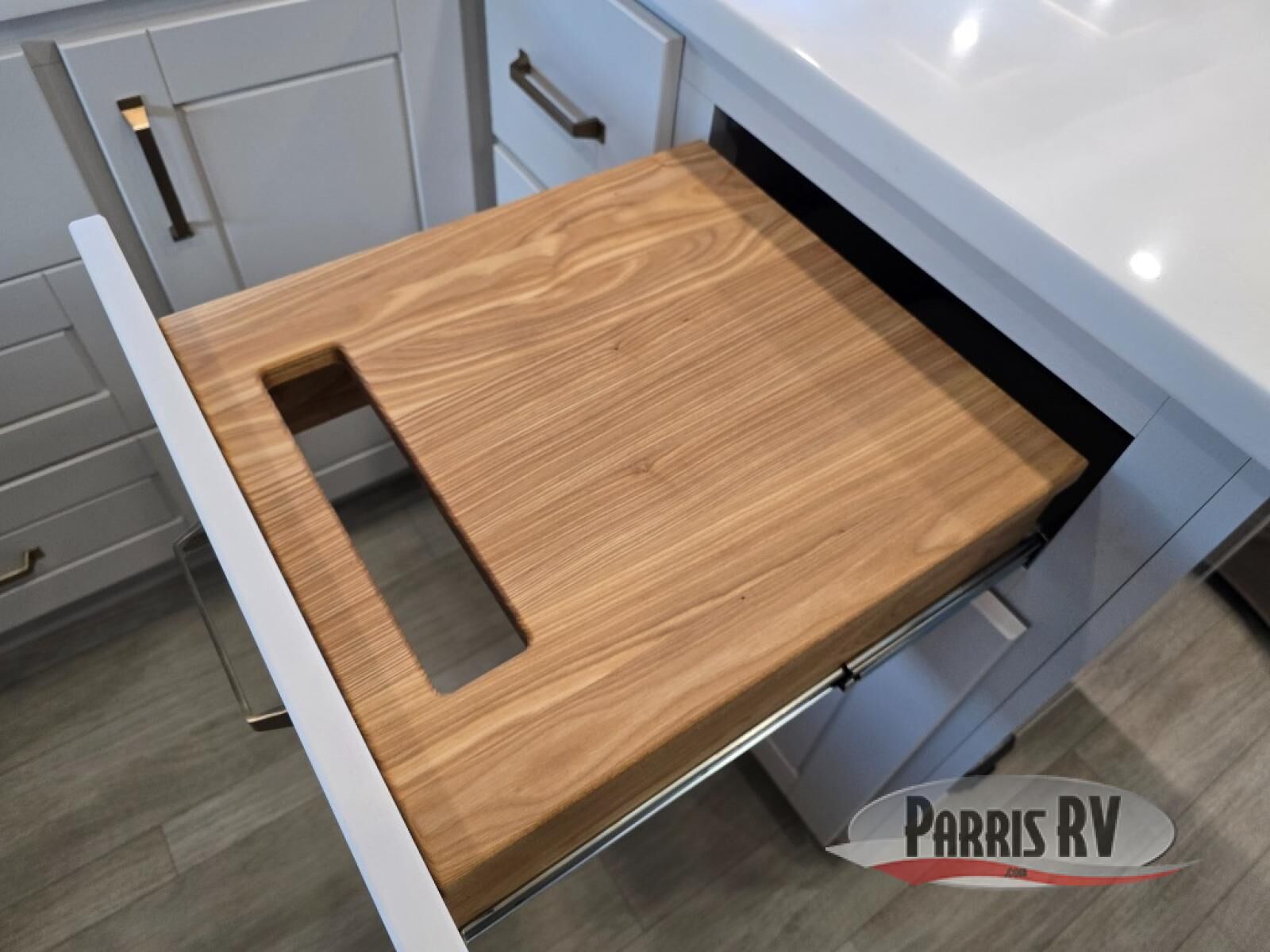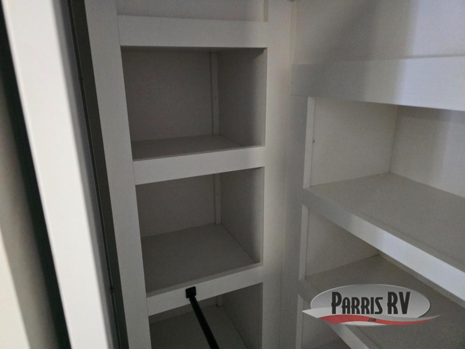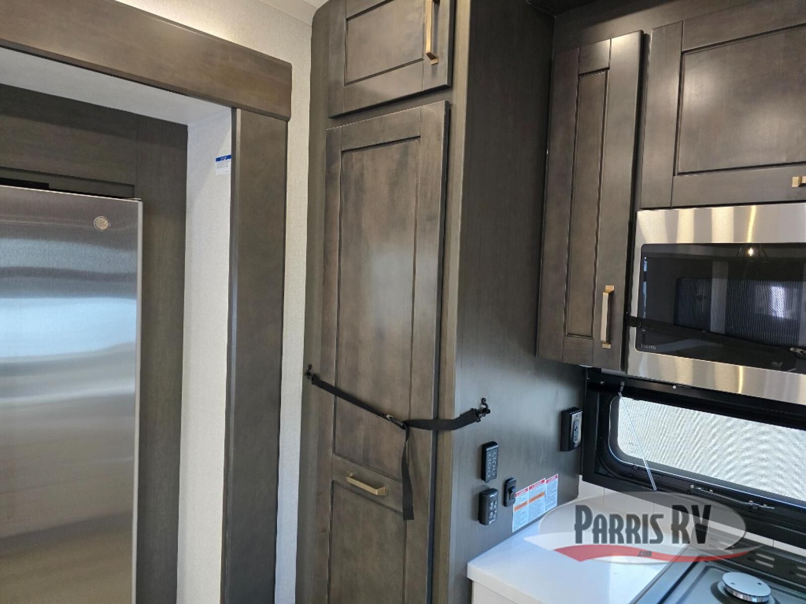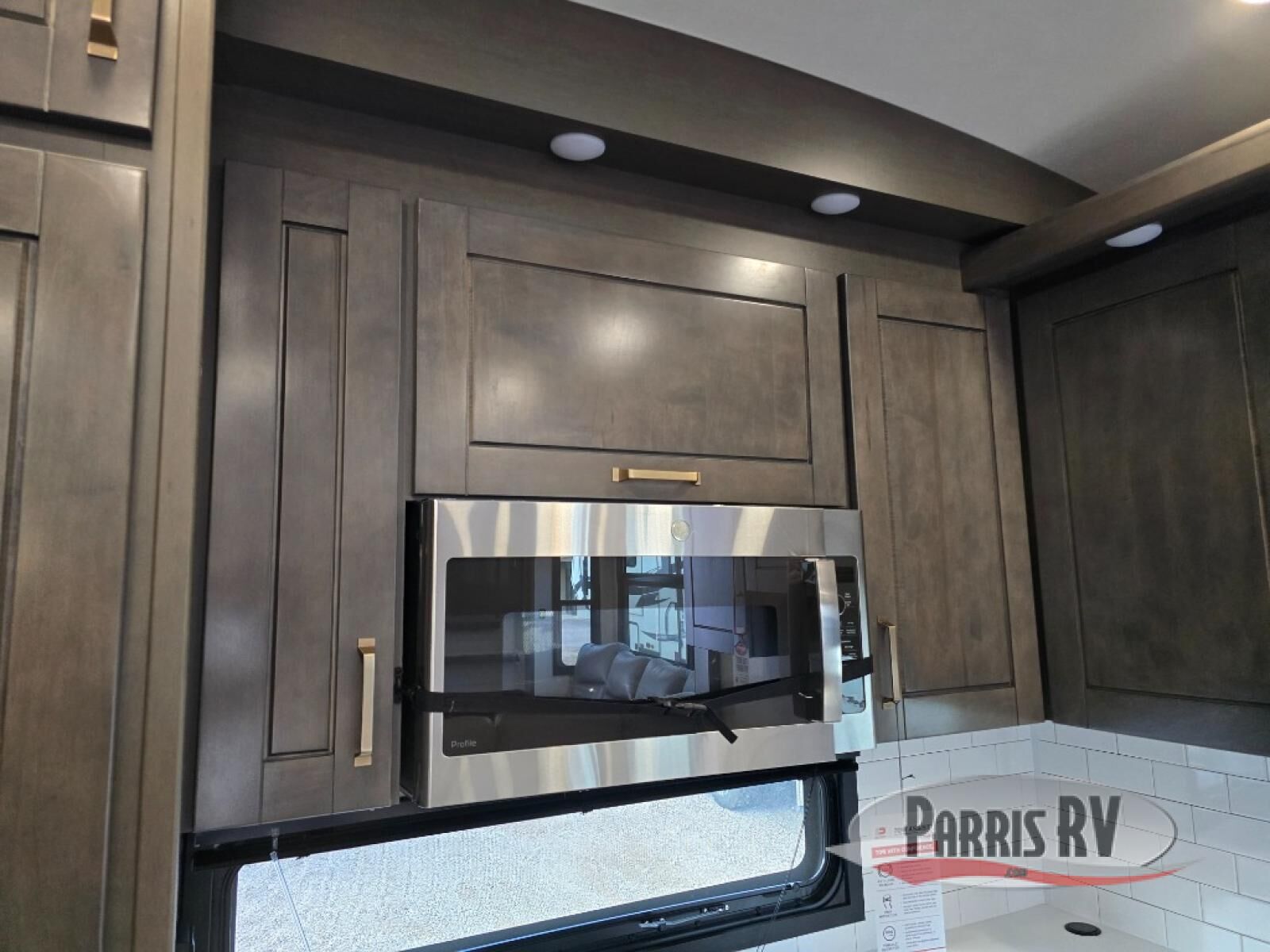 At the front of the 36RK model we have the spacious bedroom featuring a luxurious 72" x 80" king bed, providing ample room to relax and unwind after a long day. A wardrobe and dresser, complete with a TV mounted above, offer generous storage for clothing and personal essentials. Moving down the hall, the full bathroom includes a large 36" x 48" shower with a built-in seat for added comfort, as well as a linen closet for convenient storage. Toward the center and rear of the unit, the open living area expands with dual opposing slides, creating an inviting and comfortable space. One slide houses a 100" L-shaped sofa and theater seating across from the entertainment center with a cozy fireplace, perfect for relaxing evenings. The opposite slide features a pull-out table ideal for dining or game nights, alongside a versatile desk and coffee bar. This same slide also includes a 21-cu. ft. residential refrigerator and a shelved pantry for effortless organization. At the very rear, the U-shaped kitchen is designed for function and style, boasting solid-surface countertops, abundant overhead cabinets, a pull-out pantry, and a pull-out cutting board making meal prep, cooking, and snacking both easy and enjoyable.