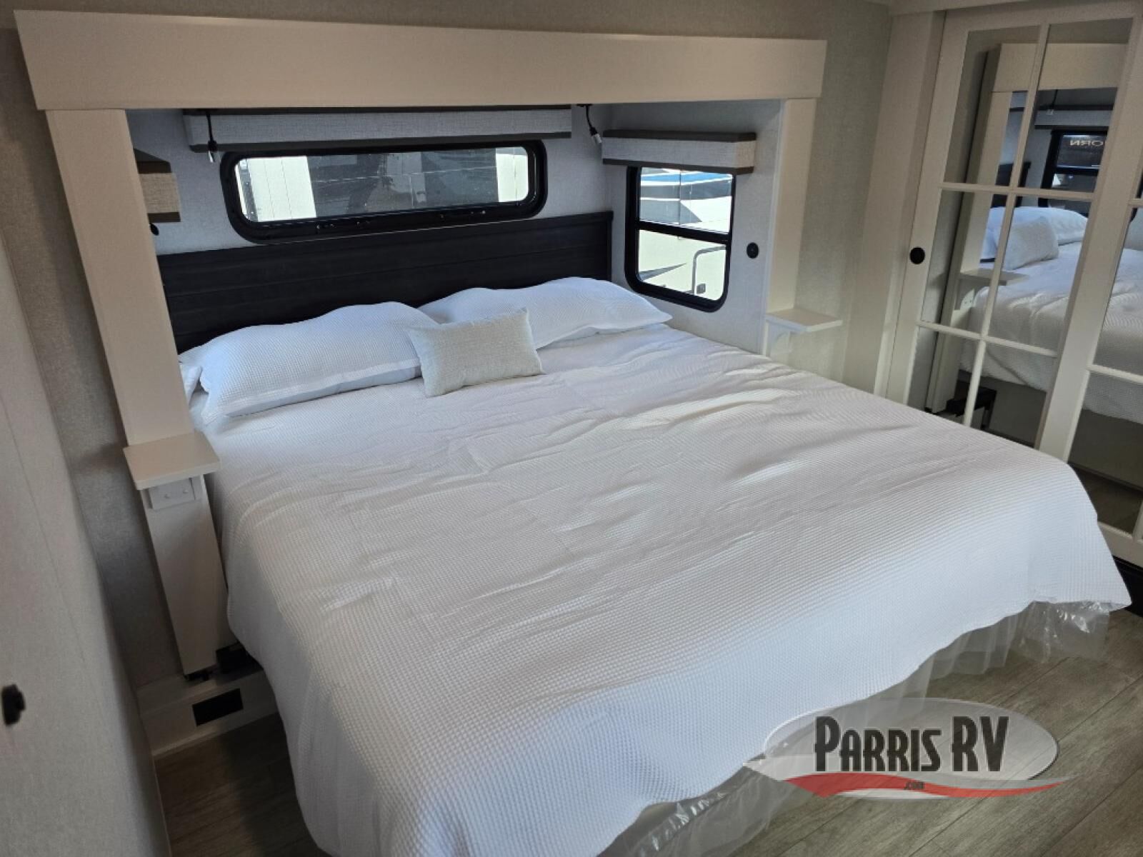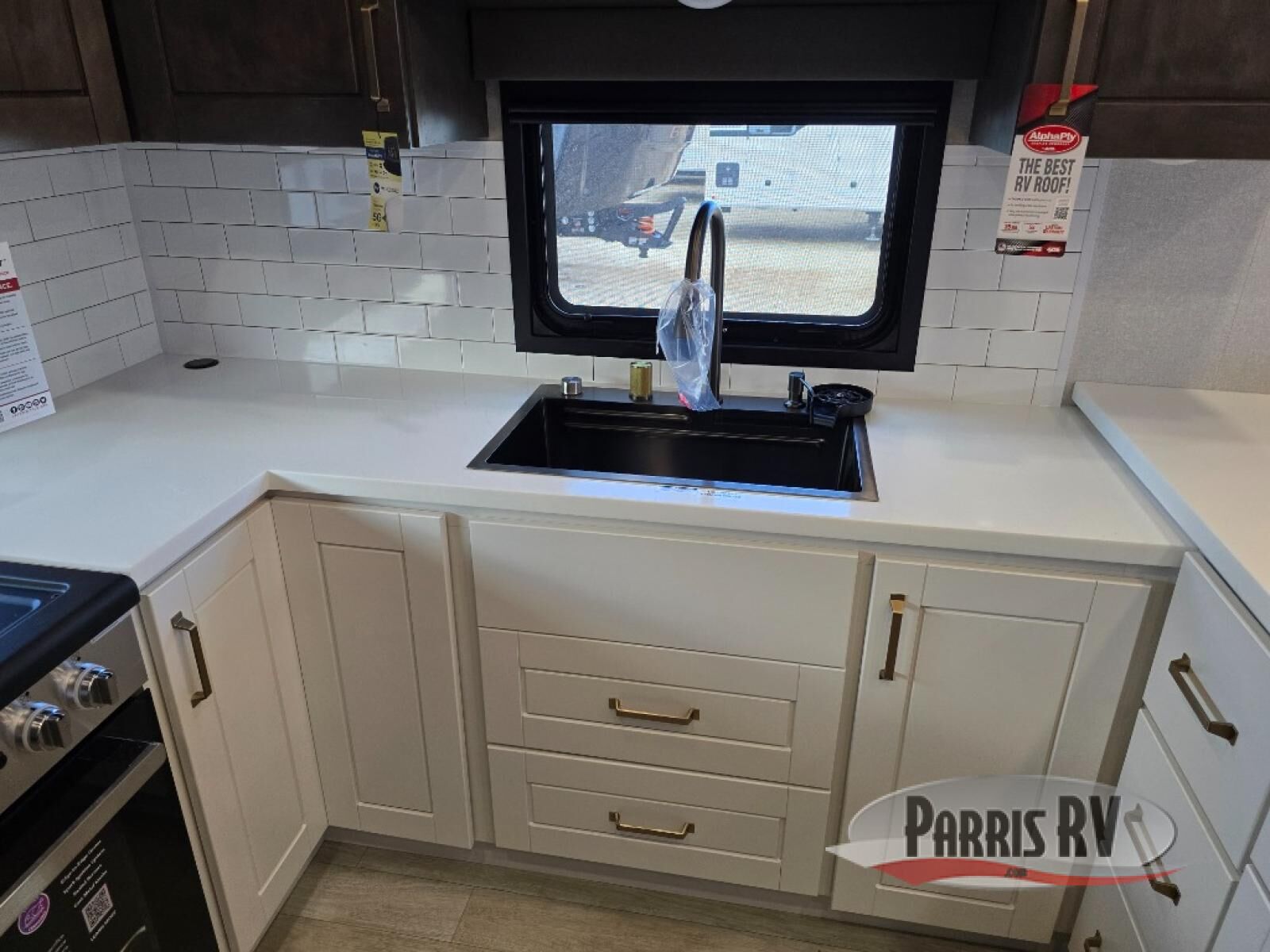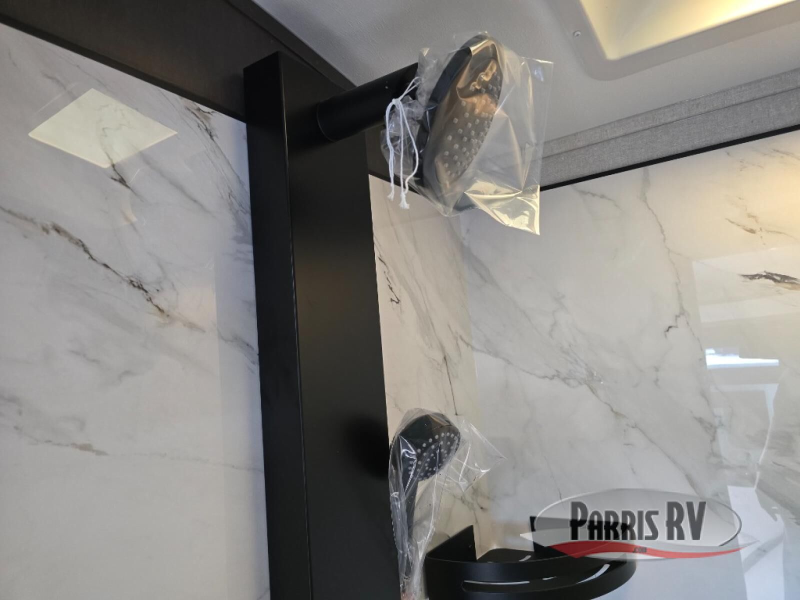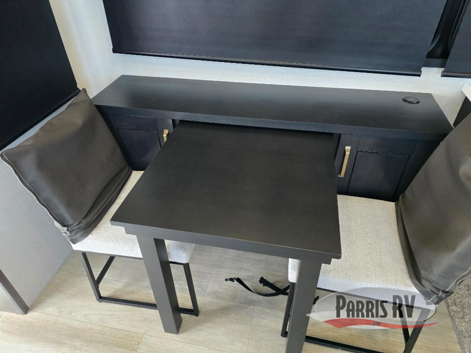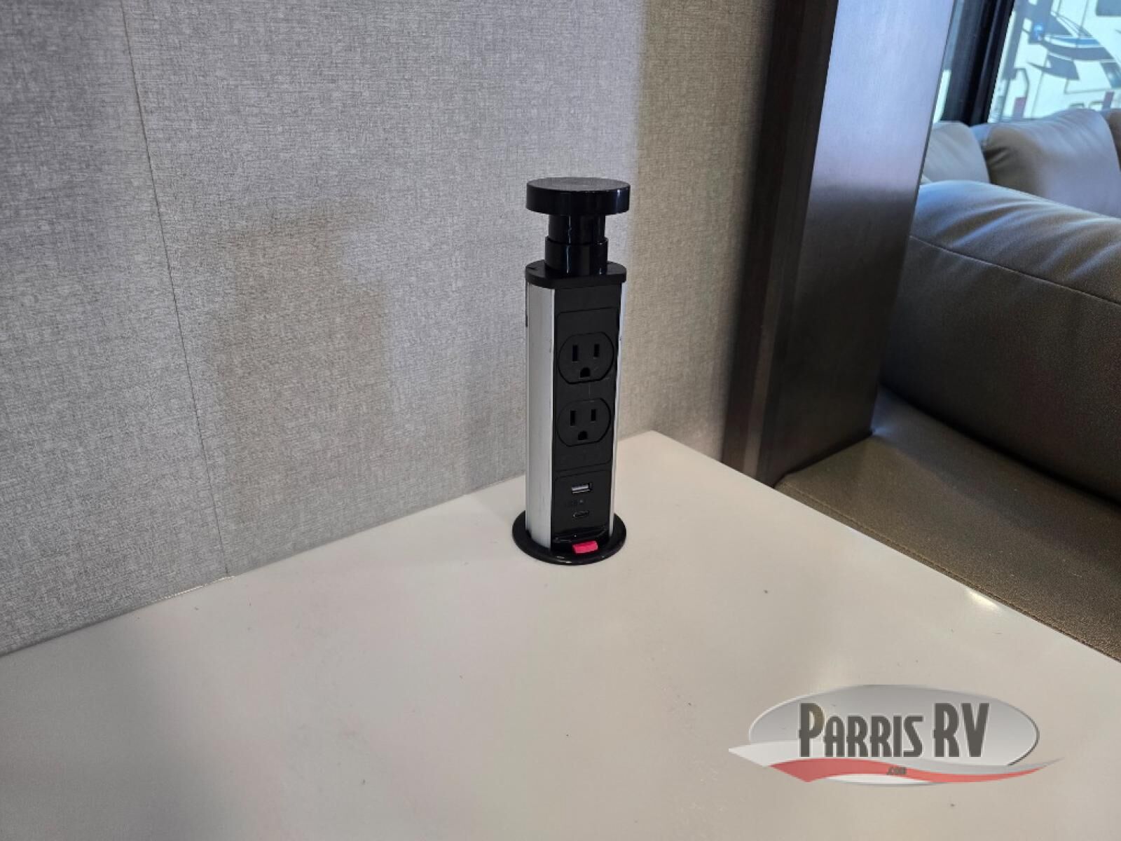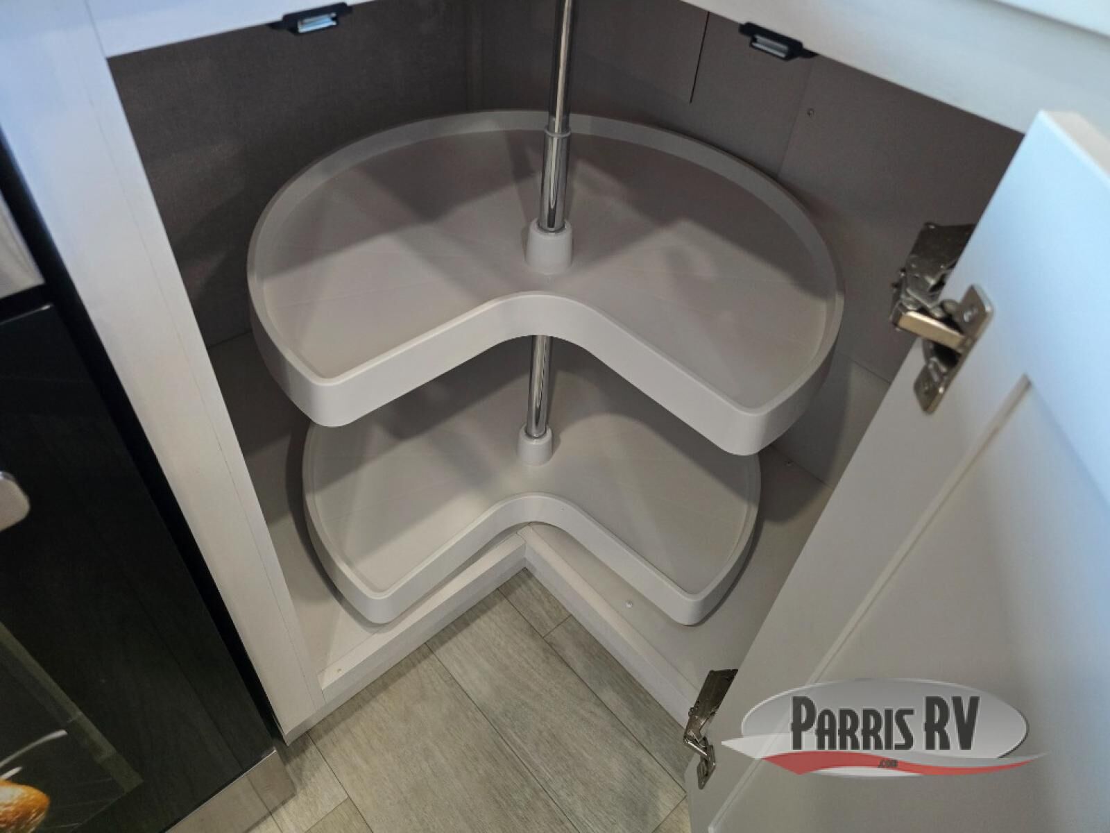 At the front of the 36RK model we have the spacious bedroom featuring a luxurious 72" x 80" king bed, providing ample room to relax and unwind after a long day. A wardrobe and dresser, complete with a TV mounted above, offer generous storage for clothing and personal essentials. Moving down the hall, the full bathroom includes a large 36" x 48" shower with a built-in seat for added comfort, as well as a linen closet for convenient storage. Toward the center and rear of the unit, the open living area expands with dual opposing slides, creating an inviting and comfortable space. One slide houses a 100" L-shaped sofa and theater seating across from the entertainment center with a cozy fireplace, perfect for relaxing evenings. The opposite slide features a pull-out table ideal for dining or game nights, alongside a versatile desk and coffee bar. This same slide also includes a 21-cu. ft. residential refrigerator and a shelved pantry for effortless organization. At the very rear, the U-shaped kitchen is designed for function and style, boasting solid-surface countertops, abundant overhead cabinets, a pull-out pantry, and a pull-out cutting board making meal prep, cooking, and snacking both easy and enjoyable.