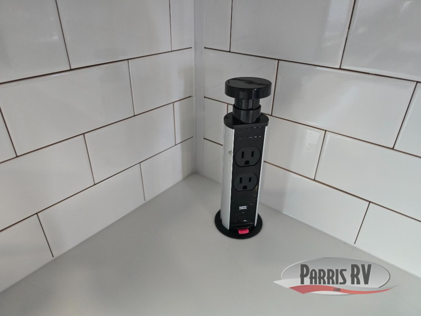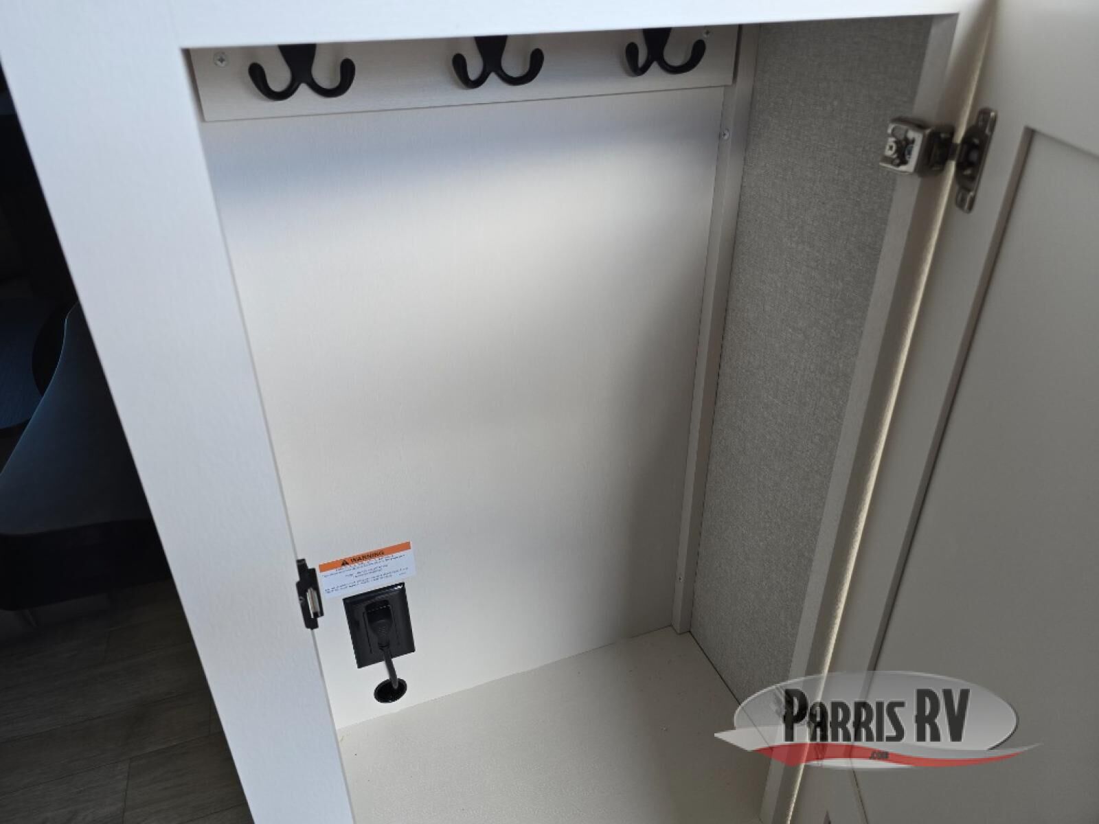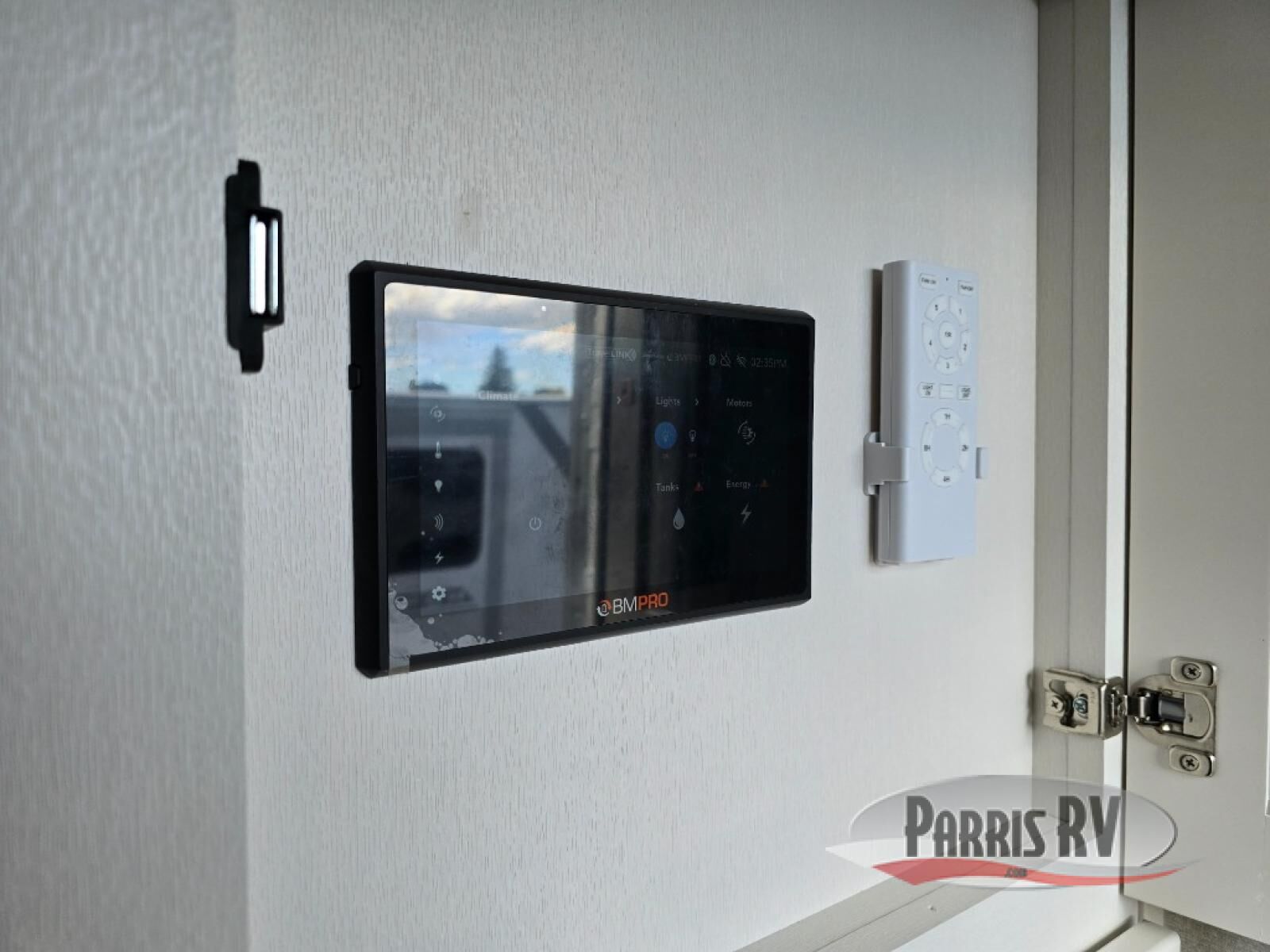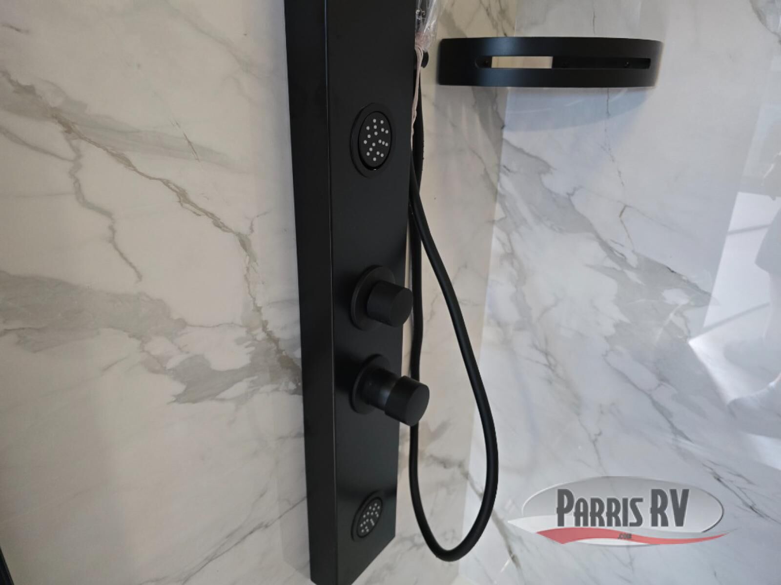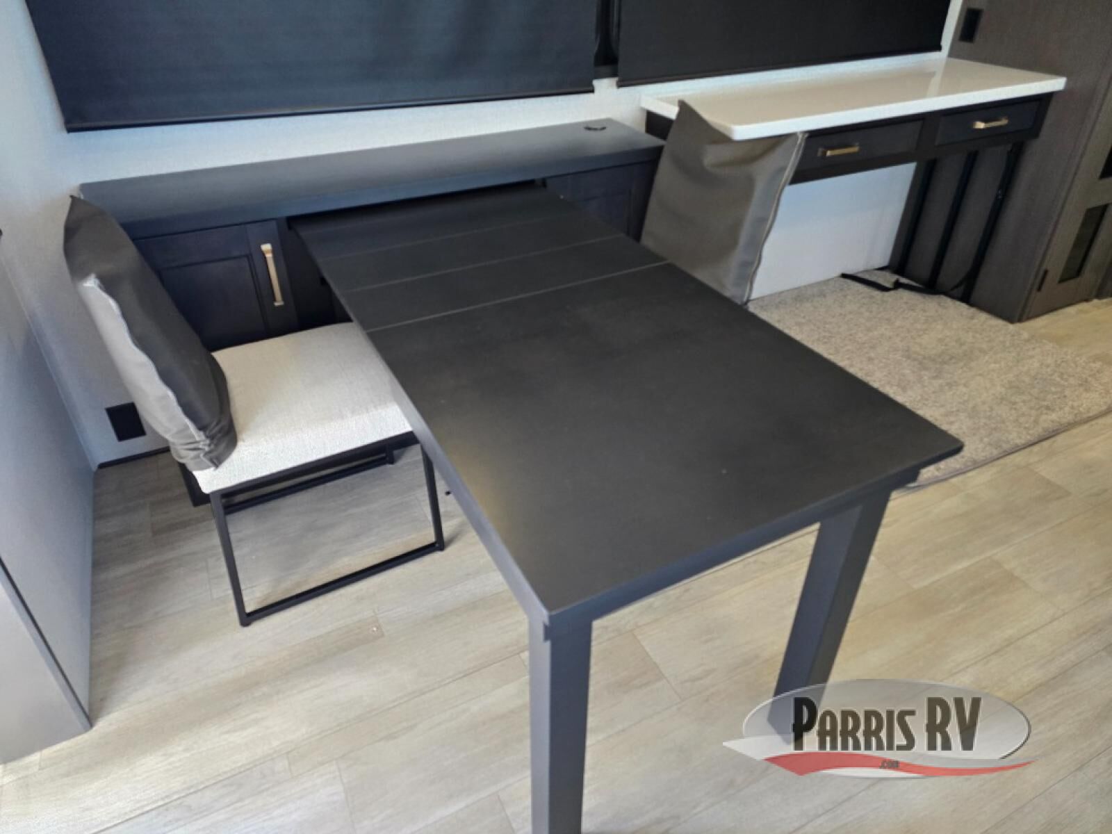 At the front of the 36RK model we have the spacious bedroom featuring a luxurious 72" x 80" king bed, providing ample room to relax and unwind after a long day. A wardrobe and dresser, complete with a TV mounted above, offer generous storage for clothing and personal essentials. Moving down the hall, the full bathroom includes a large 36" x 48" shower with a built-in seat for added comfort, as well as a linen closet for convenient storage. Toward the center and rear of the unit, the open living area expands with dual opposing slides, creating an inviting and comfortable space. One slide houses a 100" L-shaped sofa and theater seating across from the entertainment center with a cozy fireplace, perfect for relaxing evenings. The opposite slide features a pull-out table ideal for dining or game nights, alongside a versatile desk and coffee bar. This same slide also includes a 21-cu. ft. residential refrigerator and a shelved pantry for effortless organization. At the very rear, the U-shaped kitchen is designed for function and style, boasting solid-surface countertops, abundant overhead cabinets, a pull-out pantry, and a pull-out cutting board making meal prep, cooking, and snacking both easy and enjoyable.