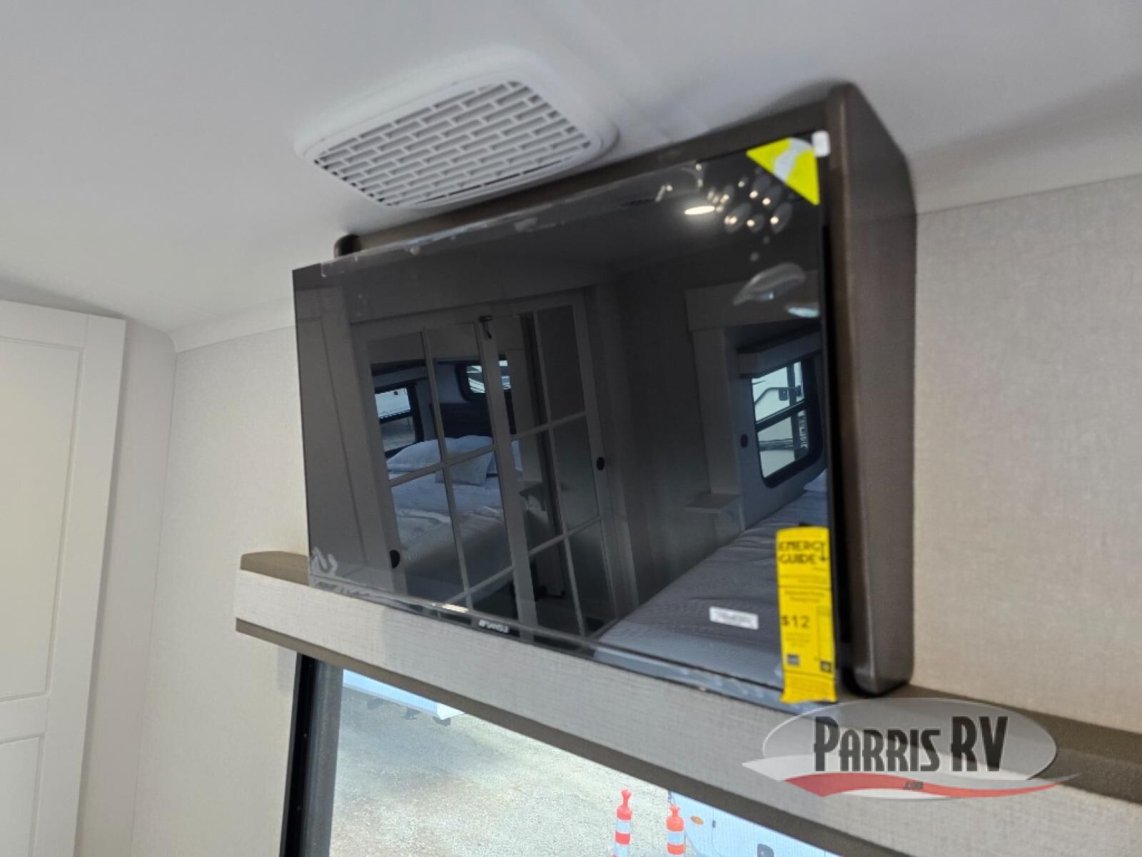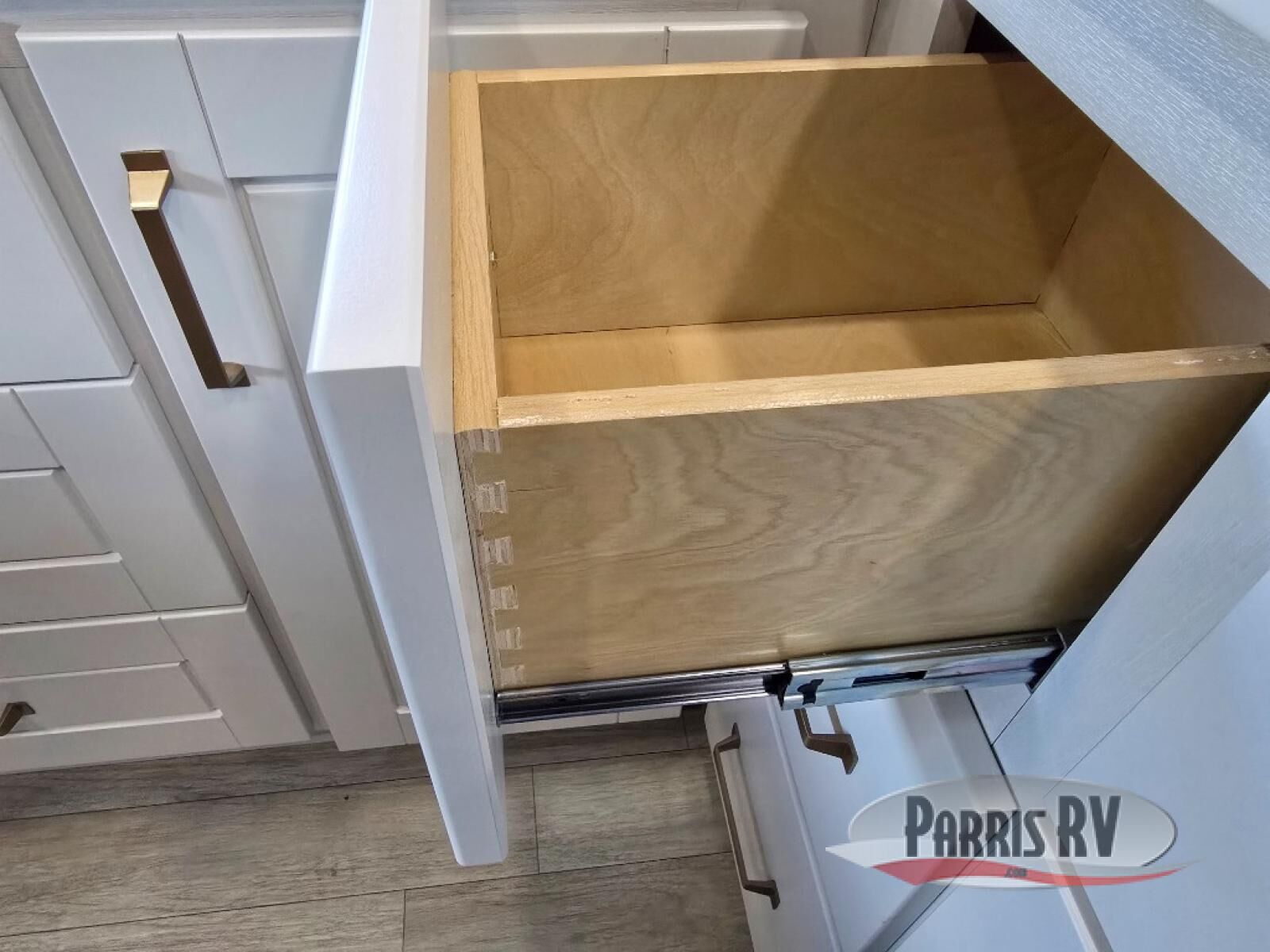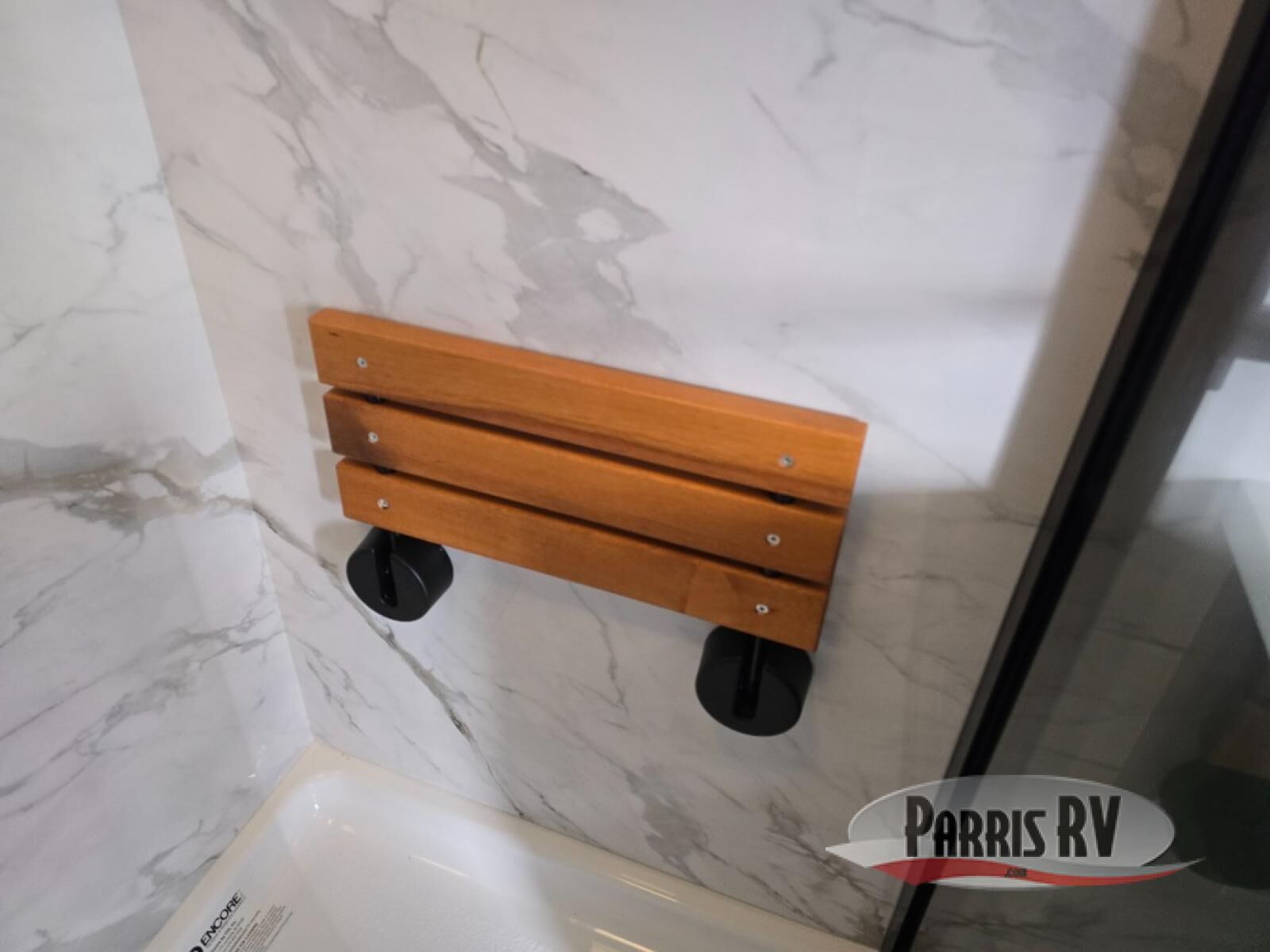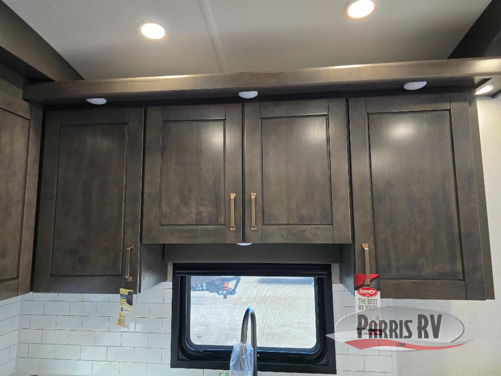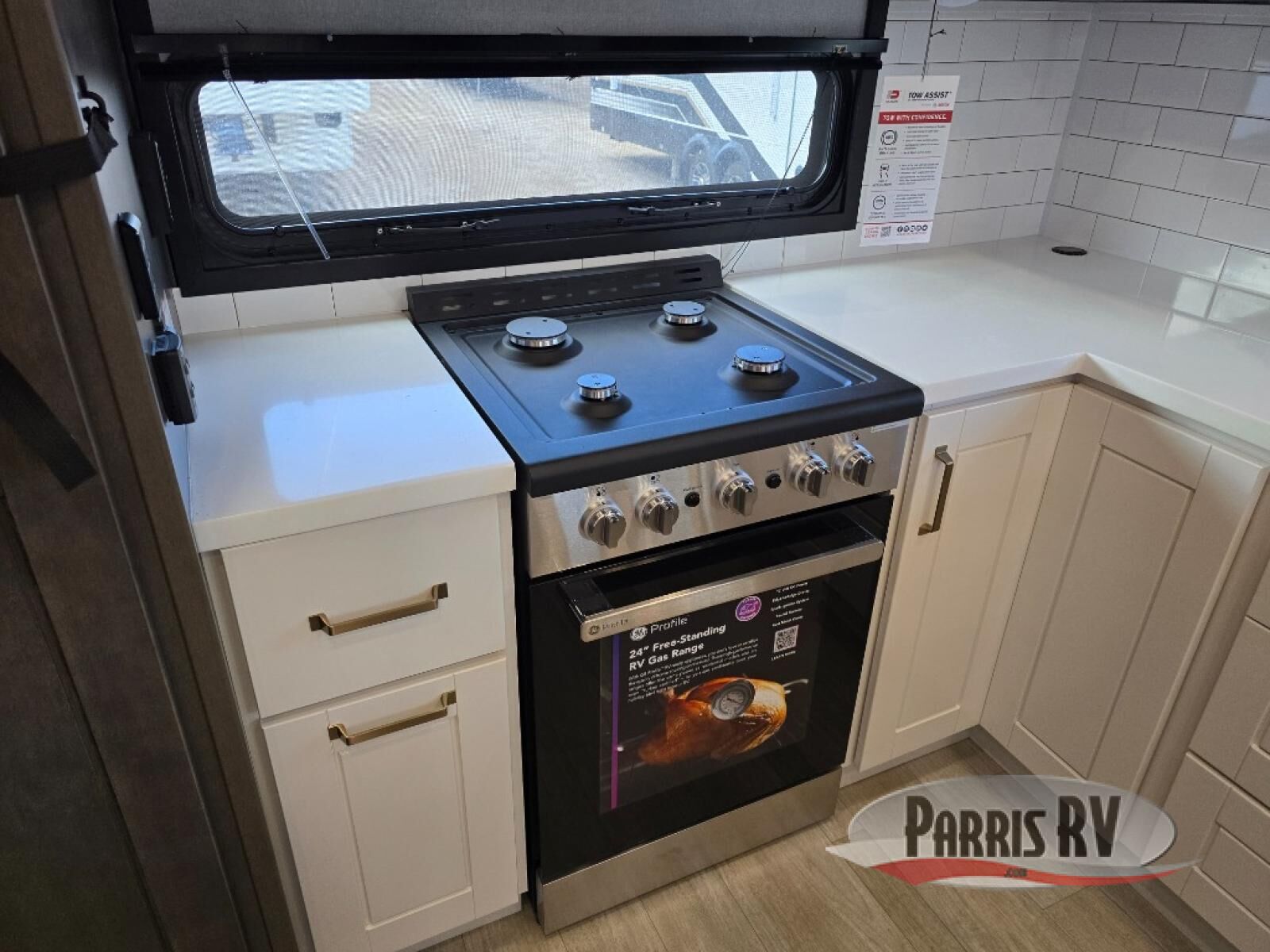 At the front of the 36RK model we have the spacious bedroom featuring a luxurious 72" x 80" king bed, providing ample room to relax and unwind after a long day. A wardrobe and dresser, complete with a TV mounted above, offer generous storage for clothing and personal essentials. Moving down the hall, the full bathroom includes a large 36" x 48" shower with a built-in seat for added comfort, as well as a linen closet for convenient storage. Toward the center and rear of the unit, the open living area expands with dual opposing slides, creating an inviting and comfortable space. One slide houses a 100" L-shaped sofa and theater seating across from the entertainment center with a cozy fireplace, perfect for relaxing evenings. The opposite slide features a pull-out table ideal for dining or game nights, alongside a versatile desk and coffee bar. This same slide also includes a 21-cu. ft. residential refrigerator and a shelved pantry for effortless organization. At the very rear, the U-shaped kitchen is designed for function and style, boasting solid-surface countertops, abundant overhead cabinets, a pull-out pantry, and a pull-out cutting board making meal prep, cooking, and snacking both easy and enjoyable.