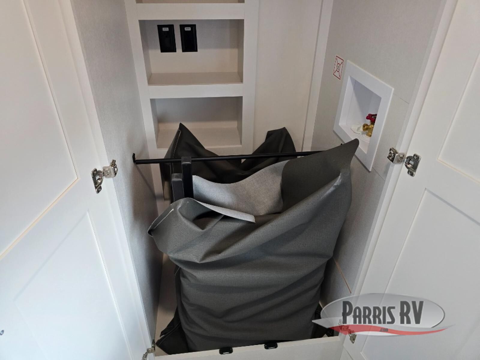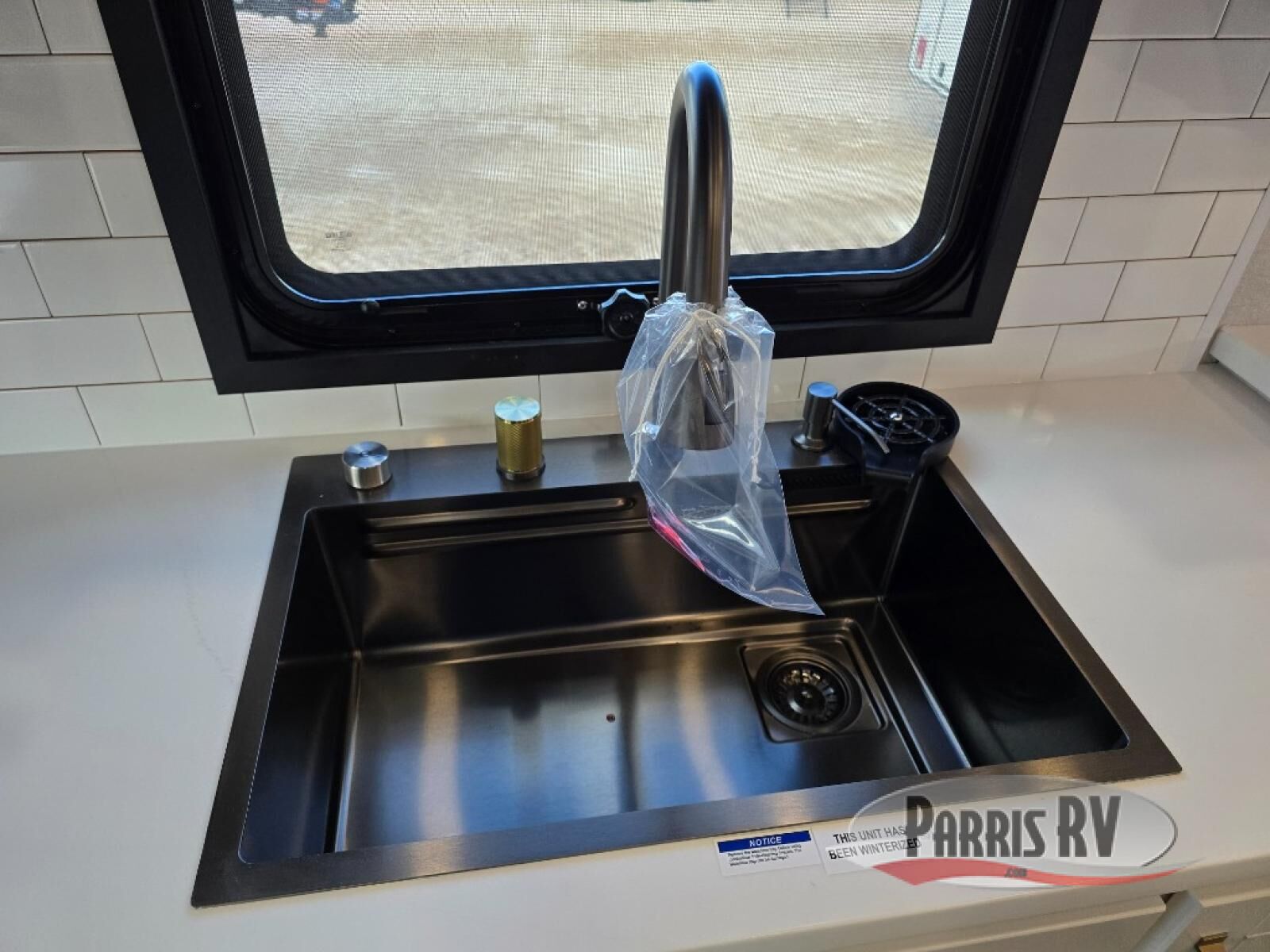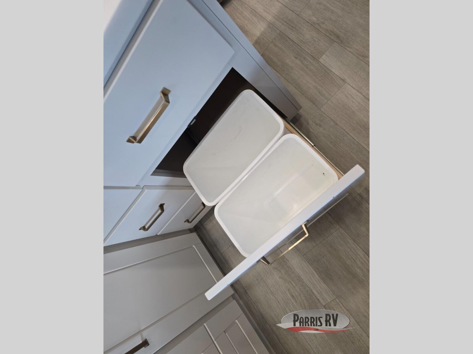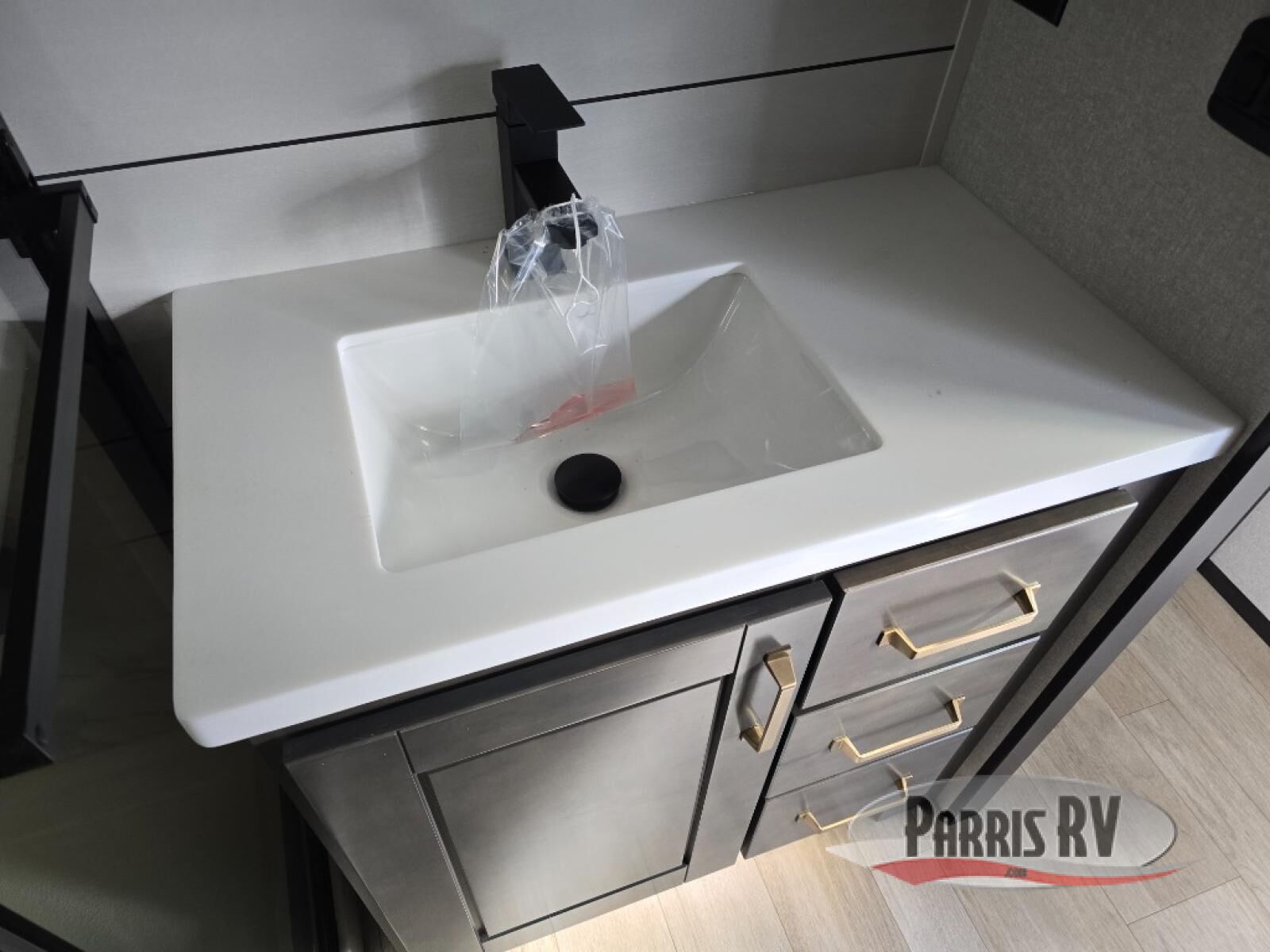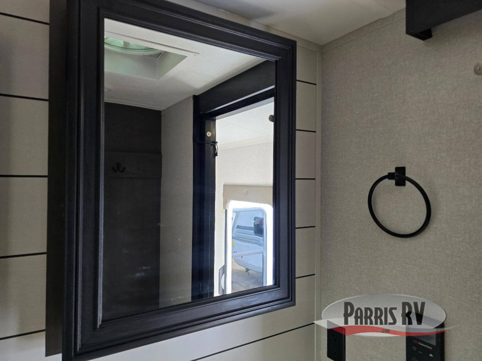 At the front of the 36RK model we have the spacious bedroom featuring a luxurious 72" x 80" king bed, providing ample room to relax and unwind after a long day. A wardrobe and dresser, complete with a TV mounted above, offer generous storage for clothing and personal essentials. Moving down the hall, the full bathroom includes a large 36" x 48" shower with a built-in seat for added comfort, as well as a linen closet for convenient storage. Toward the center and rear of the unit, the open living area expands with dual opposing slides, creating an inviting and comfortable space. One slide houses a 100" L-shaped sofa and theater seating across from the entertainment center with a cozy fireplace, perfect for relaxing evenings. The opposite slide features a pull-out table ideal for dining or game nights, alongside a versatile desk and coffee bar. This same slide also includes a 21-cu. ft. residential refrigerator and a shelved pantry for effortless organization. At the very rear, the U-shaped kitchen is designed for function and style, boasting solid-surface countertops, abundant overhead cabinets, a pull-out pantry, and a pull-out cutting board making meal prep, cooking, and snacking both easy and enjoyable.