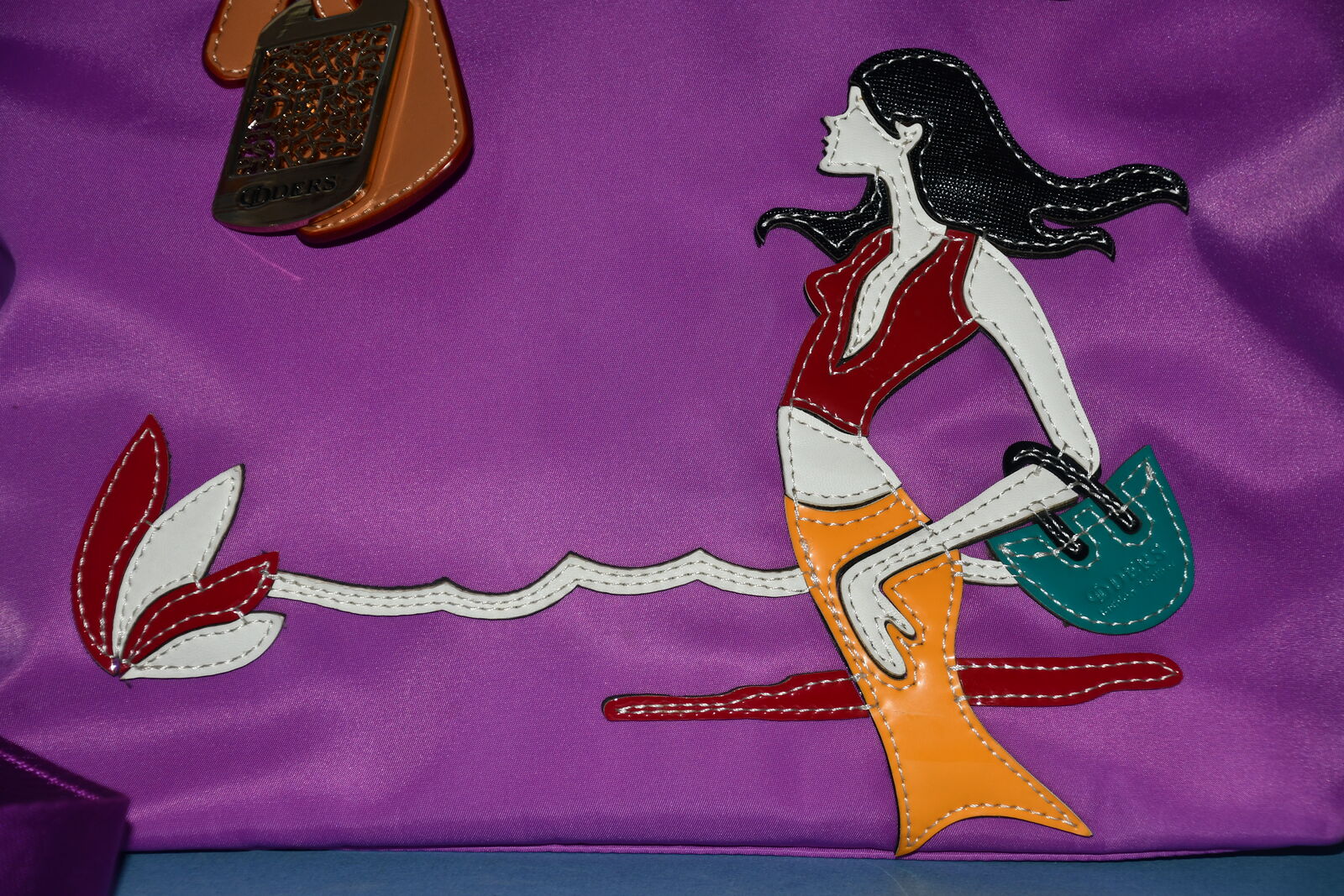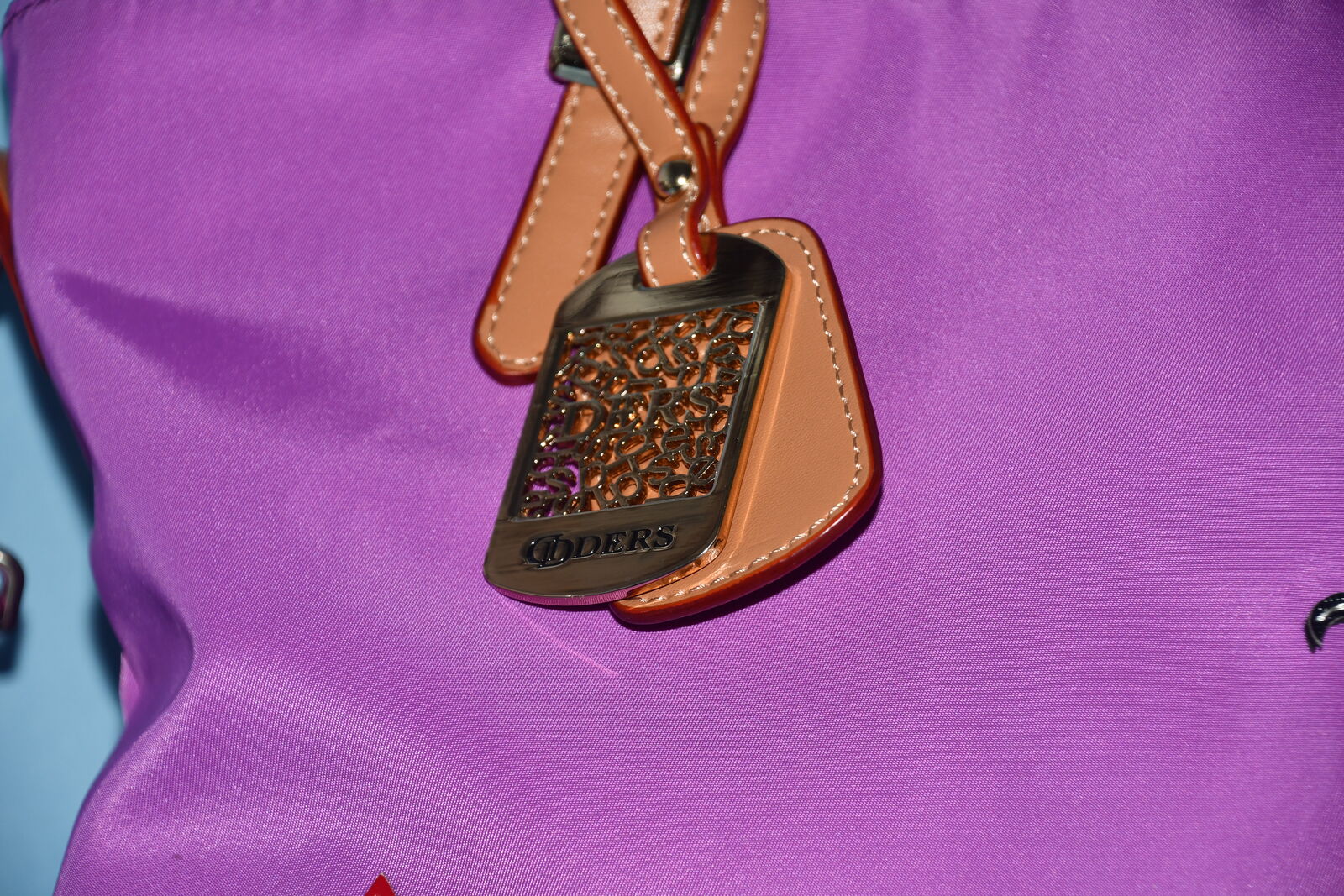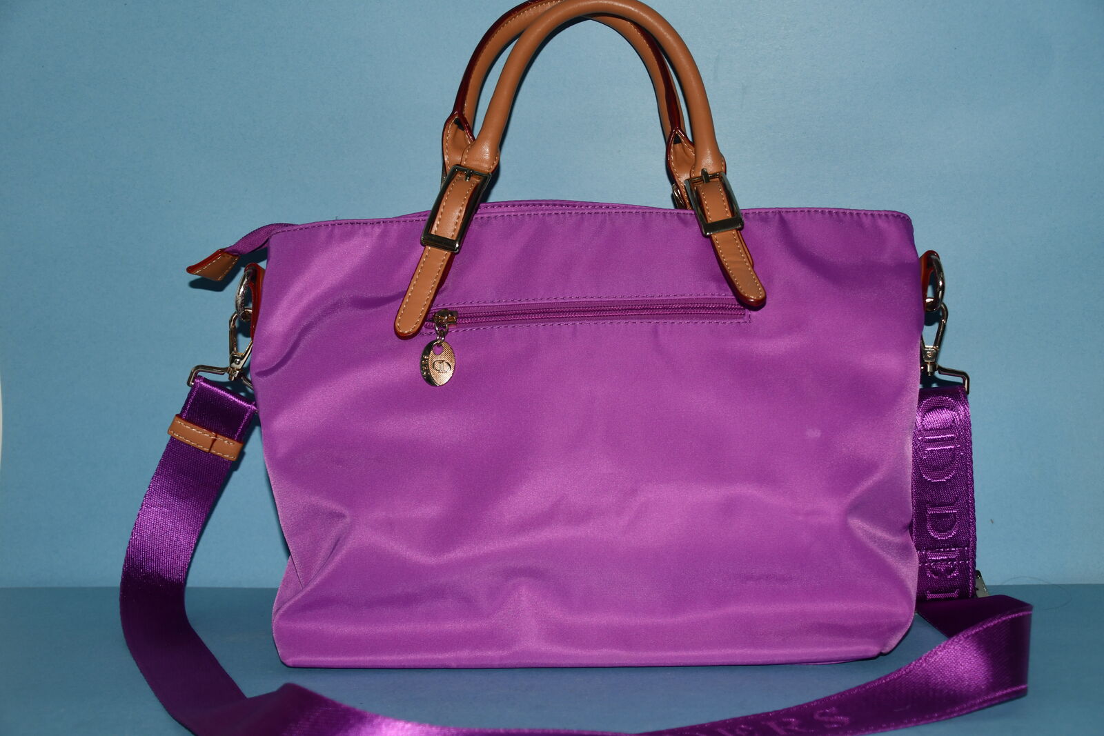 This "DERS" PURPLE HANDBAG/ TOTE is about 14" x 10.5" x 5". It is ZIPPERED. It has a REMOVABLE, ADJUSTABLE STRAP. It has a CUTE STITCHED DESIGN. Our home is smoke free. Questions??? Please ask. We are located in Plain City. Cash only please.
