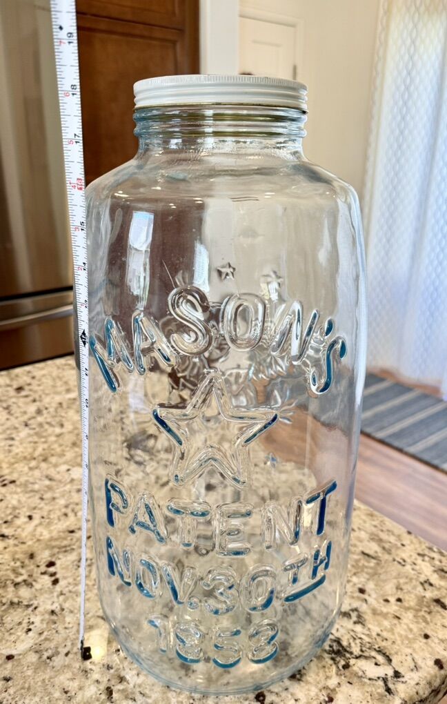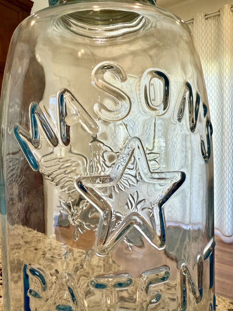 VenmoLarge vintage Mason Jar. Nov. 30th 1858. Beautiful eagle and starts. In excellent shape. 19” tall. I believe this to be a 5 gallon jar.
