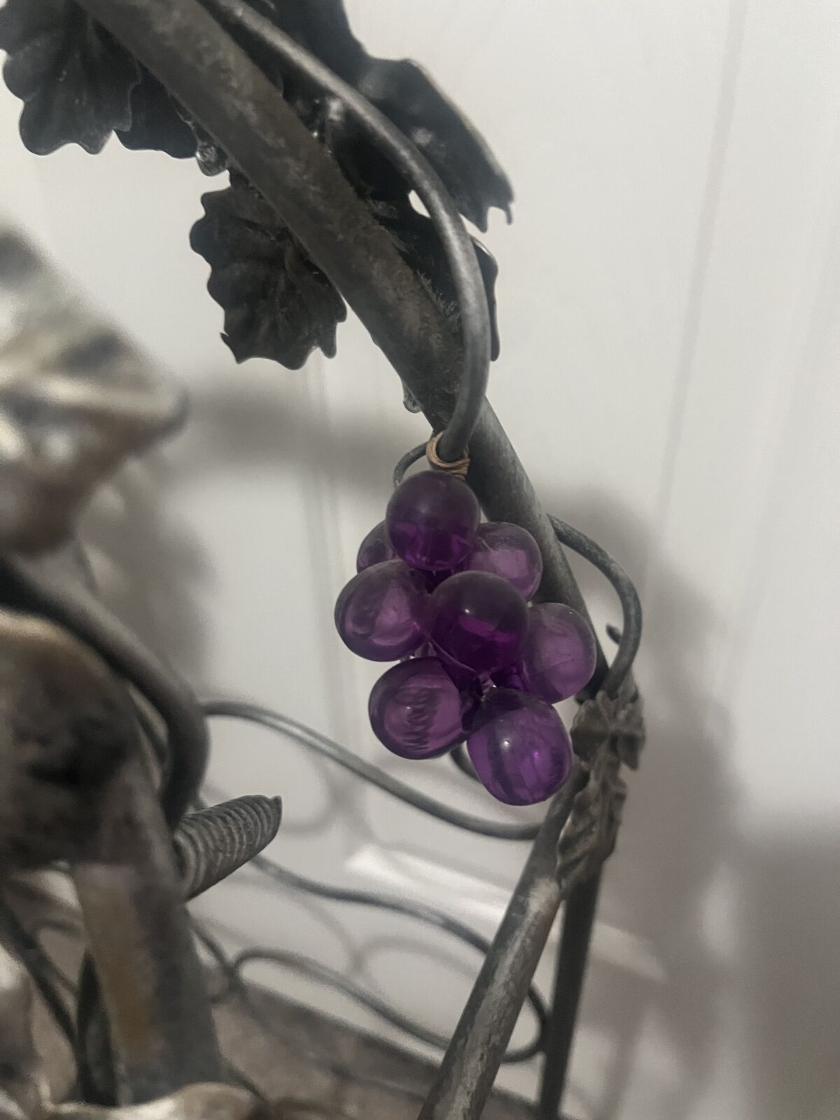 Beautiful metal wine rack with grape accents. Approximately 13 3/4"W x 29 3/4"H x 7"D. Please let me know if you have any additional questions.
