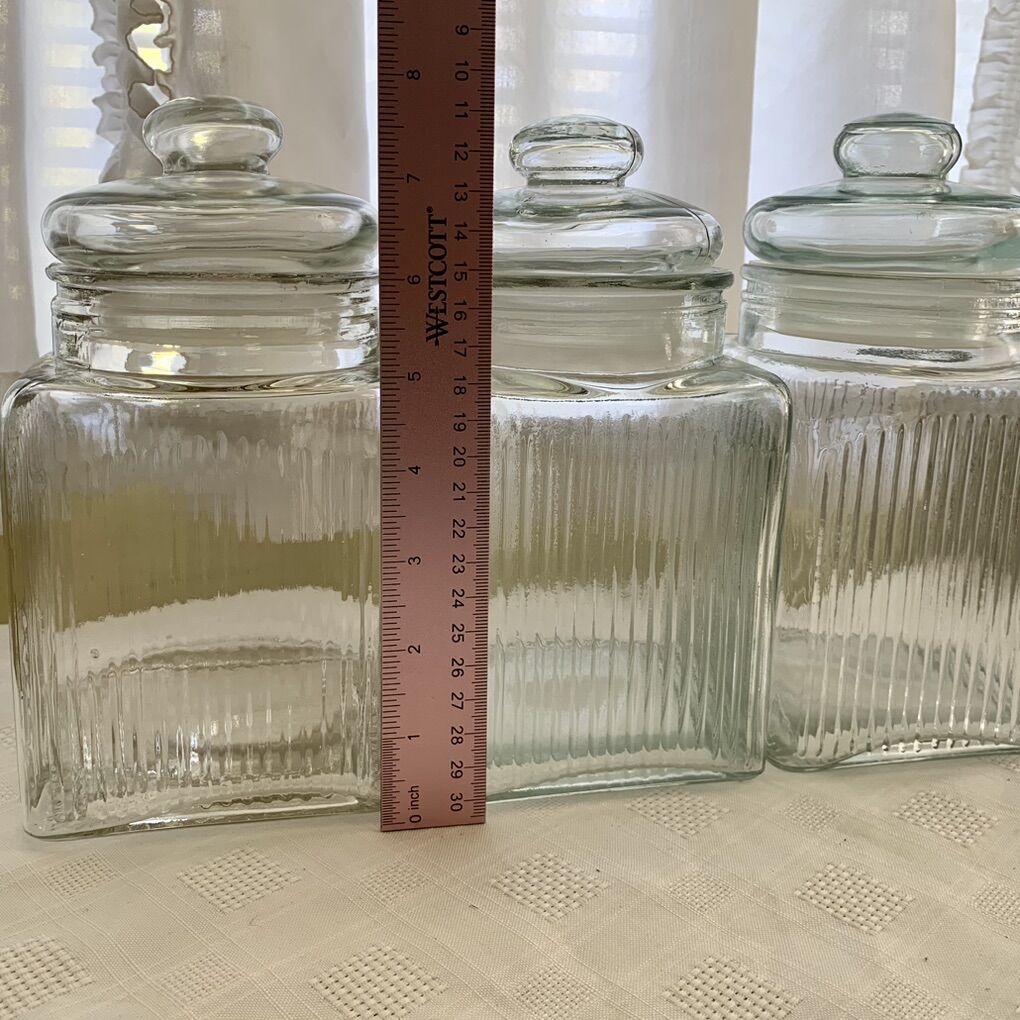 VenmoSquare jars are 4 X 5 inches (8 inch total height with lids) all have plastic seals. Very good condition no cracks or chips. Antique style candy jars. Message me if interested in purchasing.