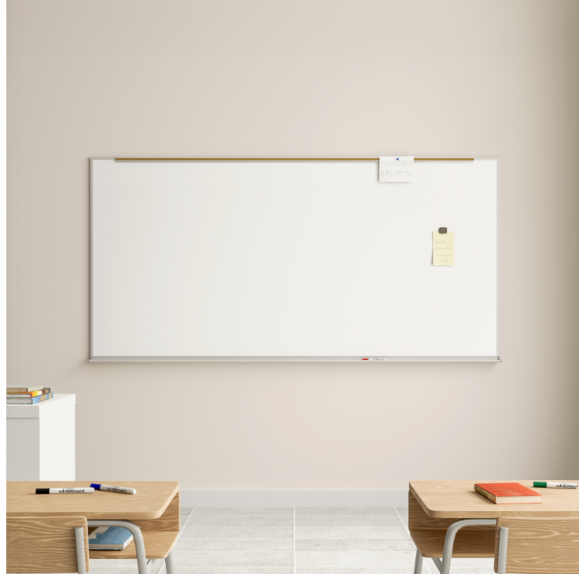 LCS Deluxe markerboard with 5/8" aluminum trim Size: 4ft x 8ft (H x W) With map rail Projection friendly white LCS3 porcelain enamel steel writing surface 5/8" face trim on 3 sides with full length 2.5" marker tray Satin anodized finish on trim Weighs 112 Lbs. GREENGUARD certified