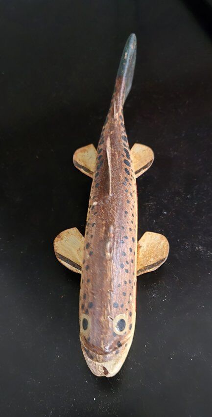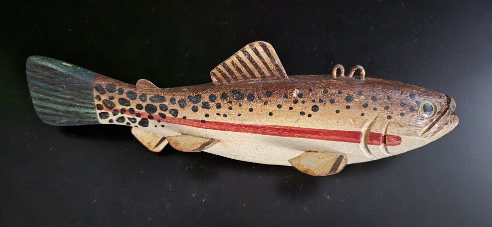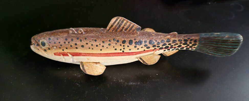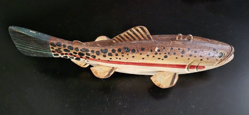 VenmoA golden trout decoy. Brown/olive backs with golden yellow body with a prminent crimson stripe along lateral line with markings. Circa 40-50's. Working decoy with rust noted on the tin fins. Present are 2 weights on under belly of decoy. Measures 8" long x 2"1/2 wide from tip of fin to belly. This folk art decoy was acquired from collection of Bill Karsten of Minnesota.