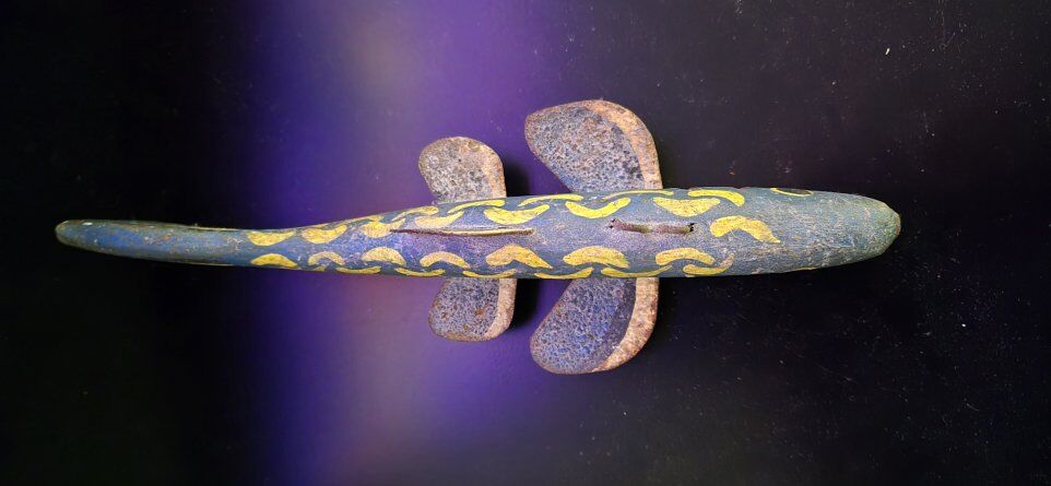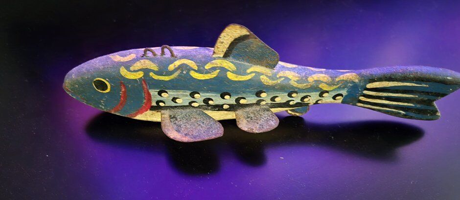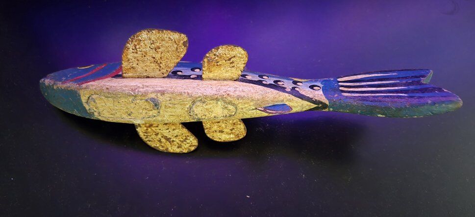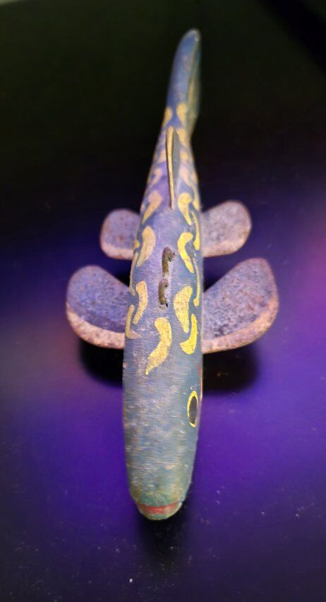 VenmoA rare vintage blue walleye fish decoy, exhibiting bright red gills, and bluish-gray hue on its skin .circa 40-50's. Measures 8 1/2"long x 21/2" from fin to belly. Hand carved and painted with w weights on underside of the decoy. Maker unknown. This folk art decoy was acquired from a collection of Bill Karsten of Minnesota