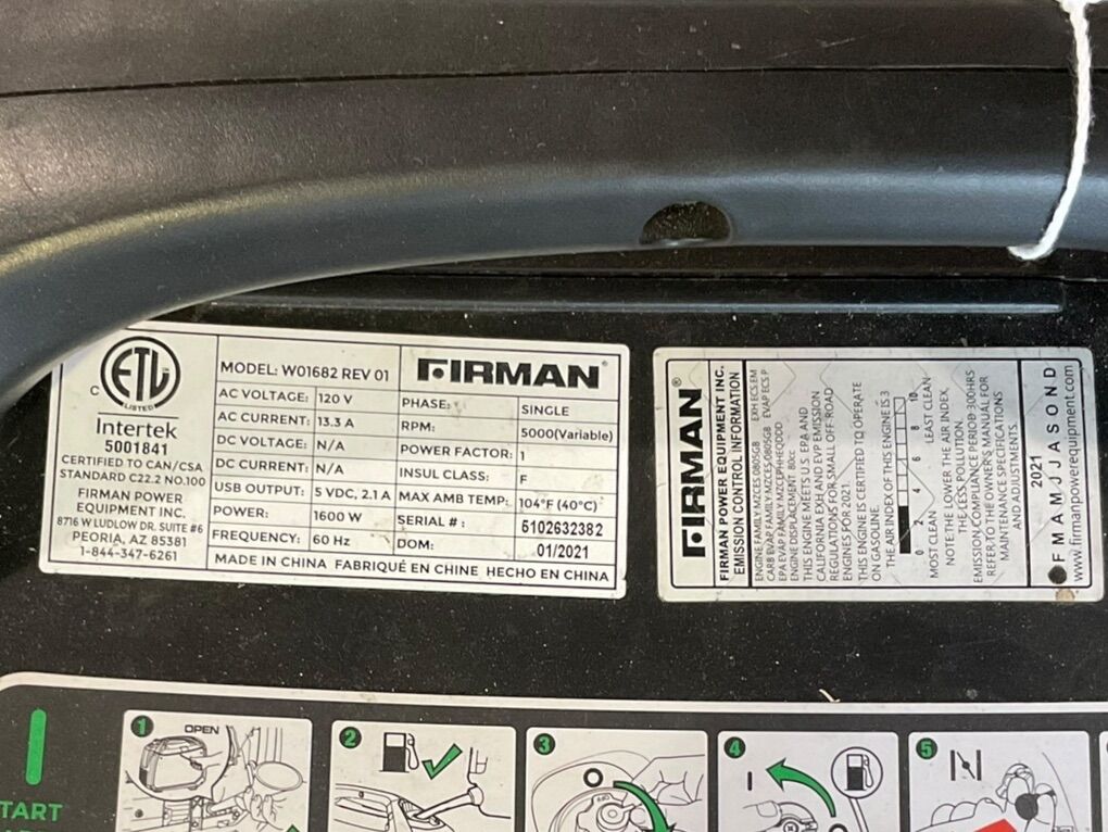 The FIRMAN W2000i (often listed as W01682) is a 1600-watt running / 2000-watt starting portable gasoline inverter generator, designed to provide clean, stable power for sensitive electronics.