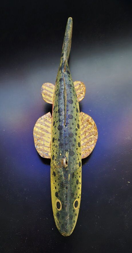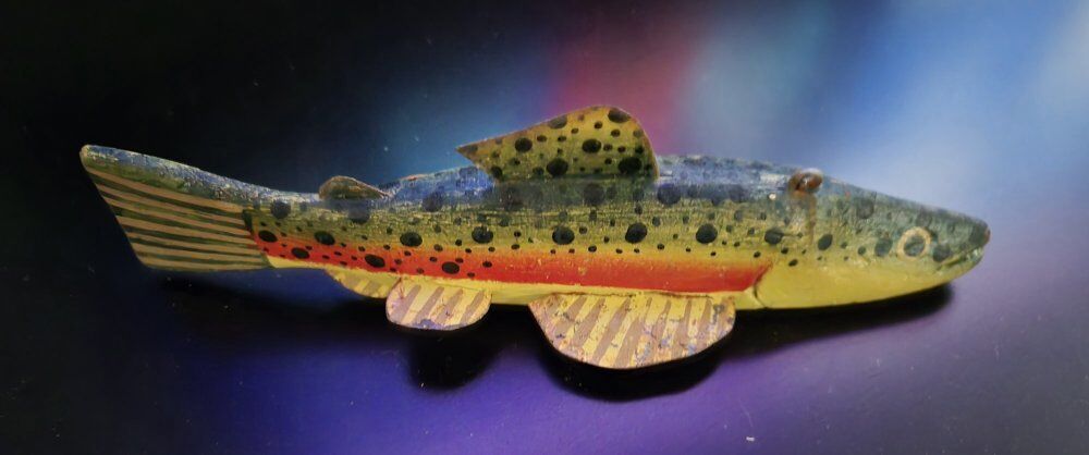 VenmoA vintage handcarved/ painted brook trout with dark green mottled side. Dark spots some of which may be reddish from shoulder to tail, extending down the body. A working decoy evident with mild rust on the fins. Present are 2 weights on under belly. Measures 7 1/2" length x 21/2" from fin to belly. Maker unknown. This folk art decoy was acquired from a collection of Bill Karsten of Minnesota.