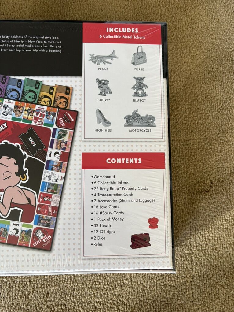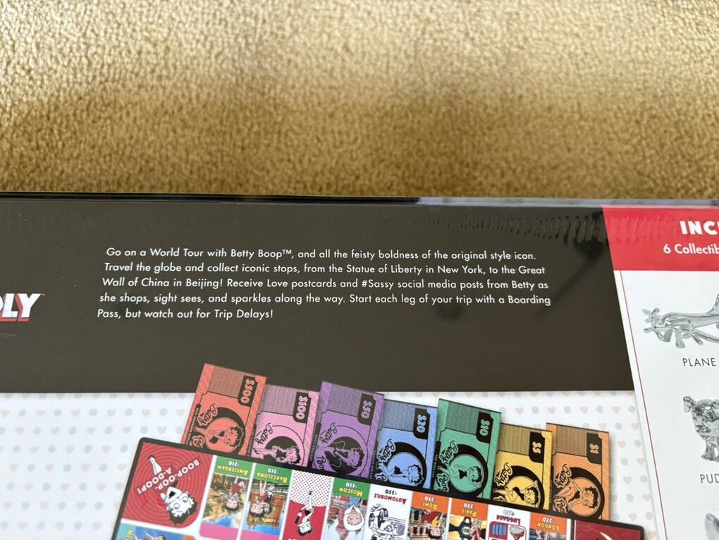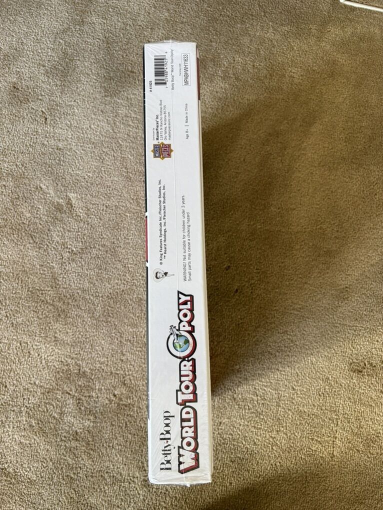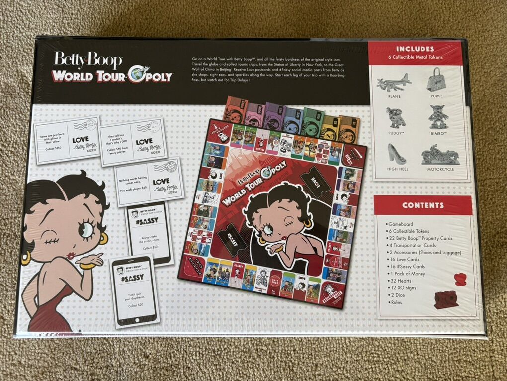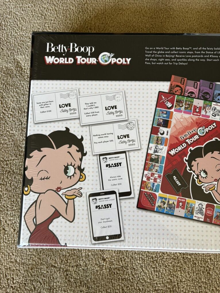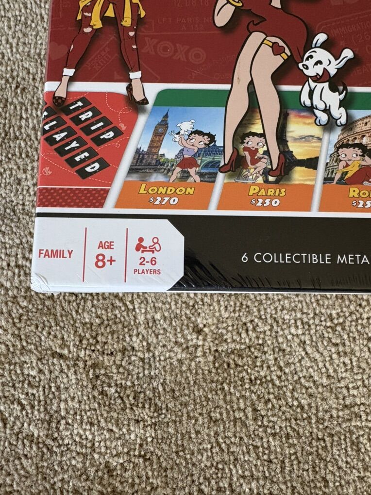NEW (sealed in plastic) Betty Boop World Tour-opoly Collector’s Edition Game. A Monopoly-style game by MasterPieces. Age 8+, 2-6 players. New, unopened condition. Text only. Cash or Venmo.