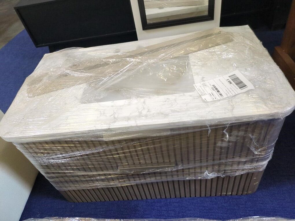 This floating vanity features a modern design with a sleek marble countertop and a spacious basin. Measuring 36 inches, it is perfect for enhancing any bathroom space. The vanity includes a stylish wooden base with a textured finish, providing both functionality and aesthetic appeal. Please note that there are some scratches present on the wood