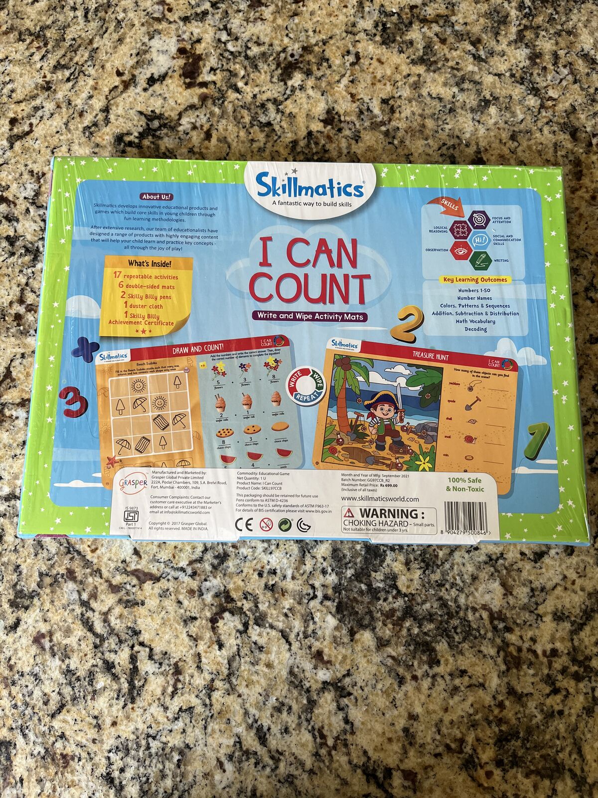 What is inside each pack? • Repeatable Activities • Double-Sided Activity Mats • Skilly Billy Markers • Duster Cloth • Welcome Letter • Achievement Certificate SKILLS DEVELOPED • Logical Reasoning • Focus & Attention • Observation • Social & Communication Skills • Writing LEARNING OUTCOMES • Numbers • Shapes, Colours & Patterns • Count & Add/Subtract • Math Vocabulary • Decoding LEARN THROUGH PLAY Highly engaging and repeatable activities which build core skills through fun learning methodologies.
