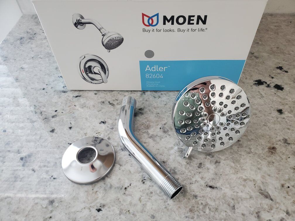 Brand new shower head, arm, and flange. Have only the pieces sitting in front of the box. Does not include faucet assembly or valve.