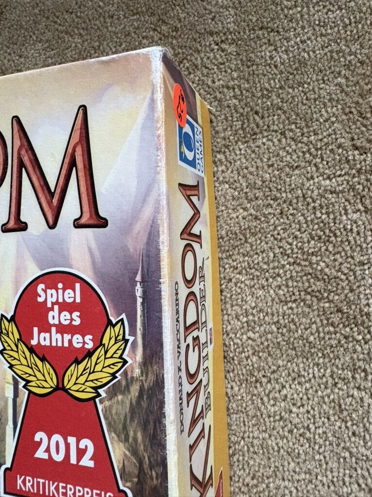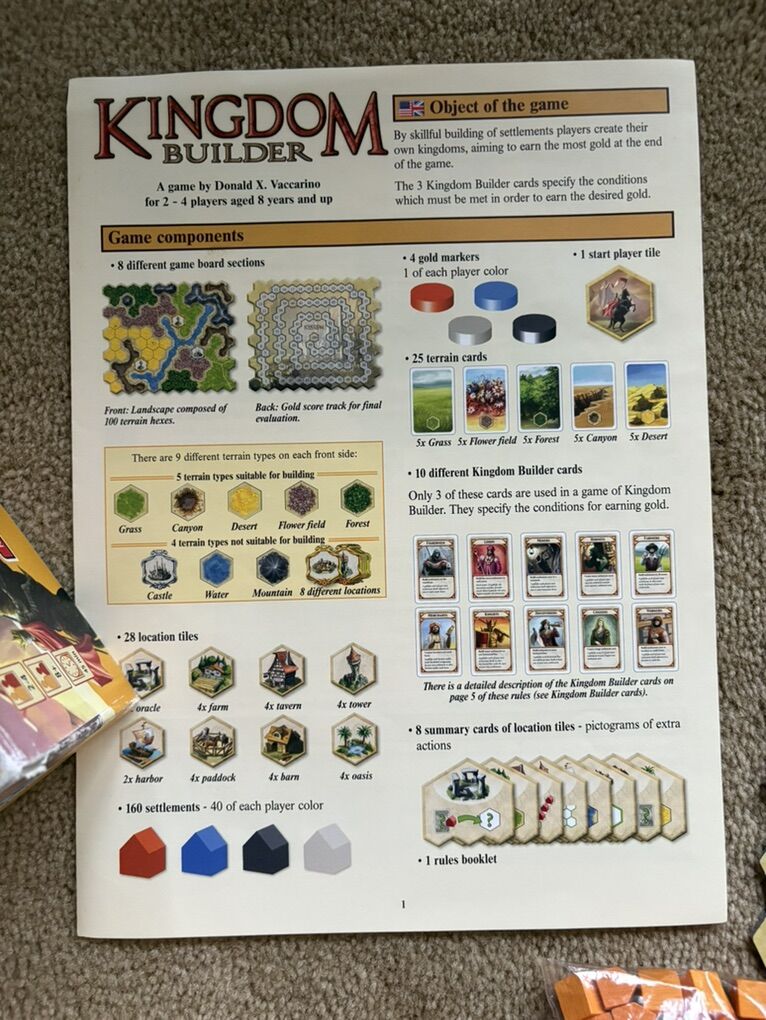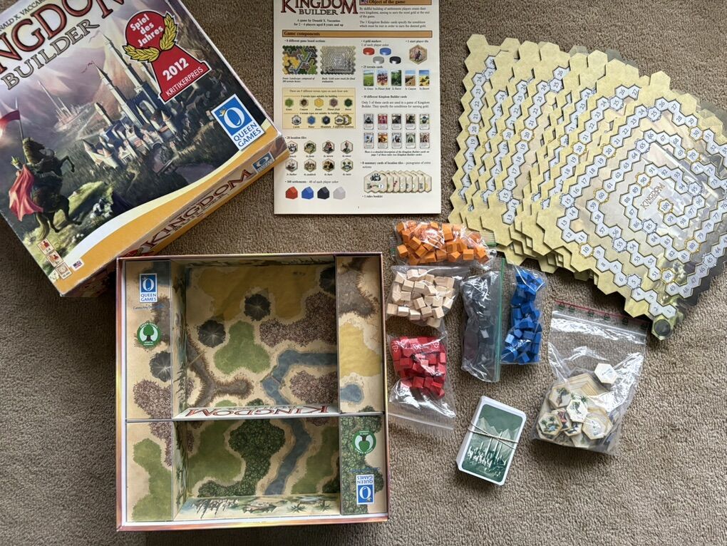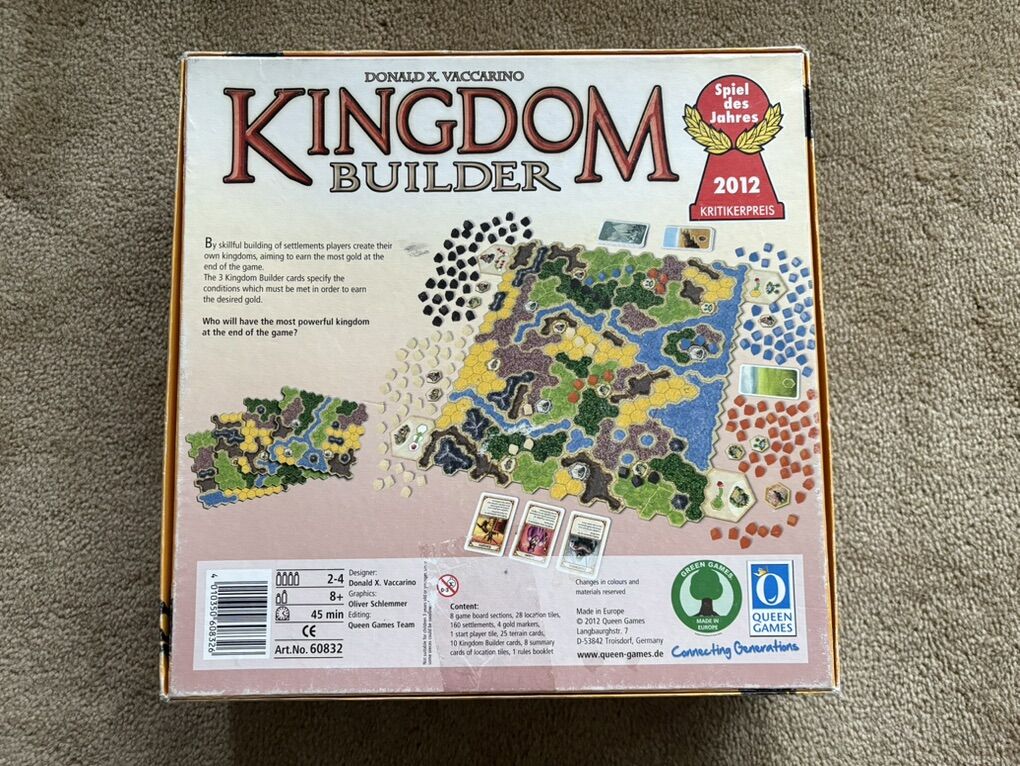 COMPLETE (with extras) Kingdom Builder Board Game. Award-winning game by Donald X. Vaccarino (creator of Dominion games), Queen Games, 2012. 2-4 players, age 8+. High-quality game, made in Germany. Complete, no missing pieces (includes extra cards & pieces). Very good condition (box edges/corners worn, has some tape residue—see photos). Text only. Cash or Venmo.