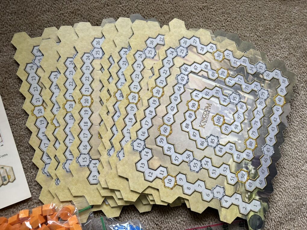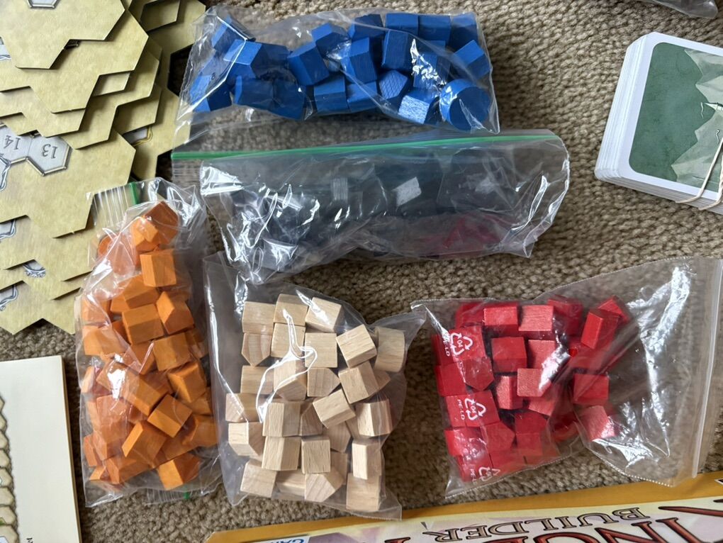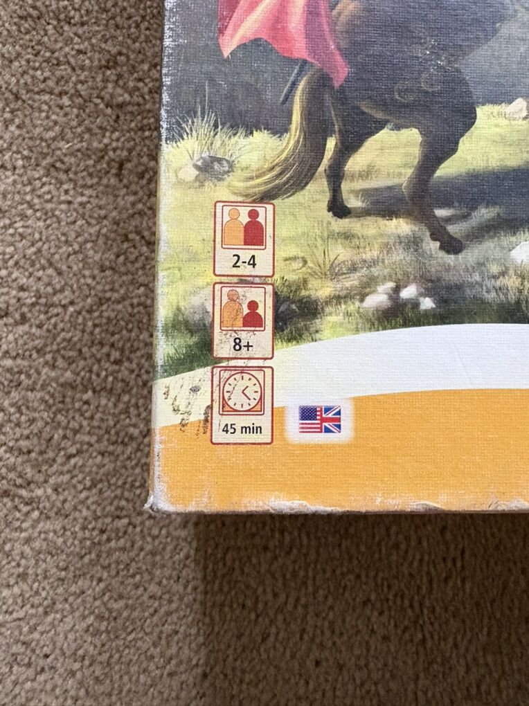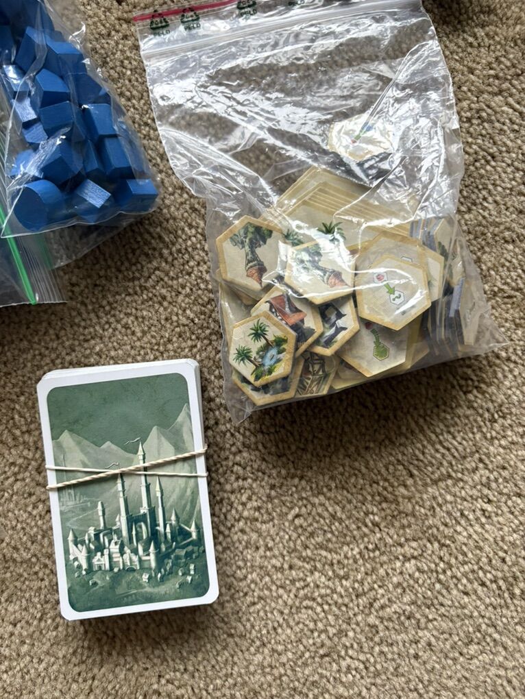 COMPLETE (with extras) Kingdom Builder Board Game. Award-winning game by Donald X. Vaccarino (creator of Dominion games), Queen Games, 2012. 2-4 players, age 8+. High-quality game, made in Germany. Complete, no missing pieces (includes extra cards & pieces). Very good condition (box edges/corners worn, has some tape residue—see photos). Text only. Cash or Venmo.