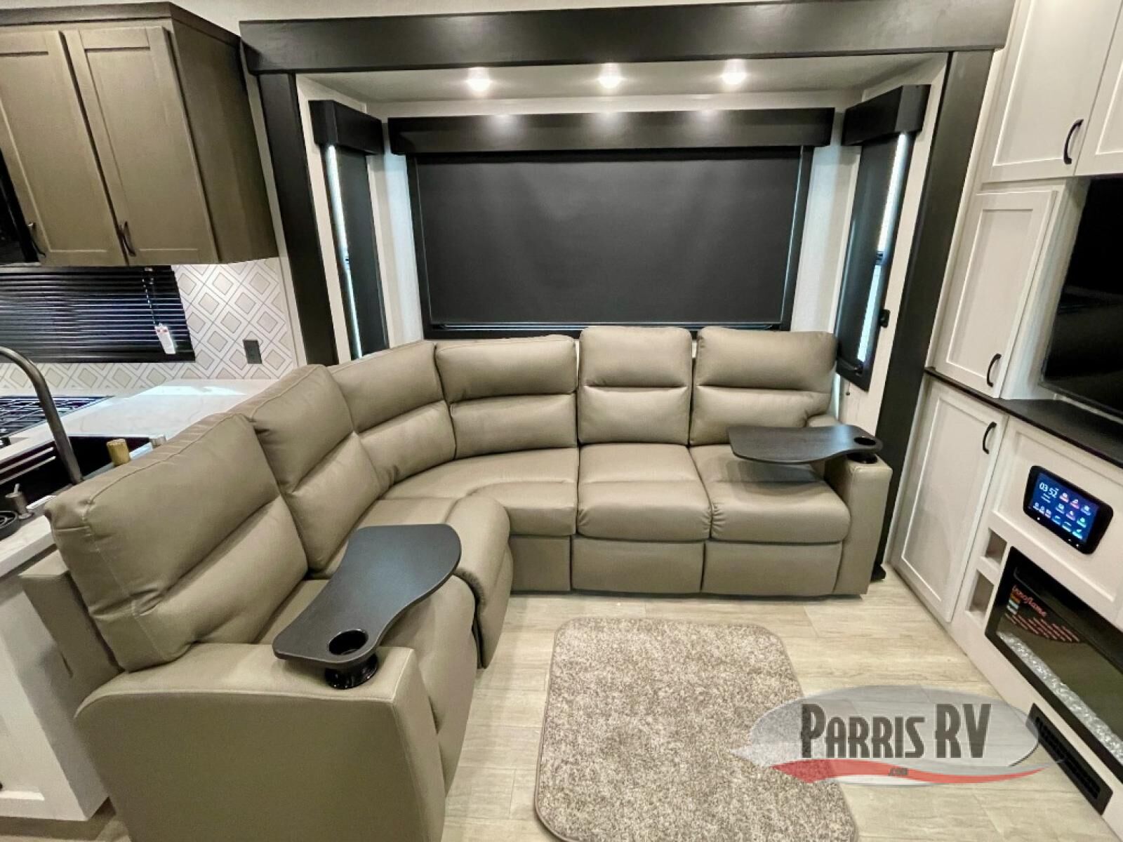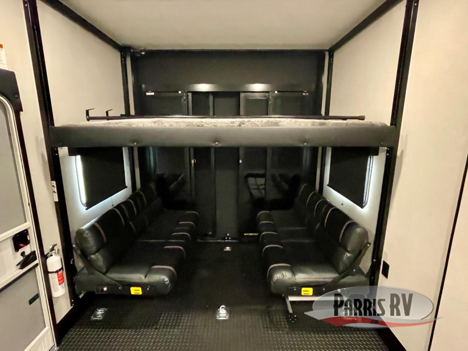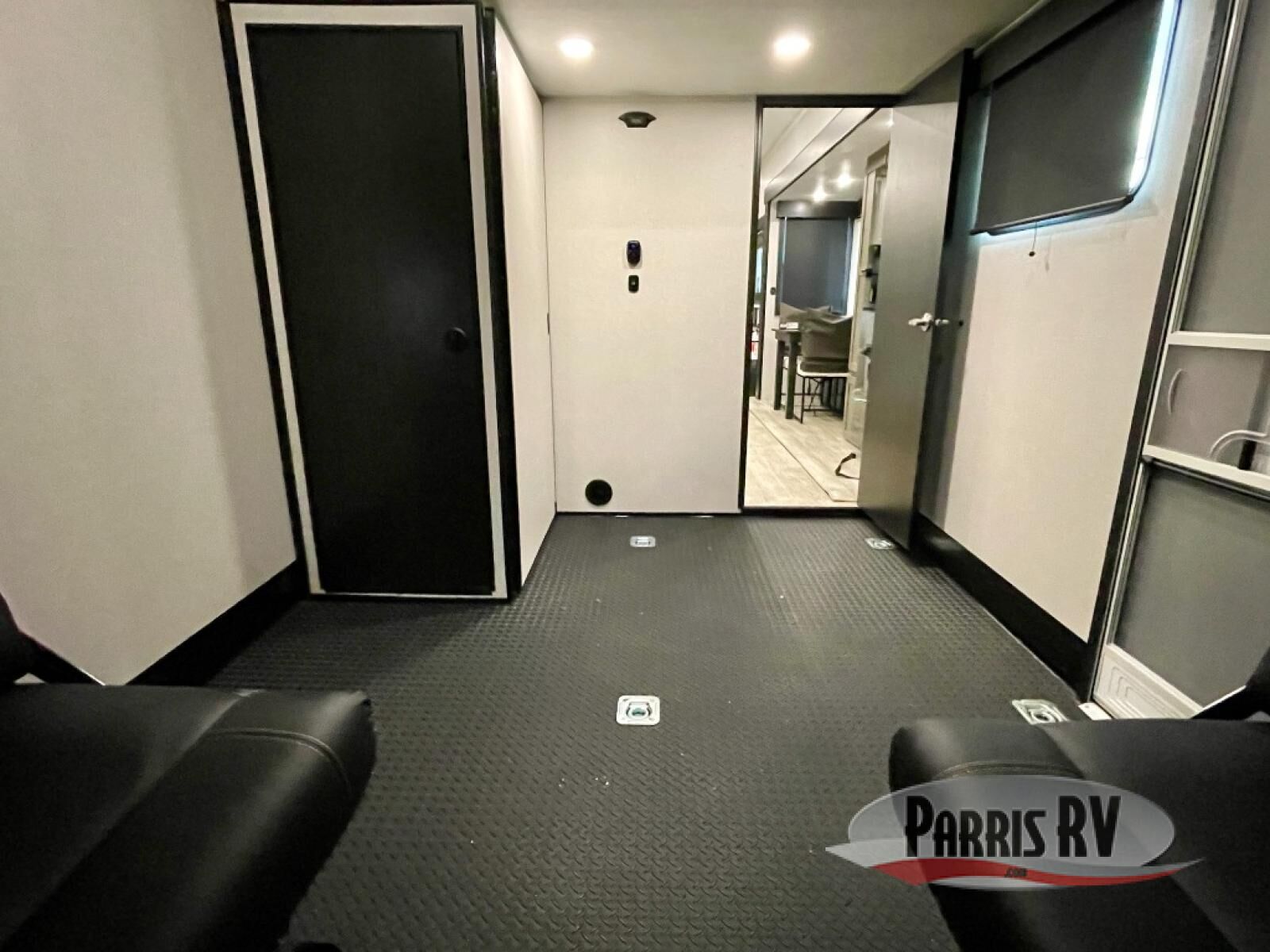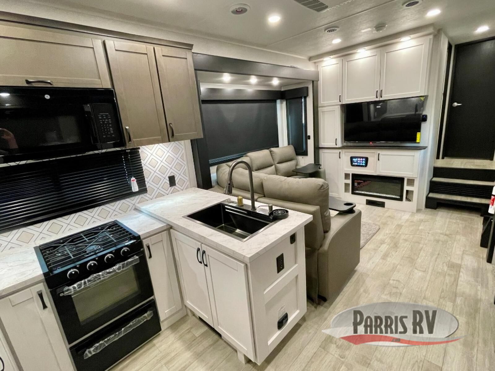 The 13' 6" garage is the perfect space for your toys, with enough room for your ATV, motorcycle, or other gear. Plus, the electric queen bed provides a comfortable spot to rest after a long day. The overhead loft with storage provides additional space for your gear, keeping it out of the way but still accessible. The kitchen is fully equipped with a microwave, sink, overhead cabinets, pantry, and coffee bar. The L-shaped sofa provides ample seating for relaxation, and the TV is perfectly positioned for viewing. The full bathroom is a welcome convenience, providing a private space to freshen up. Also, the front bedroom is a luxurious retreat, featuring a king bed, a walk-in closet, and drawers, and on the exterior, the two entry/exit doors provide easy access to the outside, making it perfect for loading and unloading your gear.