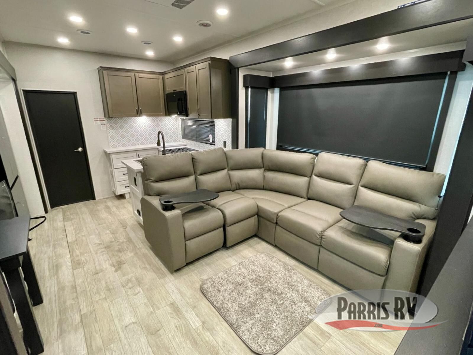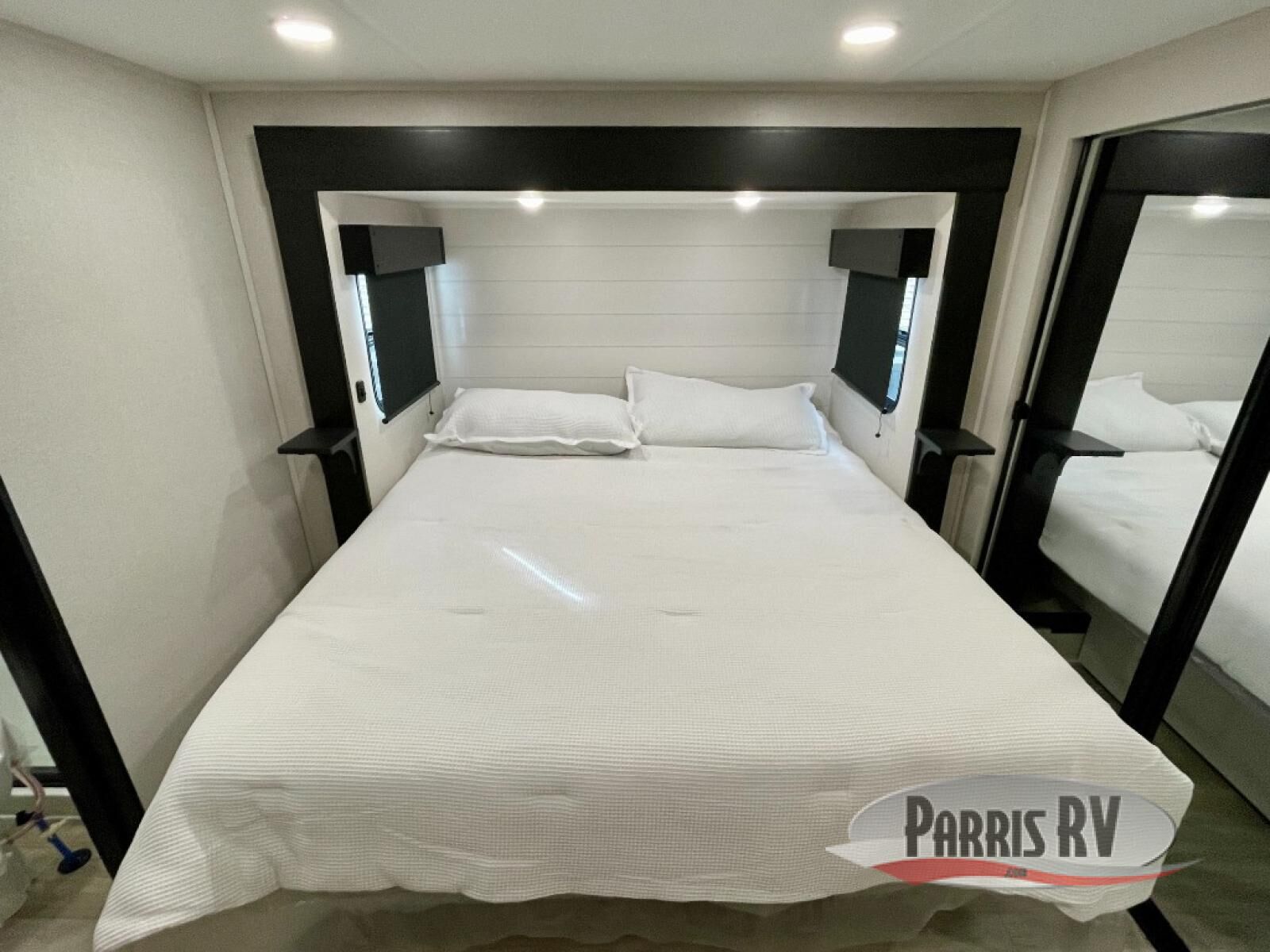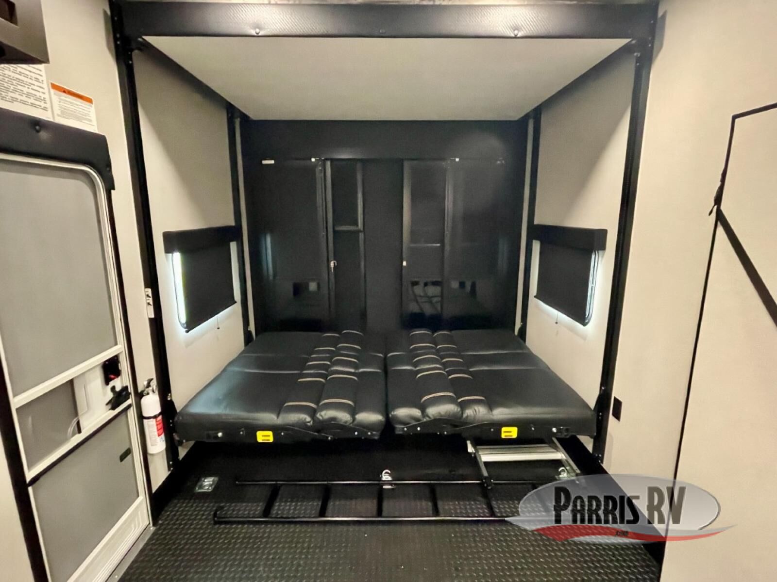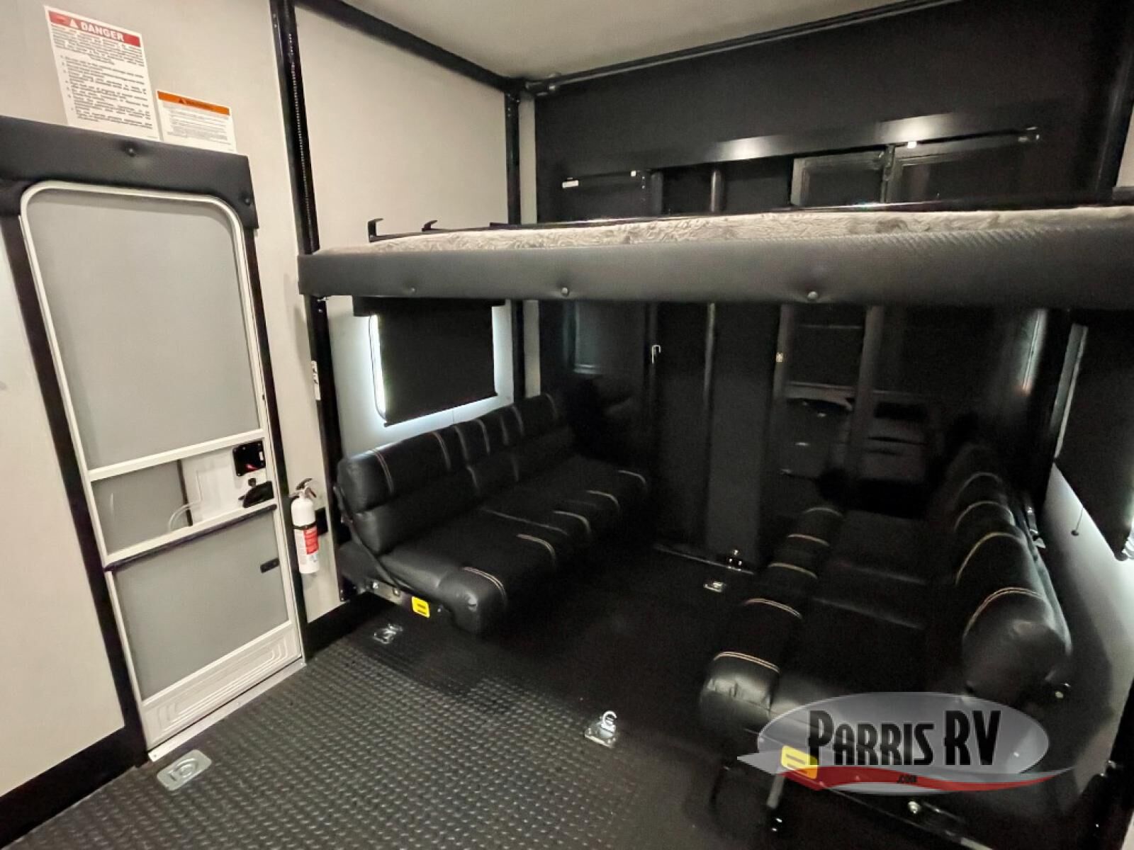 The 13' 6" garage is the perfect space for your toys, with enough room for your ATV, motorcycle, or other gear. Plus, the electric queen bed provides a comfortable spot to rest after a long day. The overhead loft with storage provides additional space for your gear, keeping it out of the way but still accessible. The kitchen is fully equipped with a microwave, sink, overhead cabinets, pantry, and coffee bar. The L-shaped sofa provides ample seating for relaxation, and the TV is perfectly positioned for viewing. The full bathroom is a welcome convenience, providing a private space to freshen up. Also, the front bedroom is a luxurious retreat, featuring a king bed, a walk-in closet, and drawers, and on the exterior, the two entry/exit doors provide easy access to the outside, making it perfect for loading and unloading your gear.
