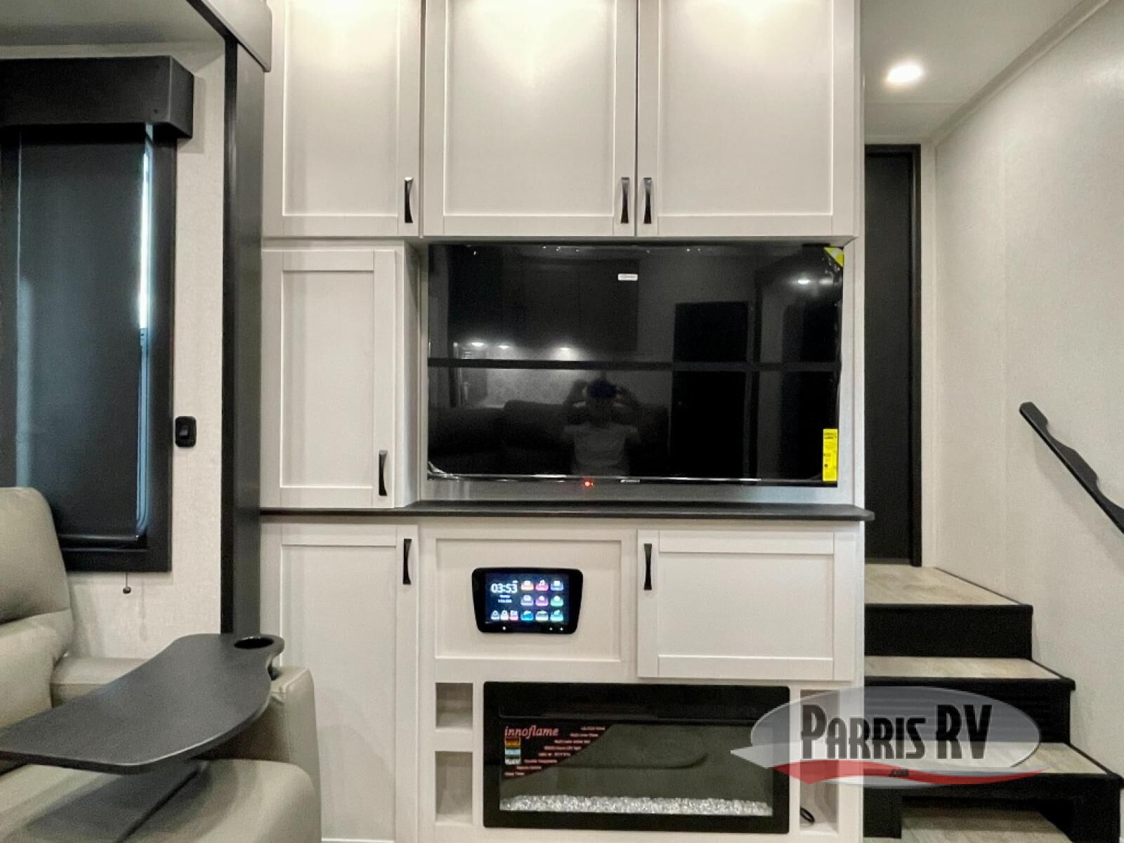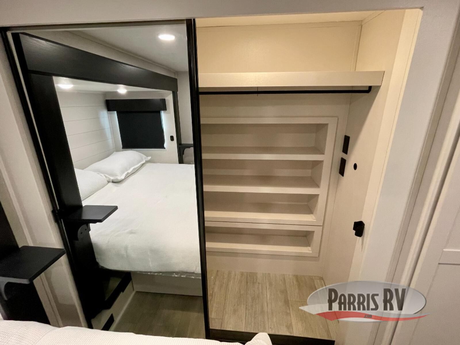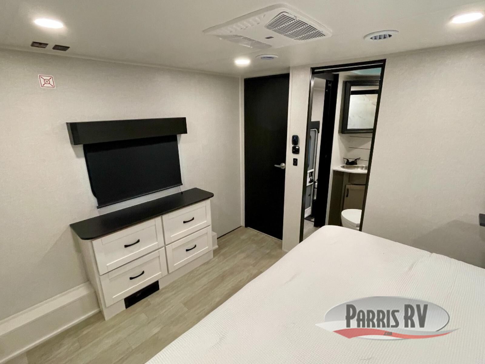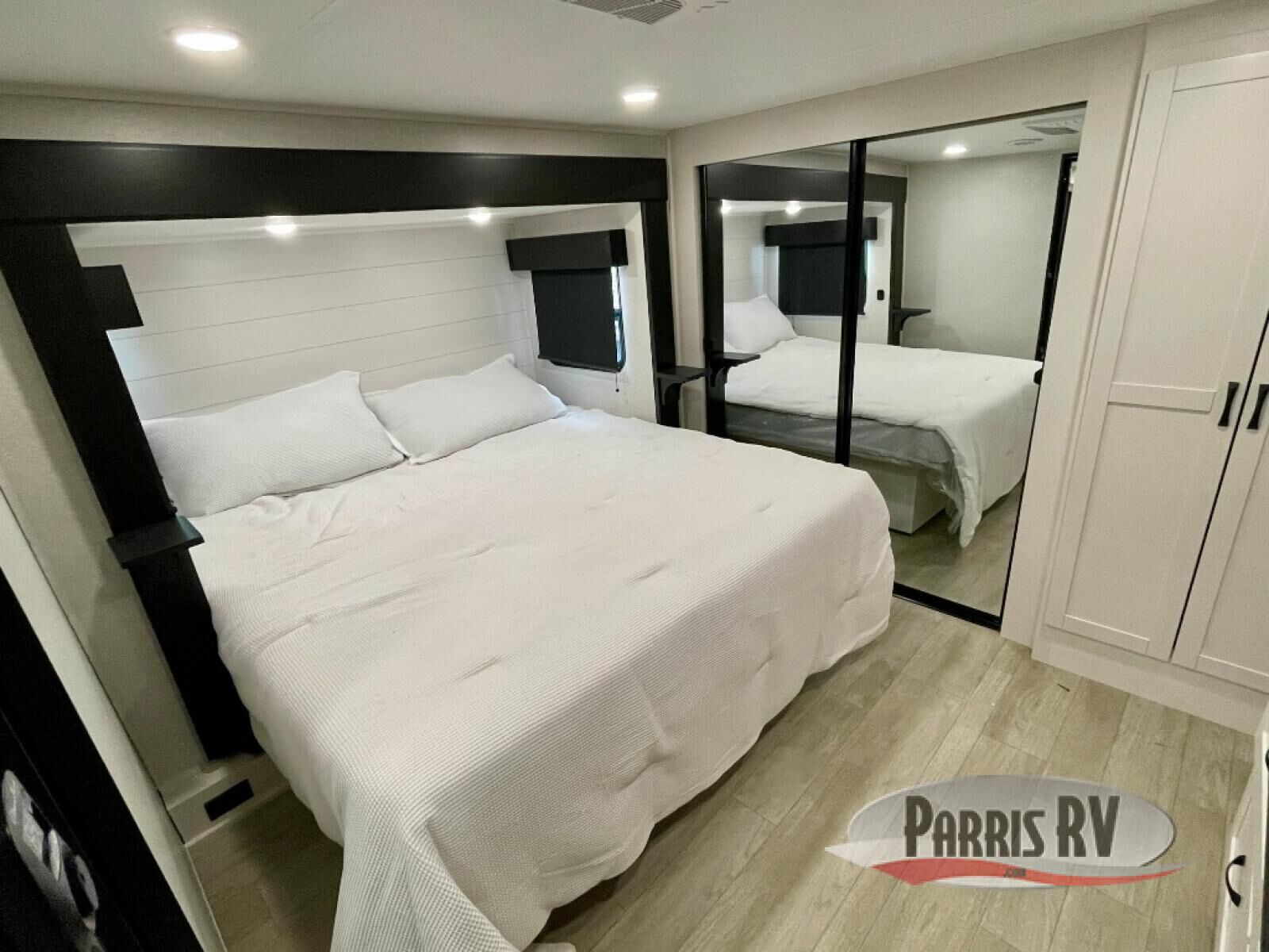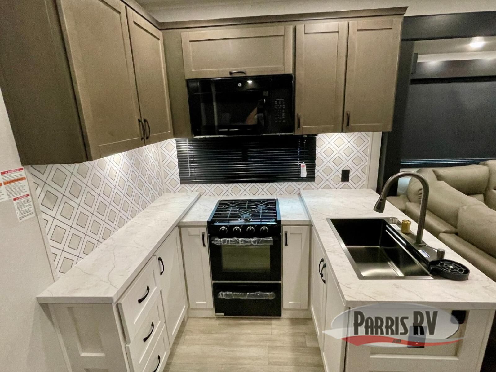 The 13' 6" garage is the perfect space for your toys, with enough room for your ATV, motorcycle, or other gear. Plus, the electric queen bed provides a comfortable spot to rest after a long day. The overhead loft with storage provides additional space for your gear, keeping it out of the way but still accessible. The kitchen is fully equipped with a microwave, sink, overhead cabinets, pantry, and coffee bar. The L-shaped sofa provides ample seating for relaxation, and the TV is perfectly positioned for viewing. The full bathroom is a welcome convenience, providing a private space to freshen up. Also, the front bedroom is a luxurious retreat, featuring a king bed, a walk-in closet, and drawers, and on the exterior, the two entry/exit doors provide easy access to the outside, making it perfect for loading and unloading your gear.