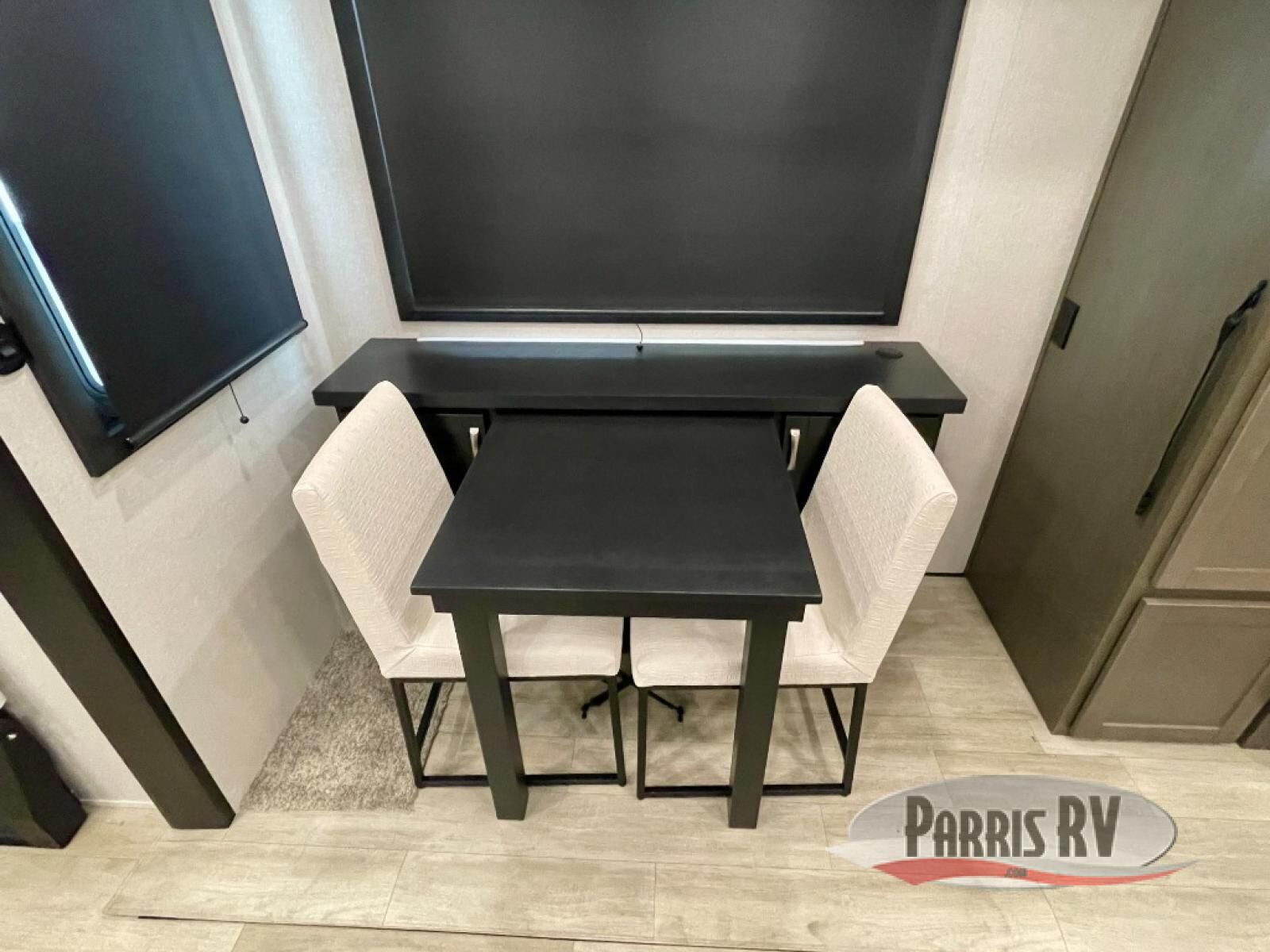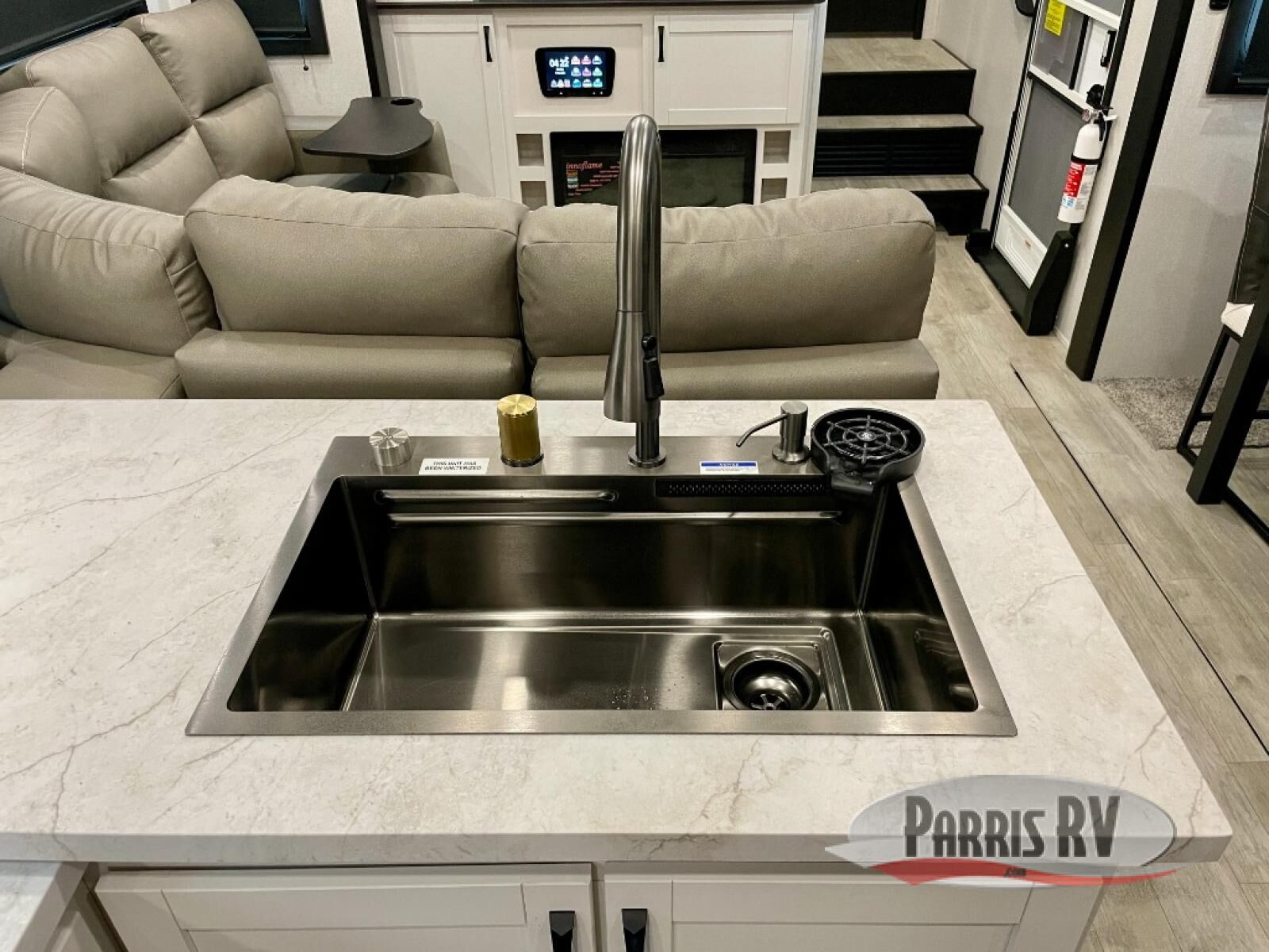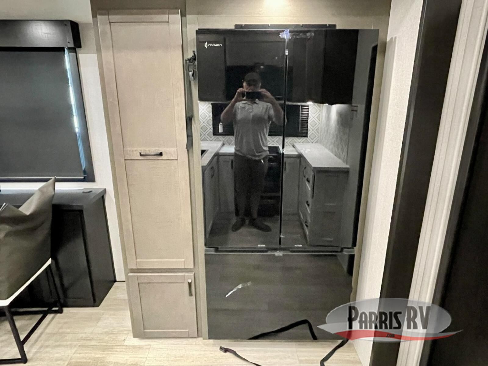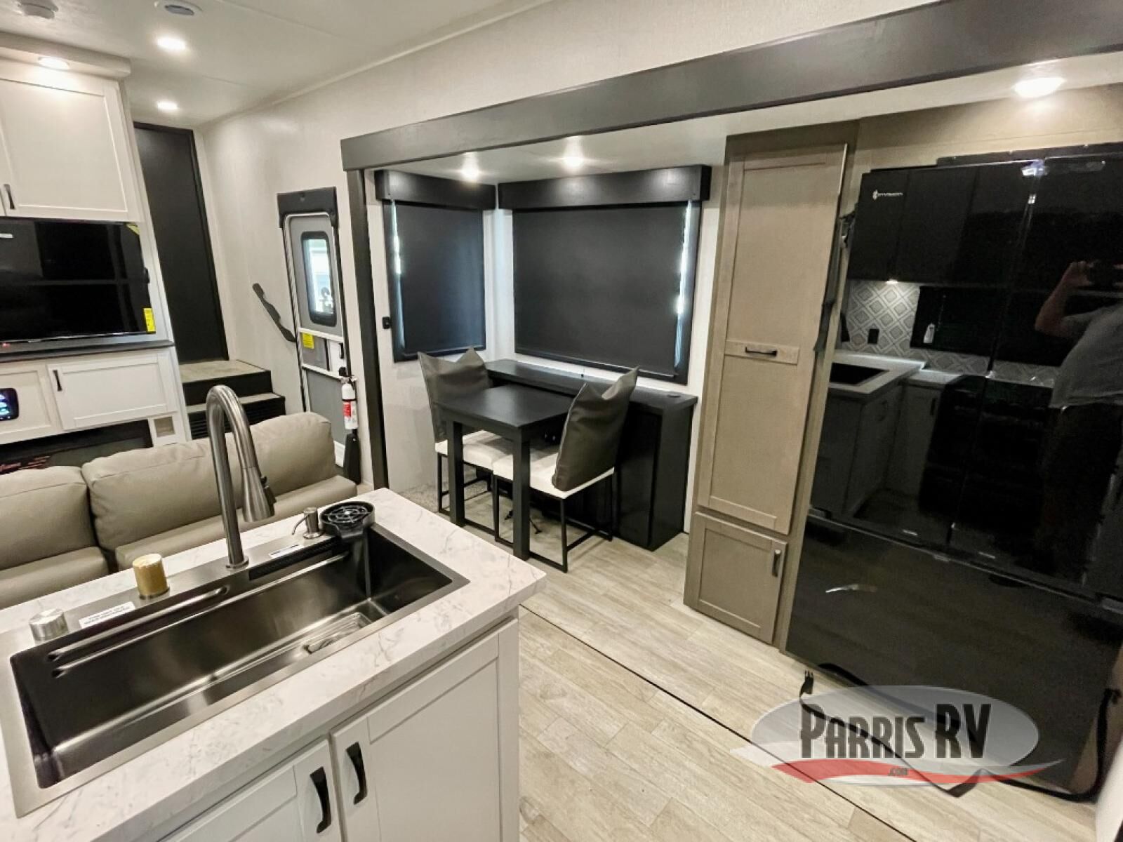 The 13' 6" garage is the perfect space for your toys, with enough room for your ATV, motorcycle, or other gear. Plus, the electric queen bed provides a comfortable spot to rest after a long day. The overhead loft with storage provides additional space for your gear, keeping it out of the way but still accessible. The kitchen is fully equipped with a microwave, sink, overhead cabinets, pantry, and coffee bar. The L-shaped sofa provides ample seating for relaxation, and the TV is perfectly positioned for viewing. The full bathroom is a welcome convenience, providing a private space to freshen up. Also, the front bedroom is a luxurious retreat, featuring a king bed, a walk-in closet, and drawers, and on the exterior, the two entry/exit doors provide easy access to the outside, making it perfect for loading and unloading your gear.