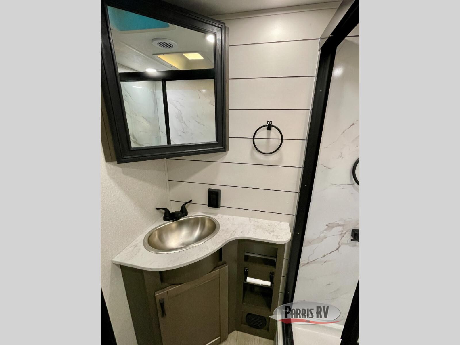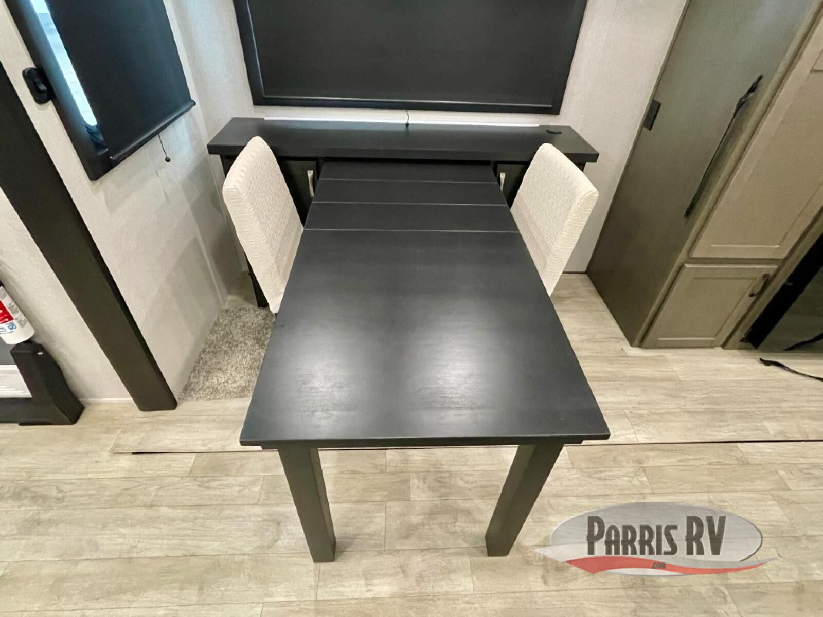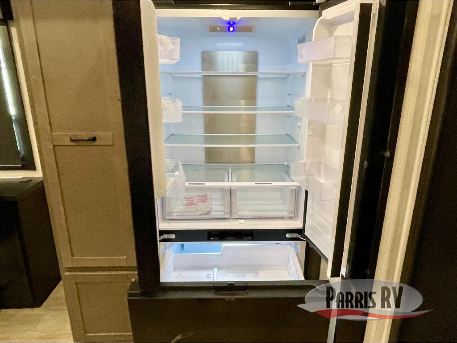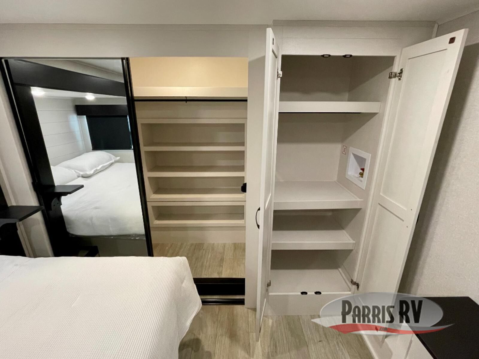 The 13' 6" garage is the perfect space for your toys, with enough room for your ATV, motorcycle, or other gear. Plus, the electric queen bed provides a comfortable spot to rest after a long day. The overhead loft with storage provides additional space for your gear, keeping it out of the way but still accessible. The kitchen is fully equipped with a microwave, sink, overhead cabinets, pantry, and coffee bar. The L-shaped sofa provides ample seating for relaxation, and the TV is perfectly positioned for viewing. The full bathroom is a welcome convenience, providing a private space to freshen up. Also, the front bedroom is a luxurious retreat, featuring a king bed, a walk-in closet, and drawers, and on the exterior, the two entry/exit doors provide easy access to the outside, making it perfect for loading and unloading your gear.