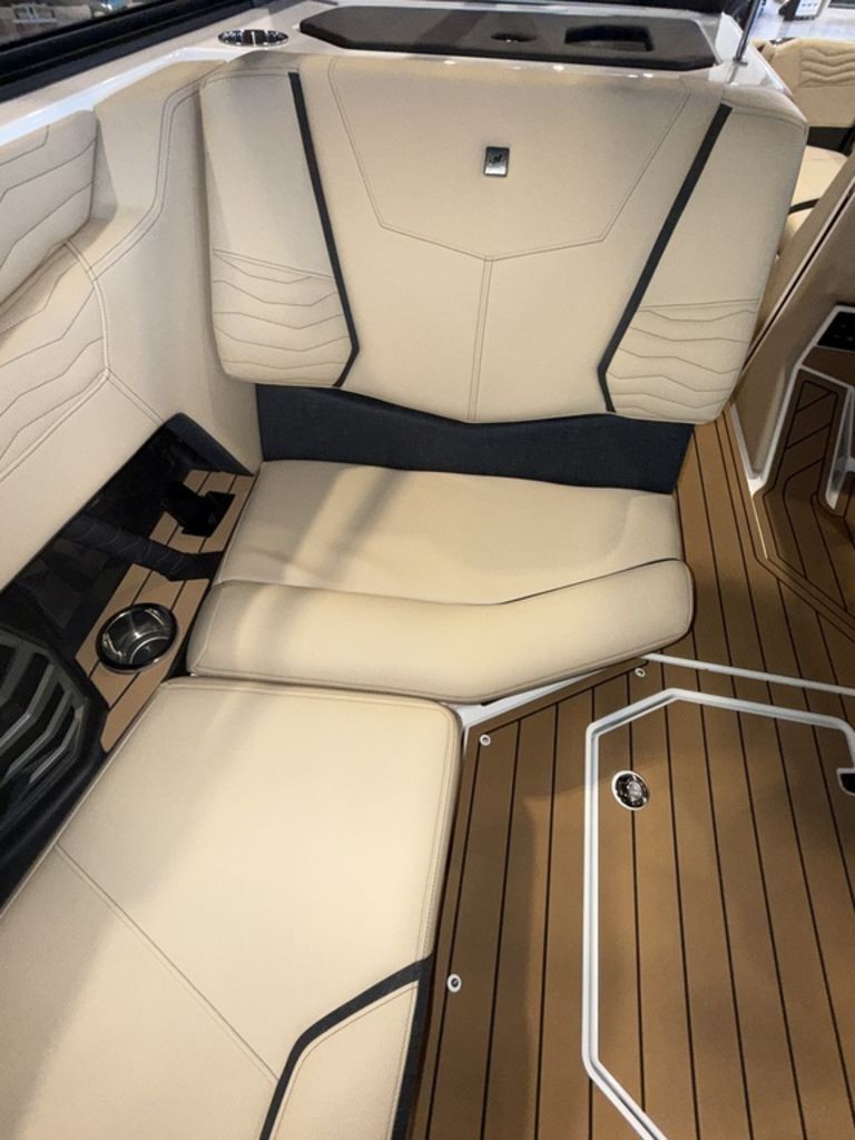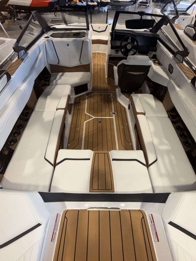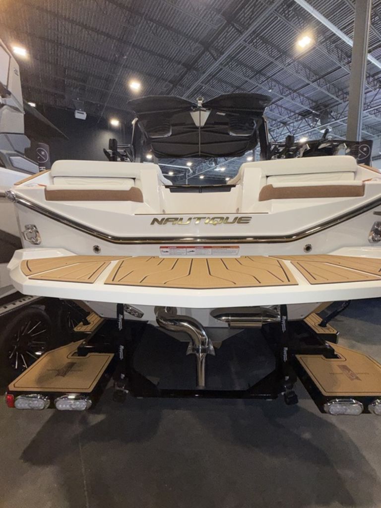 Options include: Telescoping tower, US Maps, Battery maintenance system, Cover and Platform cover, Air pump inflator, Supplemental ballast, Heat and defrost, Ladder, Underwater lighting, Nautique steer assist (thruster), Phender pro fender attachments, 1 set pillows, Surf select with surf switch, Wireless chargers, Actuated helm seat, Bow filler cushion, JL studio elite with wavefront stereo upgrade (2- 12" subs), Pocket door air dam, Jet black metal flake with white hull, Sahara sand and black accent interior and a custom triple axle Boatmate trailer on 18" rims. 2026 Nautique Super Air Nautique G23The Undisputed Boat of ChoiceFor over a decade, the G23 has been the most sought-after wake boat in the industry, with the credentials to back it up. This award-winning model is the undisputed boat of choice for professional riders looking to redefine what’s possible on the water but can also cater to beginners with its scalable wakes and waves that can be adjusted to each rider’s skill level. The performance-driven design of the G23 has been meticulously refined to be the pinnacle of excellence on the water, with an abundance of luxurious amenities for an unrivaled fit and finish.Features may include:PerformanceG23 HullThe Nautique engineering team revolutionized the industry with the introduction of the G-Series back in 2012, and they’ve continued to push the boundaries of world-class performance with the latest iteration of these legendary models. The G23’s running surface has been meticulously refined to produce the most clean, consistent, and fully customizable wakeboard wakes and wakesurf waves, offering an unparalleled experience for riders of every age and skill level.STERNReversible Stern SeatThe standard reversible stern seat aboard the G23 can slide out and flip up, so your crew can comfortably watch all the action from stadium-like seating. When it’s stowed away, it completes the lounge and includes a Nauteak Non-Skid covered step to step up and walk back to the transom.MidshipBimini with Surf PocketsProviding wide coverage from the elements, the bimini aboard the G23 is a welcome addition on those sunny days. Standard on the Telescoping Flight Control Tower, the G23 bimini includes integrated storage for two surfboards up top and mesh storage underneath for ropes and other watersports accessories.HelmLINC Panoray TouchscreenEffortlessly manage every aspect of your experience aboard the G23 with the 15” LINC Panoray touchscreen. With its large, high-definition display, this extremely intuitive interface allows you to easily control all your settings and custom configurations with the touch of a button. From ballast and lighting to wave shape and rider profiles, everything is right at your fingertips.Hull & BowHull DesignThe exterior design of the 2026 G23 embodies the legendary award-winning lineage of the Super Air Nautique G-Series. With the faceted hull sides, angular bow design and iconic Nautique visual signature, this striking 23-foot model leaves a lasting impression.