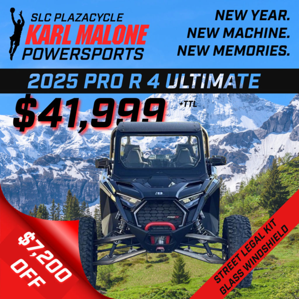 New 2025 Polaris RZR Pro R 4 Ultimate Side by Side UTV For Sale In Salt Lake City, UT This New 2025 Polaris RZR Pro R 4 Ultimate Side by Side UTV is for sale at Karl Malone Powersports SLC conveniently located in Salt Lake City, Utah. Our knowledgeable team is eager to assist you, so don’t hesitate to contact us Side by Side UTV you're looking for don't hesitate to go back and revise your search. We're sure to have the perfect Side by Side UTV for you in our showroom in Utah. We invite you to visit us at Utah’s premier Polaris dealer for new and pre-owned Side by Side UTVs for sale. Let us help you find the ideal Side by Side UTV to take home today! Karl Malone Powersports SLC Address: 1379 W 3300 S, Salt Lake City, UT 84119 Phone: (801) 972-8725 2025 Polaris RZR Pro R 4 Ultimate PRICE INCLUDES STREET LEGAL KIT, MIRRORS, AND GLASS WINDSHIELD. Champion of the Desert Unleash a force of nature with RZR Pro R, our most powerful RZR with race-proven durability. Features may include: A Bold New Design Show up and stand out with the bold new design of RZR Pro R–delivering more and style and performance to win it all. Refined Interior Winning starts from within, and RZR Pro R is no exception. Its interior is meticulously designed with more comfort and convenience, empowering you to ride farther, drive harder and finish in first place. PERFORMANCE Out-thrill them all with an off-road beast designed to dominate. RZR Pro R delivers heart-pounding performance with race-proven components to defy deserts and conquer dunes. Game-Changing Technology Take your ride up a notch with off-road optimized tech. From advanced connectivity to groundbreaking sound, the RZR Pro R features cutting-edge tech to unlock more potential off road. NEW! Fresh Cabin Air Intakes NEW! Animated RZR Fang Accent Lighting NEW! Rockford Fosgate® Stage 4 Audio NEW! Color Matched 5-Lug Beadlock Wheels NEW! Pro Climate Heat & Vent seats NEW! Front Painted Fascia NEW! Painted Center Hood DYNAMIX DV with 4 Selectable Ride Modes FOX 3.0 Live Valve X2 Internal Bypass Shocks RIDE COMMAND Off-Road Mapping Integrated into a 7" Display Vehicle Telemetry Data with RIDE COMMAND+ Rear Camera Telescoping Steering Wheel & Button Controls Aluminum Roof Retractable 6-pt Harness