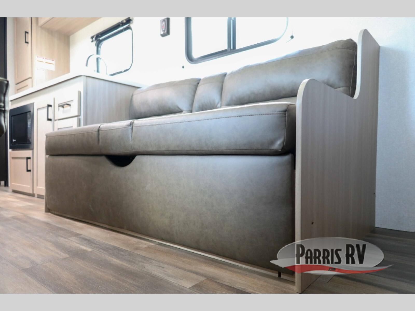 If you enjoy camping with a larger group, this travel trailer is perfect for you! There are double-size bunks in the back, which are right next to the private bath with a toilet and 40" shower. You can take the front queen bed with dual wardrobes, and any other guests can convert the sofa and booth dinette to sleeping space. A two-burner cooktop will let you make breakfast for everyone in the morning, and a 12V refrigerator will keep your perishables fresh!