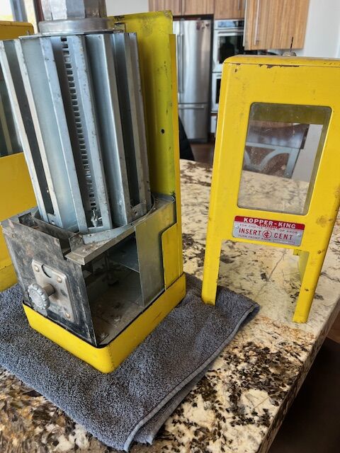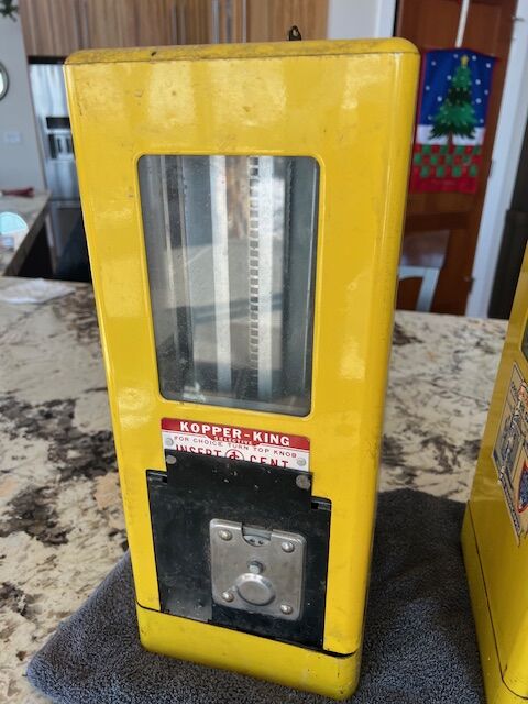 We found another machine for sale on-line that contains more details about these machines. We don't guarantee the accuracy. However, we felt we would share the information: "this is a Vintage KOPPER KING 1 Cent Counter Top Vending Machine. The machine has 8 selections to choose from and you rotate the selections by a large turn knob at the top..The slots are for small bite size candy bars or bubble gum Flat squares like Double Bubble or Bazooka. Chicklets Gum 2 pack will also fit as well...Has 3 Viewing glass windows located front and sides...It measures 17 1/2" tall x 7 1/4' x 7 1/2".