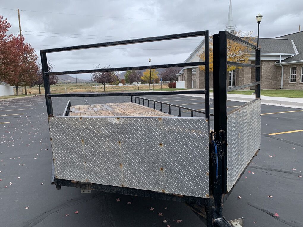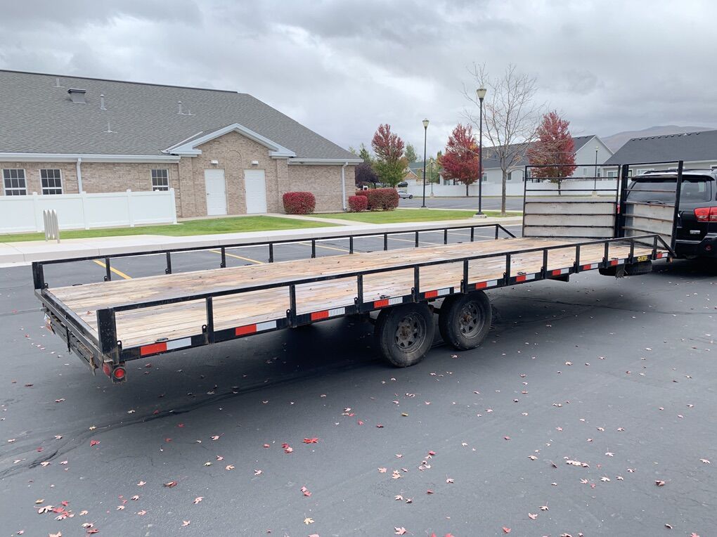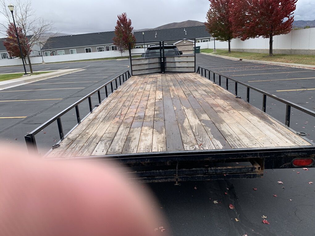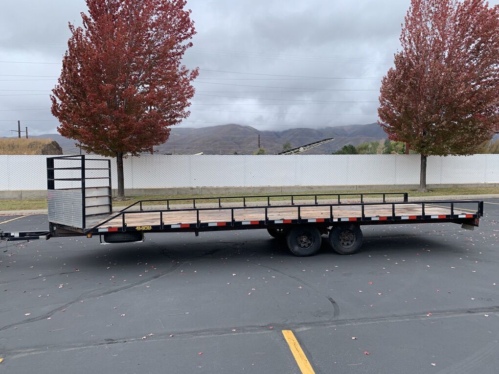Venmo2022 Big Bubba trailer for sale. 20’x8’ wooden deck. 3’ triangle and 3.5’ tongue. Has custom slide in spare tire holders with matching spare tires. D rings around the outside of frame and in the wood deck. Will easily hold 4 snowmobiles with room to fit 5 or two side by sides. Deck in good shape. All lights work. Both front pull offs open easily. Ramp fits under trailer. Title in hand. Text or call 435-503-2903 NO TRADES