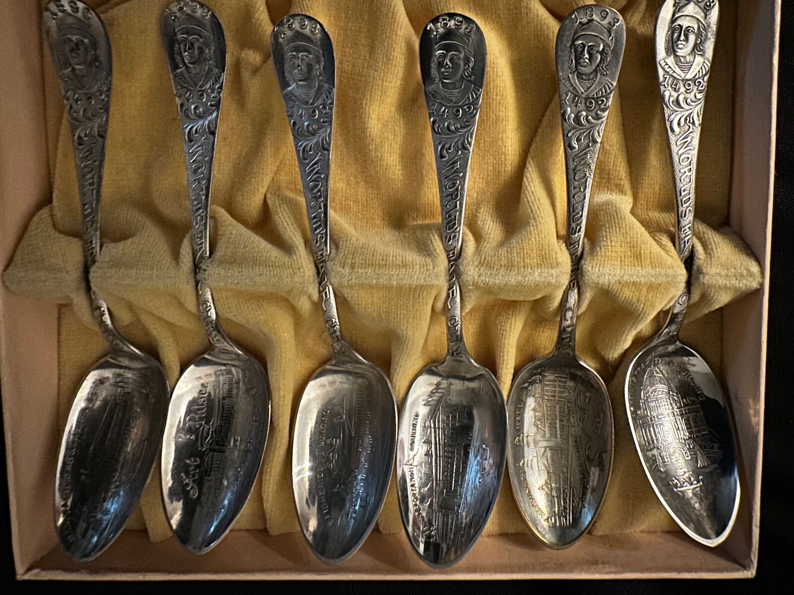 Going through items that I had collected from my Grandma's estate & found these, still in the original box. Each spoo has the different builings of the Chicago Worlds Fair, The Administration Building, Machinery Hall, Transportation Bldg, Fisheries Bldg, Art Palace, & Manufacturer's & liberal arts, in the bowls of the spoons. Standard is stamped on the back. Asking $125.00 OB0 CASH ONLY - NO VENMO