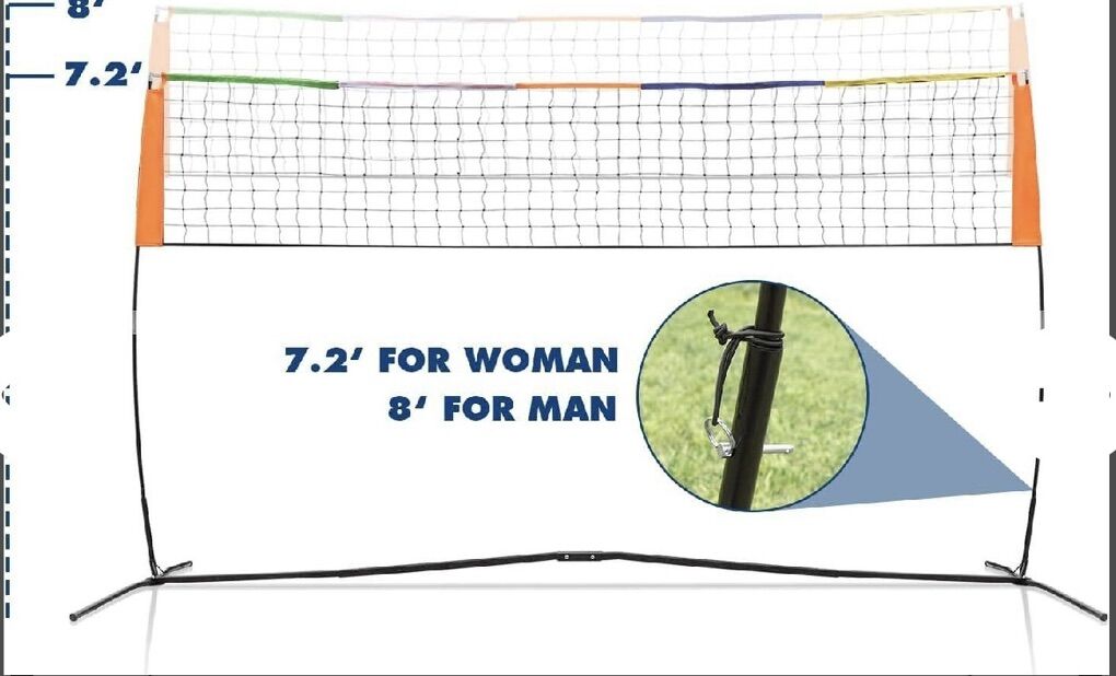 HEIGHT ADJUSTABLE Easily adjust the net height from 8 ft for men's regulation height, and 7 ft 2 in height for woman to accommodate all heights and skill levels by a pull ring. Great for both male and female players and leagues of all abilities. UNIQUE ZONE SYSTEM Comes with zone system that makes our volleyball net an ideal equipment for volleyball training. Colored canvas sleeve that secures to top of the volleyball net with Velcro strip to clearly indicate net zones 1 through 4, brightly colored sleeve segments are easily visible on both sides of net, perfect for practicing volleyball setting, blocking, hitting or serving drills. ROBUST CONSTRUCTION - Made from powder-coated steel, premium netting and fiberglass poles, the net withstands countless hits and resists tipping over. Taking advantage of 420D PU coating knotless polyester net and 600D seams, our net survives the abuse of the hardest shots season after season. TRAINING ANYWHERE Our net can be used indoors or outdoors without worry. The frame has extra long support legs for added stability on the floor and ground pegs for outdoor using, while another 6 sandbags for ultra stability. Detach the barrier net and return piece to become a recreation width net for pickup or backyard games net in less than 3 minutes. INSTANT SETUP - Freestanding design assembles in minutes and requires no support ropes or any tools and can be used on grass, sand, gym floors, concrete and more; Includes carrying case for travel and storage.