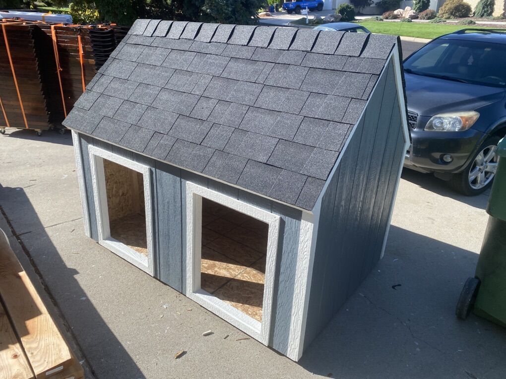Wooden goat house .sturdy built, comes complete with paint ,,trim and asphalt shingles. 6 feet long 4 feet wide 5 feet high
