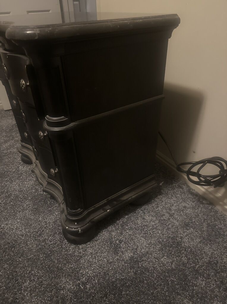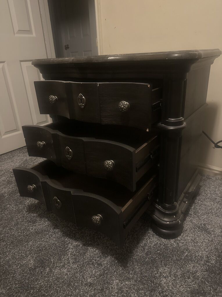VenmoThis is a very high quality expensive piece of furniture. It has three drawers. It can be used as an end table or small dresser. The top drawer has an outlet inside of it to charge devices. The top is granite. It’s dusty but in excellent condition. A few small chips and marks that could be touched up. It is extremely heavy and will need to be carried up one flight of stairs. It’s espresso, almost black.