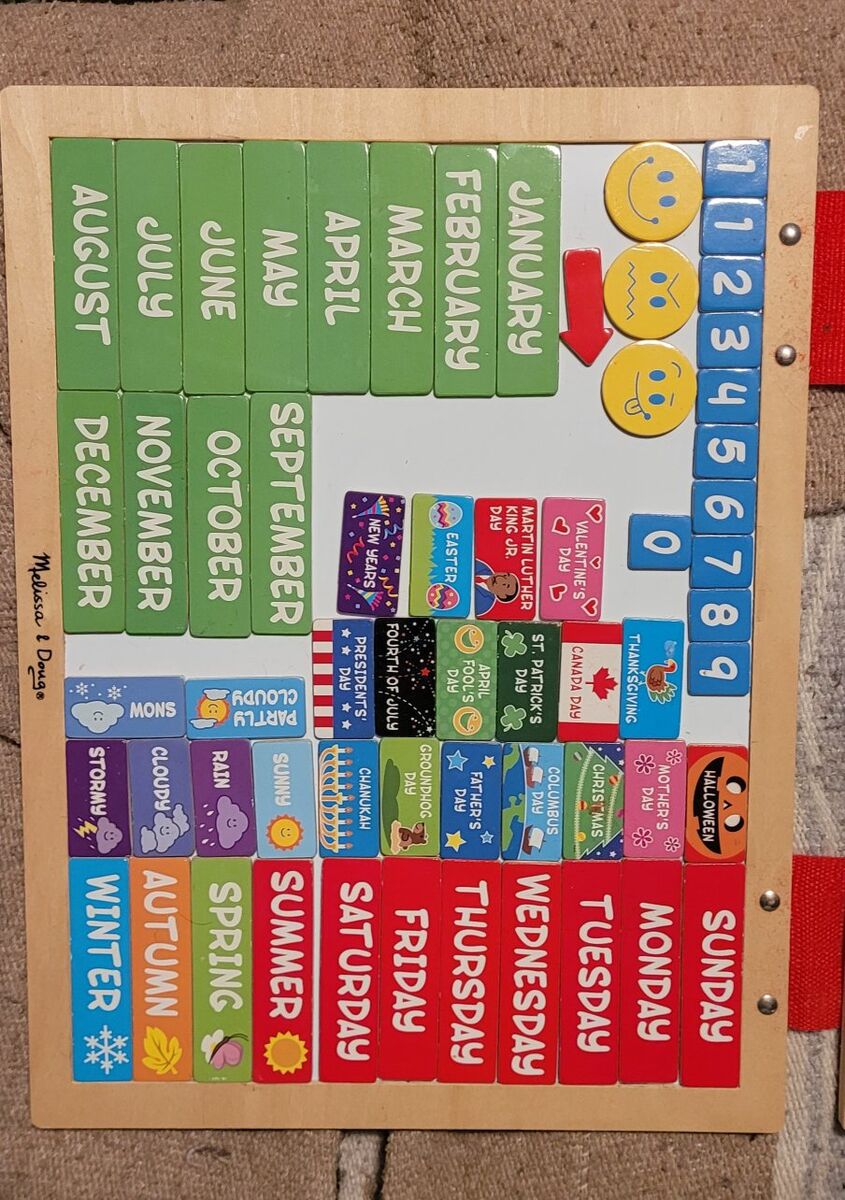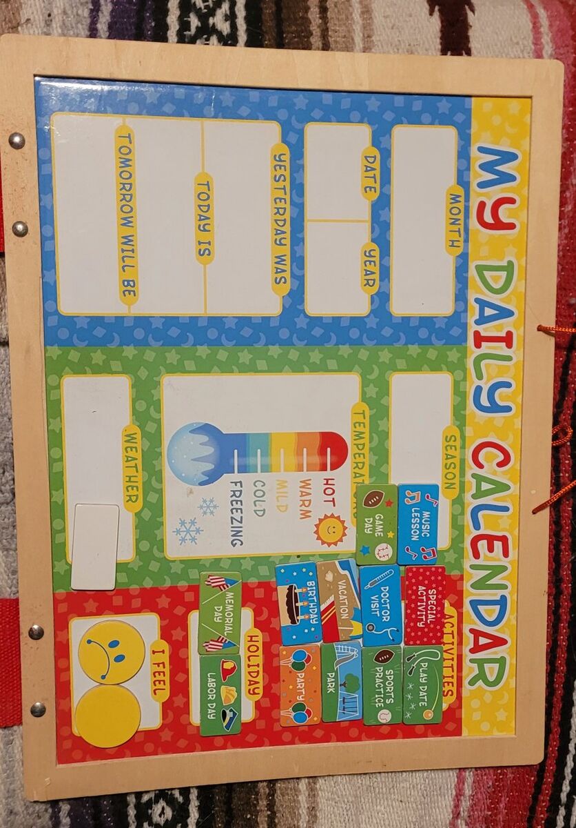 VenmoIn excellent condition! Great calendar for kids. All pieces there except I think Im missing a "2" for the day and the years I had are old so you will just have to write that in. All other pieces are there. See link for more info: https://www.melissaanddoug.com/products/my-magnetic-daily-calendar?variant=40109176127542&gclsrc=aw.ds&gad_source=1&gad_campaignid=21802289665&gbraid=0AAAAA949c4ypBFFe9lz9iBGBx2e3lXqJr&gclid=CjwKCAjwi4PHBhA-EiwAnjTHuV3E9K0XkH-40MWKEjUvTRItWVlYMIwuhPNx4ghK77qwZGx4J1eopxoCG64QAvD_BwE