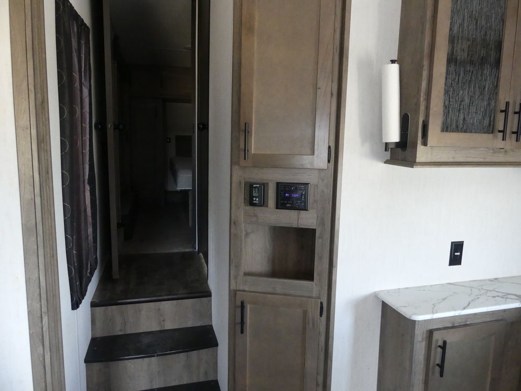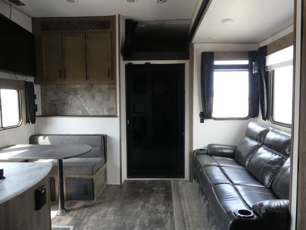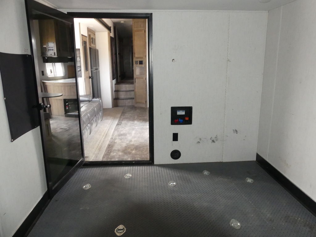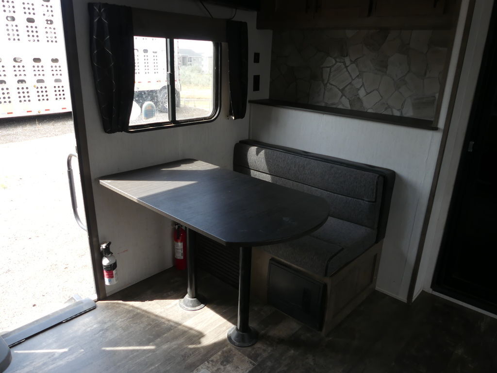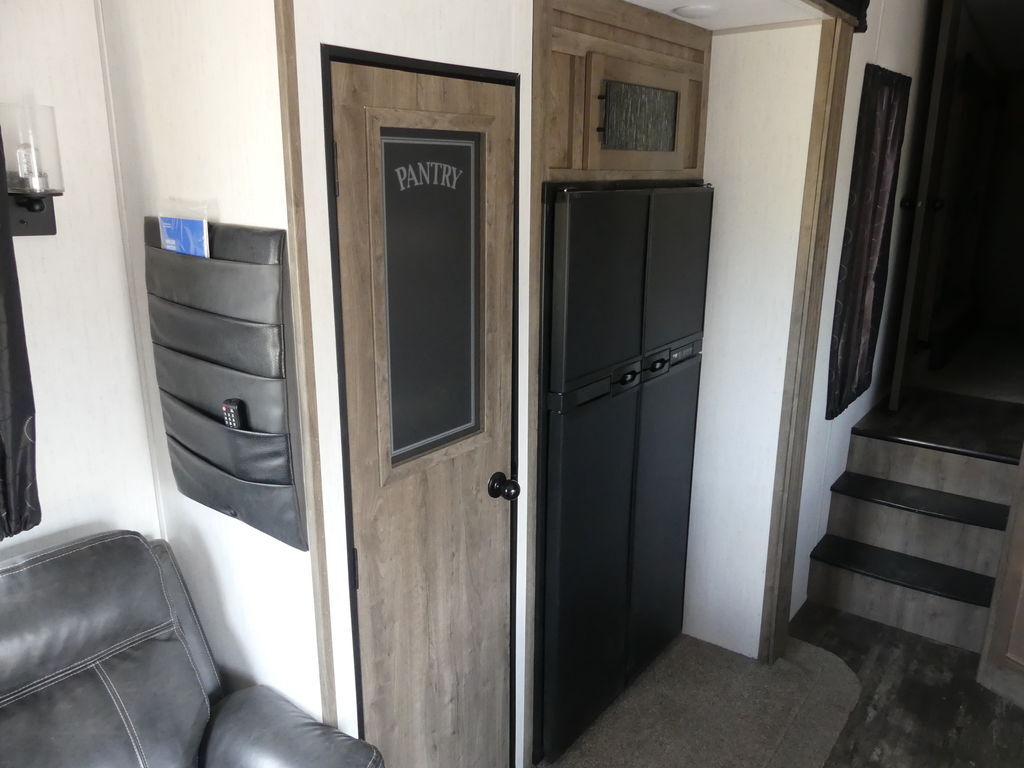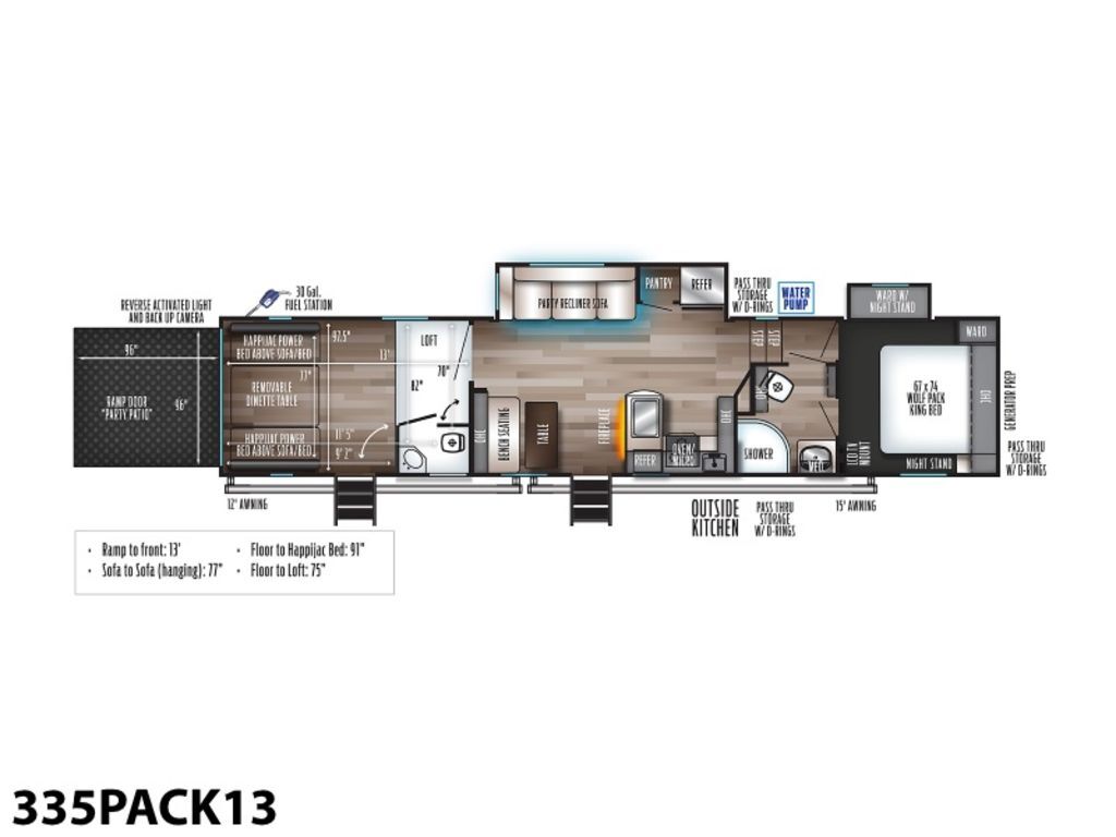 The 335PACK13 is the perfect blend of beauty and functionality! You'll love the designer touches, like faux rock accents and dramatic LED lighting, while the 13' garage is ready for hauling. You'll enjoy the large king bedroom with separate full bath entrance door while the kids sleep in the loft. A bench dinette and pantry complete the indoor kitchen, with additional space and dining table in the garage—which also includes a half bath!