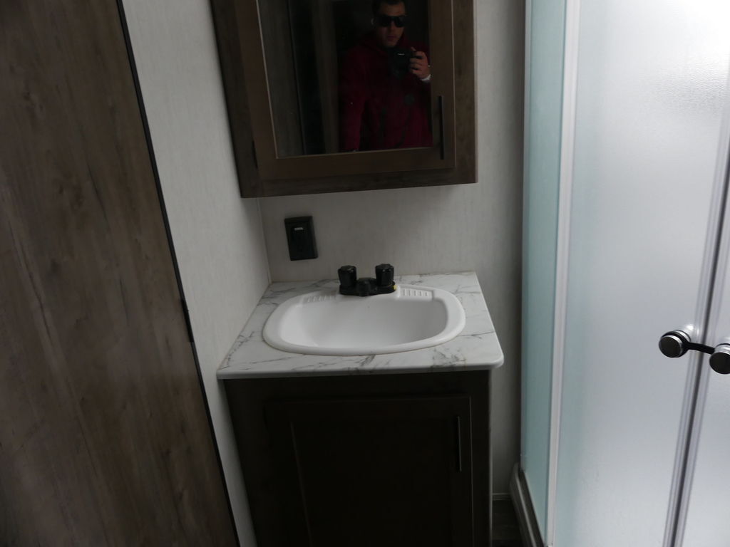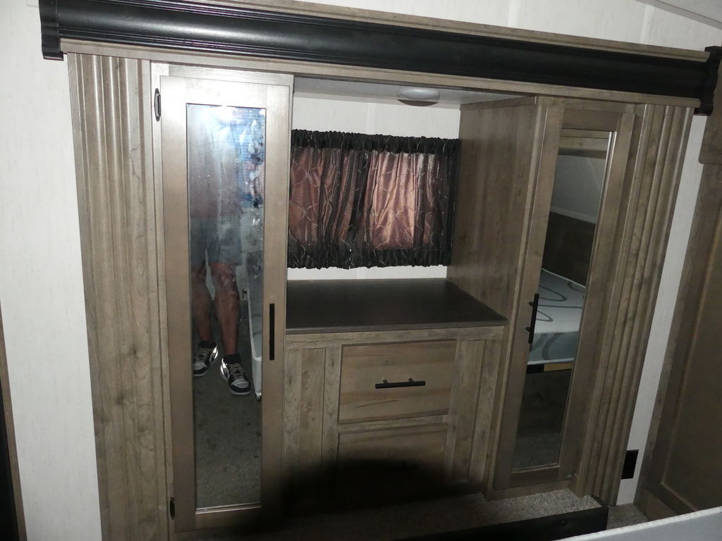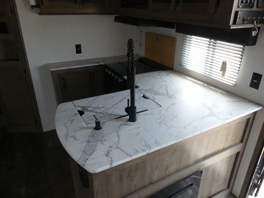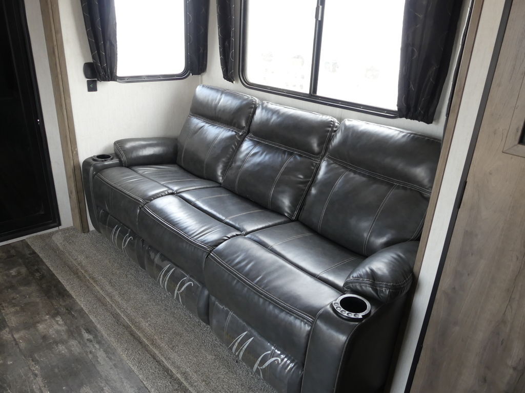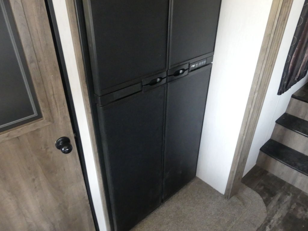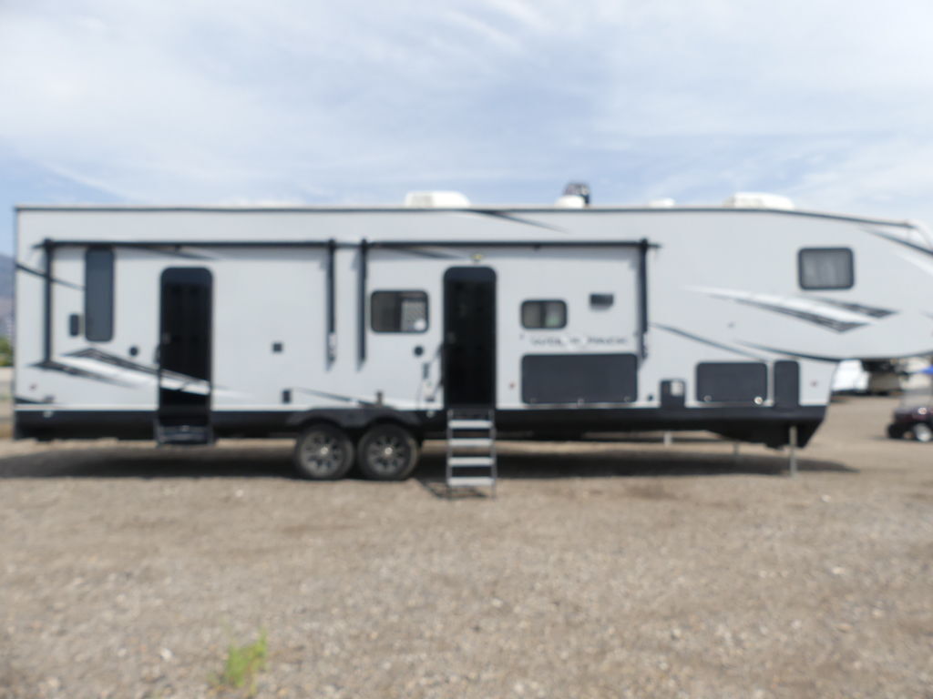 The 335PACK13 is the perfect blend of beauty and functionality! You'll love the designer touches, like faux rock accents and dramatic LED lighting, while the 13' garage is ready for hauling. You'll enjoy the large king bedroom with separate full bath entrance door while the kids sleep in the loft. A bench dinette and pantry complete the indoor kitchen, with additional space and dining table in the garage—which also includes a half bath!