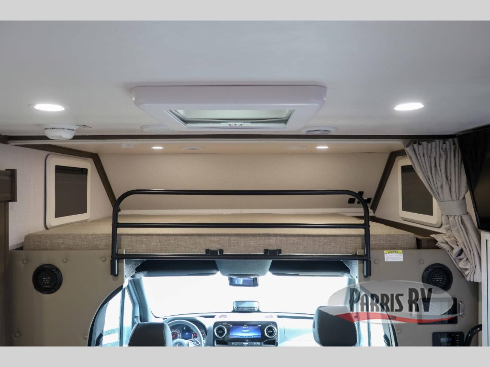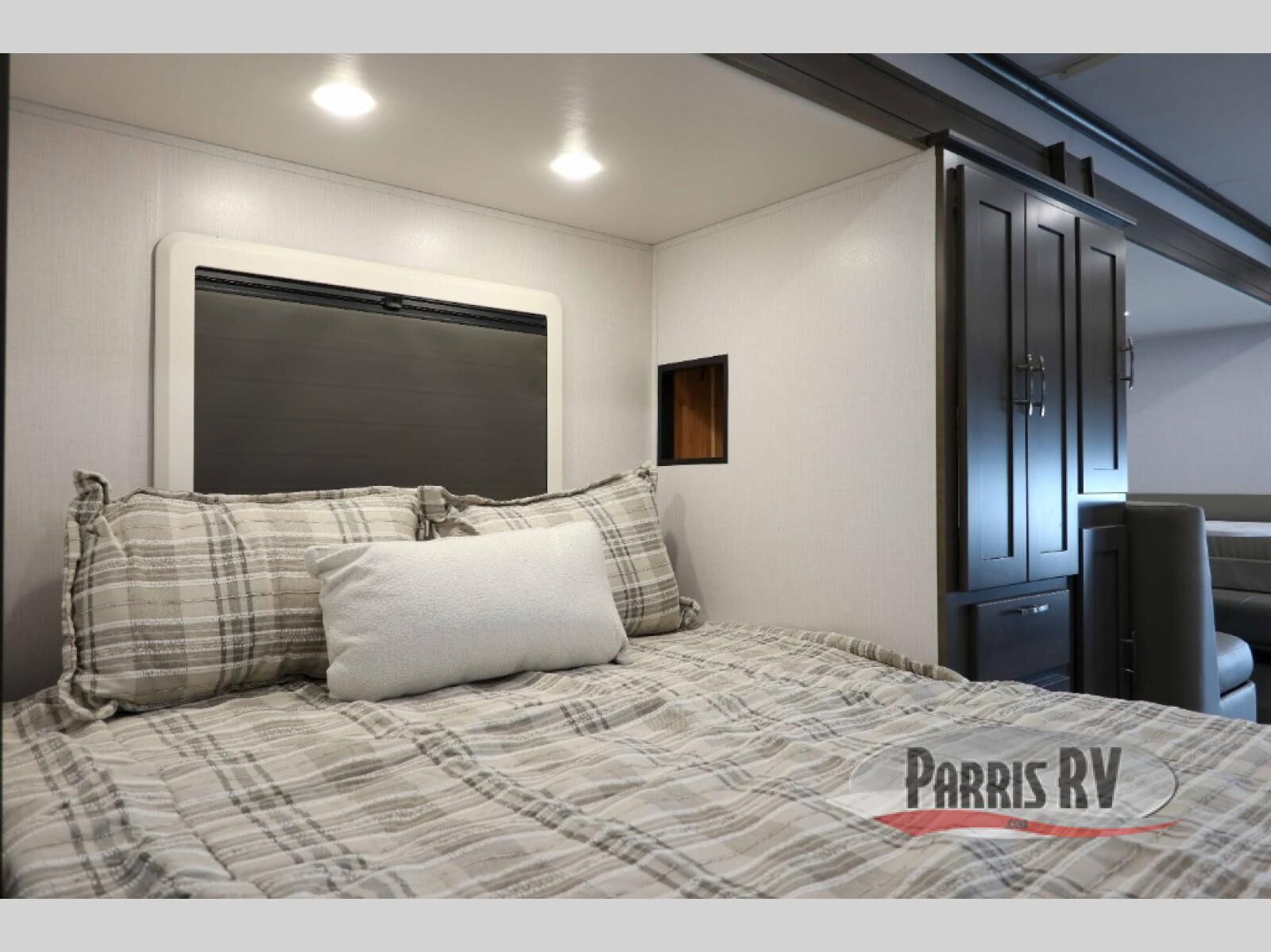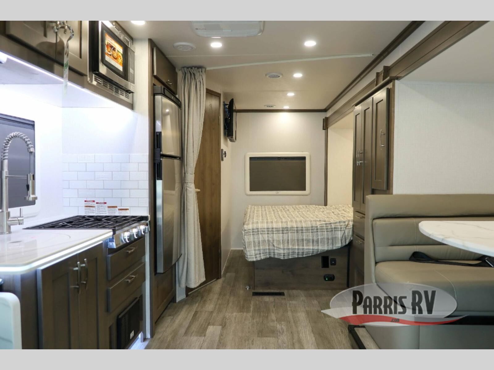 Take this motorhome on your greatest adventures yet! Start each morning feeling well rested after sleeping on the corner queen bed then head to the rear corner bathroom to freshen up in the shower with an Oxygenics body spa RV shower head and a skylight above for added headroom and natural lighting. Now that you're ready for the day, you can grab some eggs from the 8 cu. ft. two-door compressor-driven refrigerator and fry them up on the three burner cooktop, then enjoy them at the booth dinette. The kitchen also has a countertop extension for more meal prepping space and a convection microwave. This unit also includes a living room 32" LED Smart TV and a 32" LED smart TV across from the bed. You could even switch things up by replacing the booth dinette with an optional 3-seat power recliner, and adding a cab over bunk option!