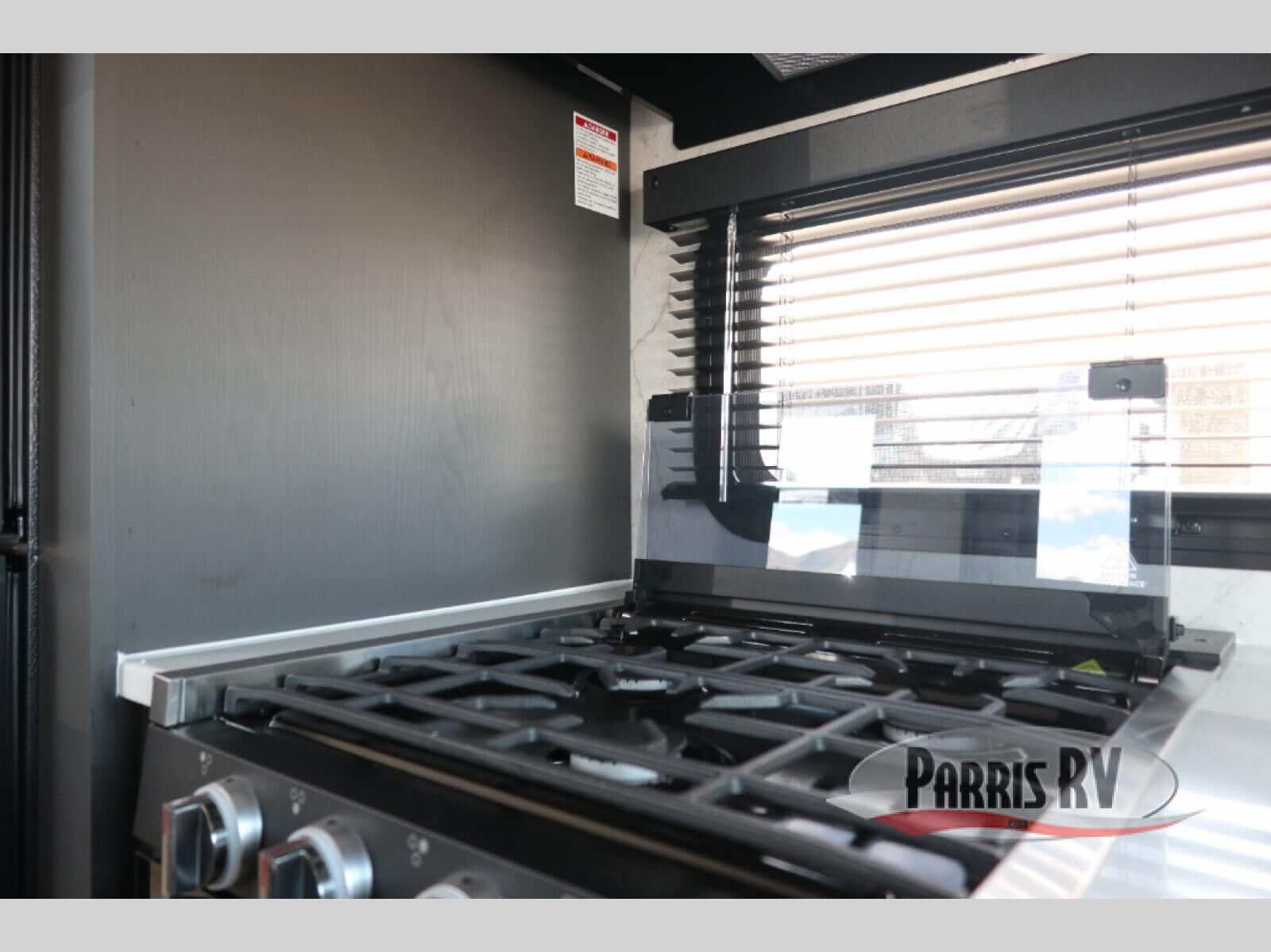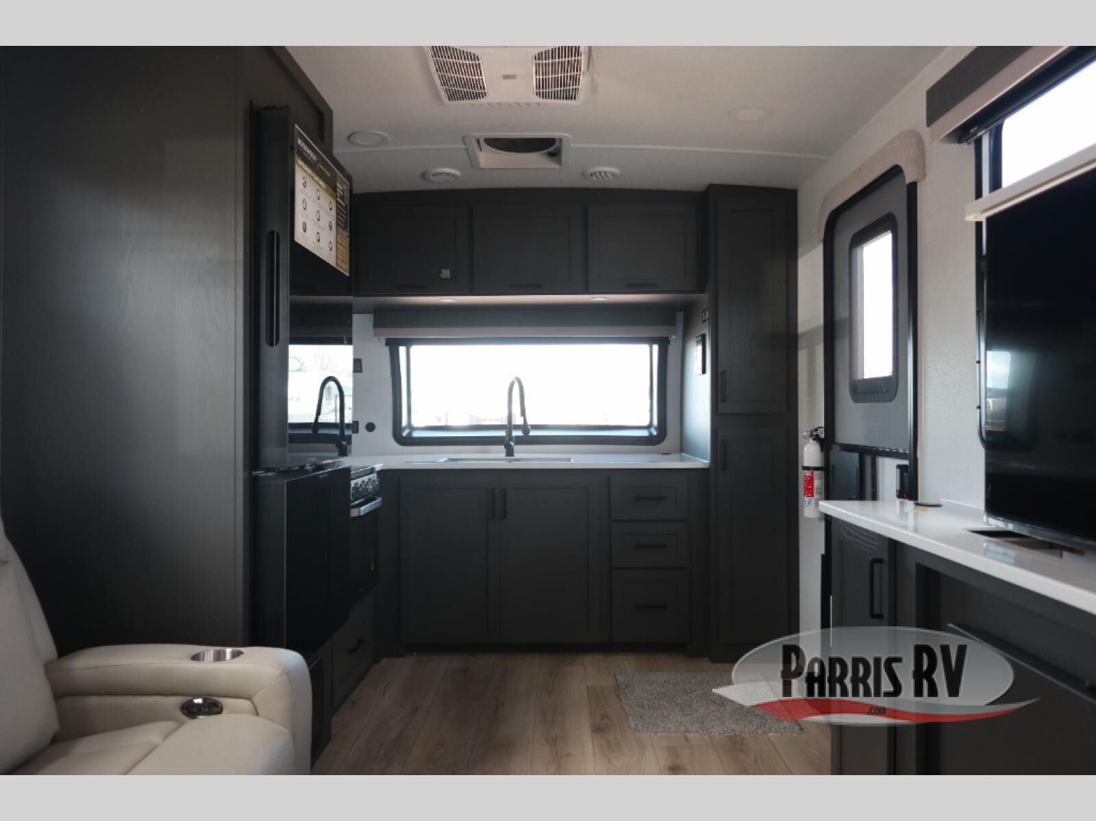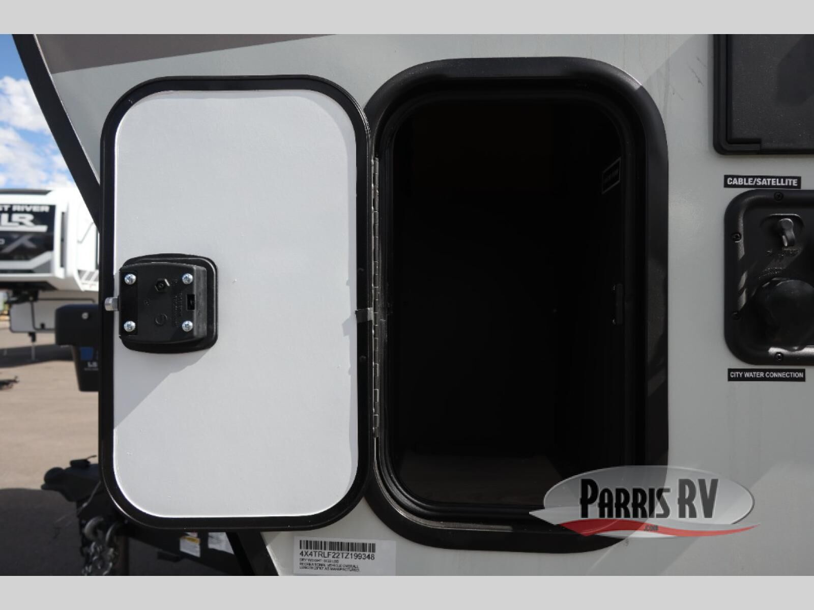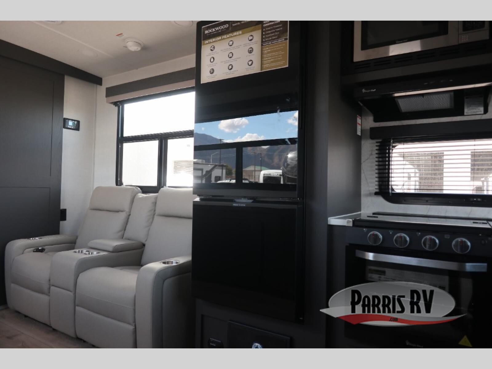 This Rockwood Ultra Lite 301FKT is fit for a cook! As soon as you step inside, you're greeted by the spacious front kitchen. Designed for convenience and style, it has long solid surface countertops that provide ample space for meal prep and organizing utensils. The overhead cabinets offer plenty of room to store dishes and ingredients for all your favorite recipes. After cooking, you can unwind on the 67" theater seat facing a TV with a lift, perfect for movie nights or catching up on your favorite shows. For meals, enjoy dining at the flip-up table with folding chairs, ideal for sharing breakfast, lunch, or dinner with your partner. And when it's time to relax, a full bathroom leads to the rear bedroom, where a king-sized bed awaits to give you a restful night's sleep.