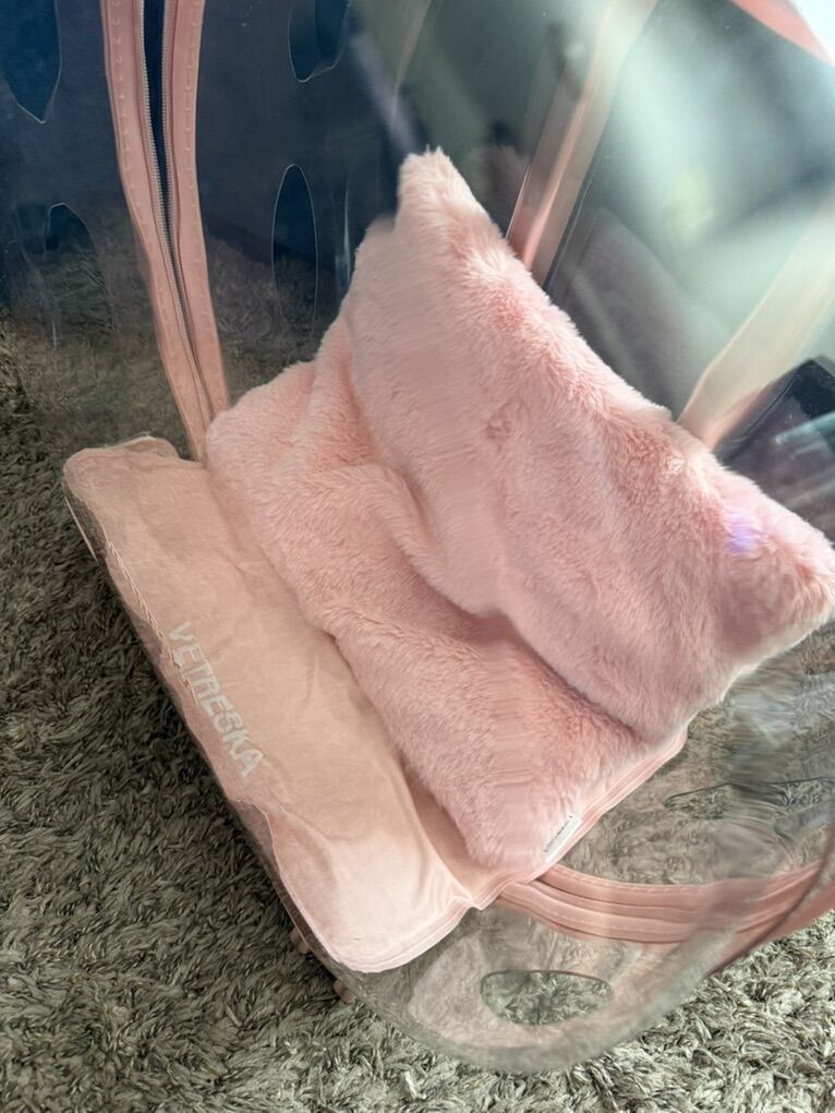 ApplePayVetreska Bubble Pet Carrier Pink & Transparent with cool, fuzzy 2 pillows, bike basket, cooling mat