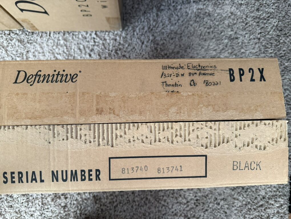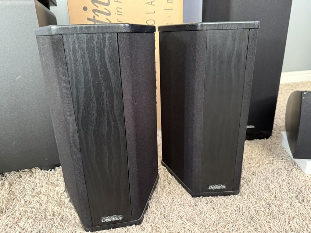 The Definitive Technology speakers quality speak for their own with their made in USA top of line reputation. Solid setup ready to go and complete with boxes. I have some high quality speaker wires I can also throw in. Priced to sell! Look up the items on internet for details. This setup can easily be connected to a TV via an optical cable. Package includes: