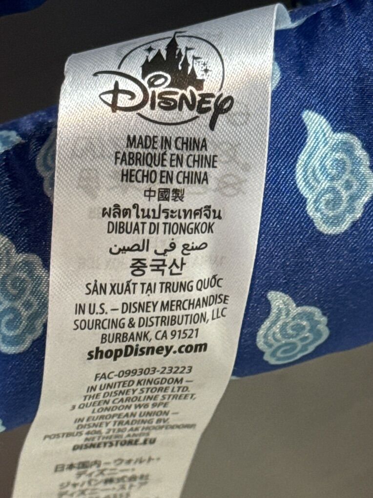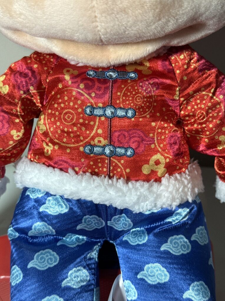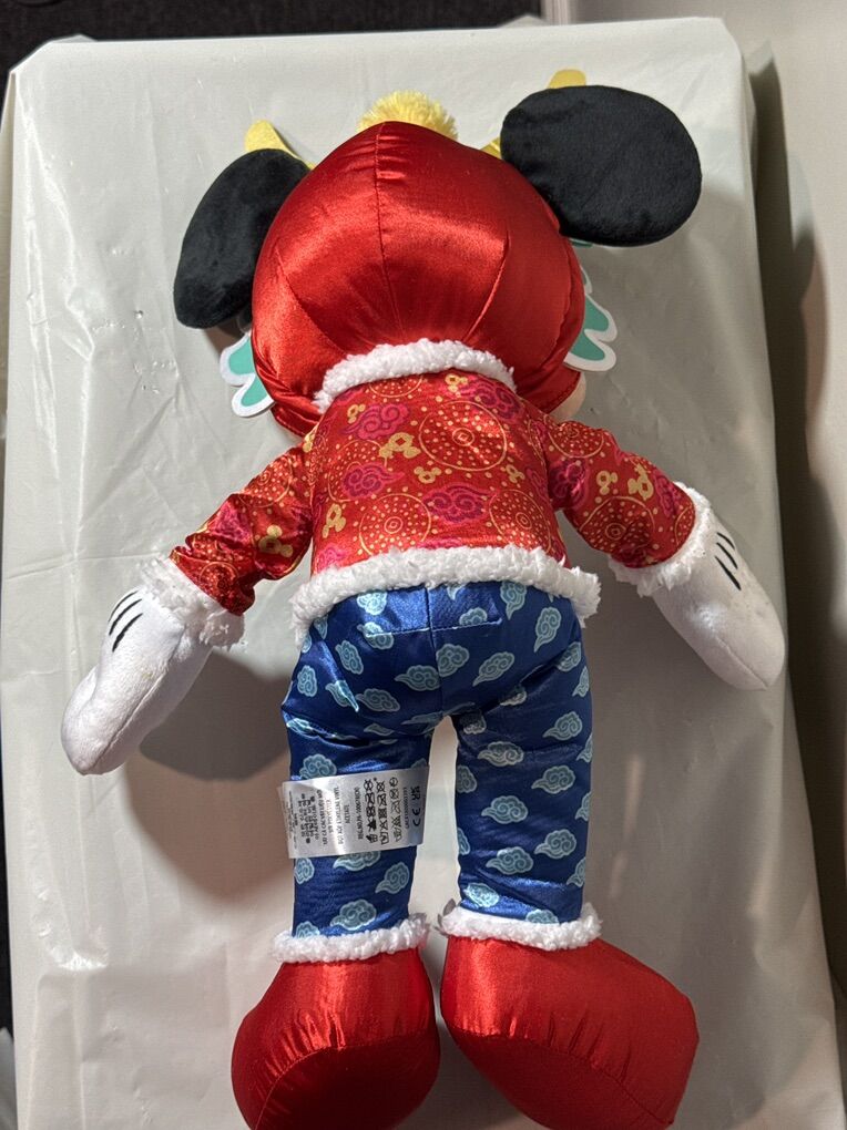 This plush celebrates the Year of the Dragon. Mickey is dressed in a festive Lunar New Year outfit with a headdress, detailed sculpting, embroidered features, and satin print fabrics.